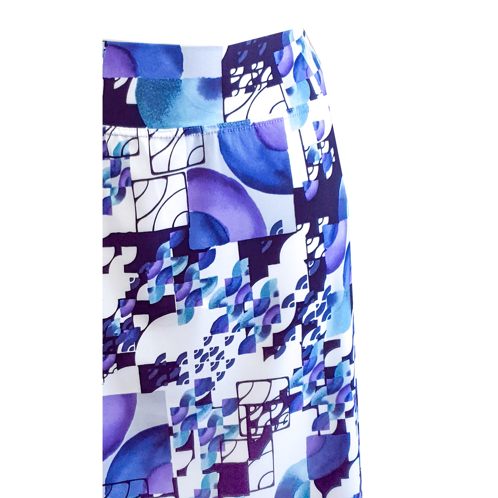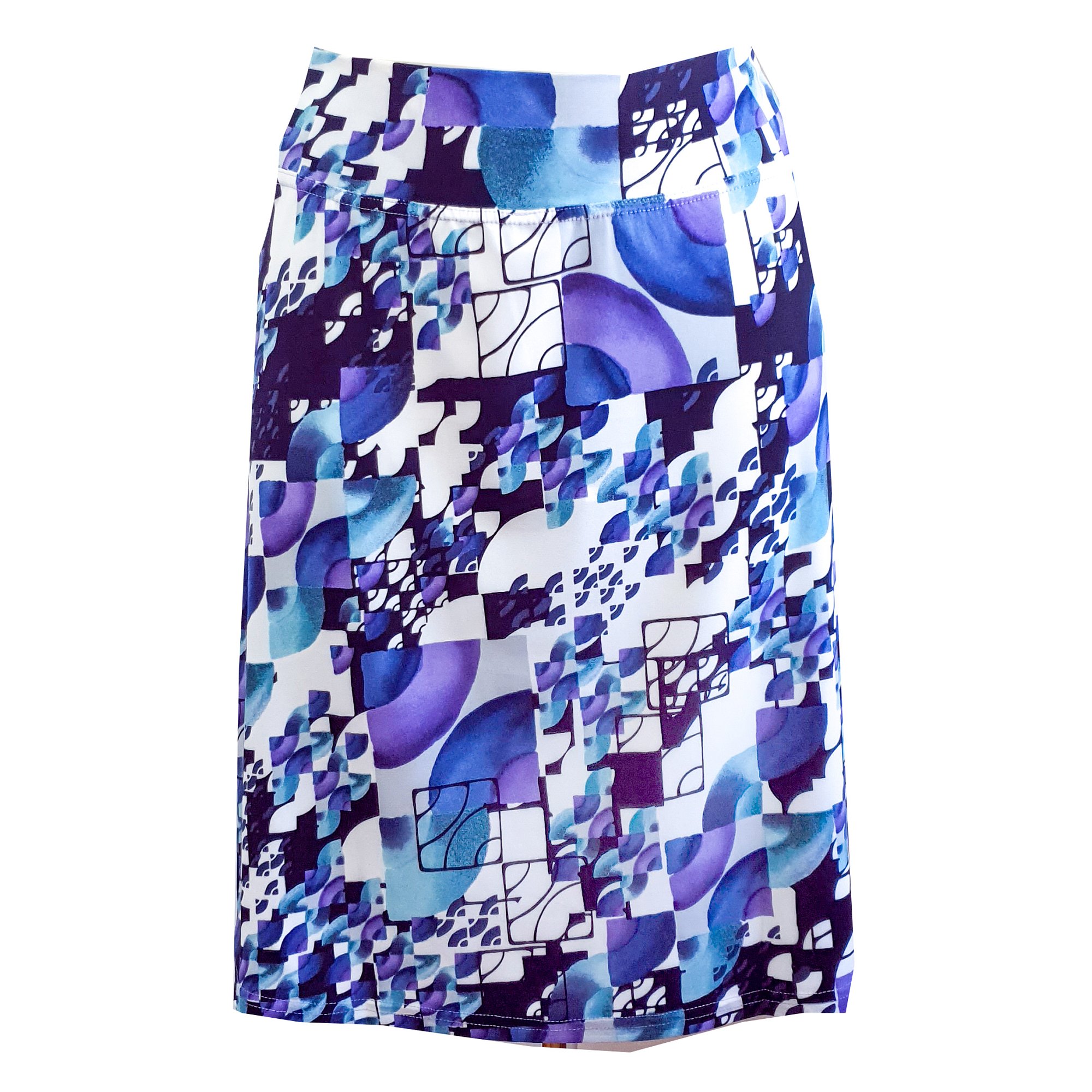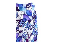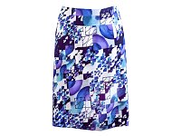 Krátká slabá sukně bílé barvy střižená do A s modro fialovým tiskem. Elastická pasovka. Délka 54 cm. Údržba - praní na 30° v pračce. Materiál: 95% polyester 5% elastan