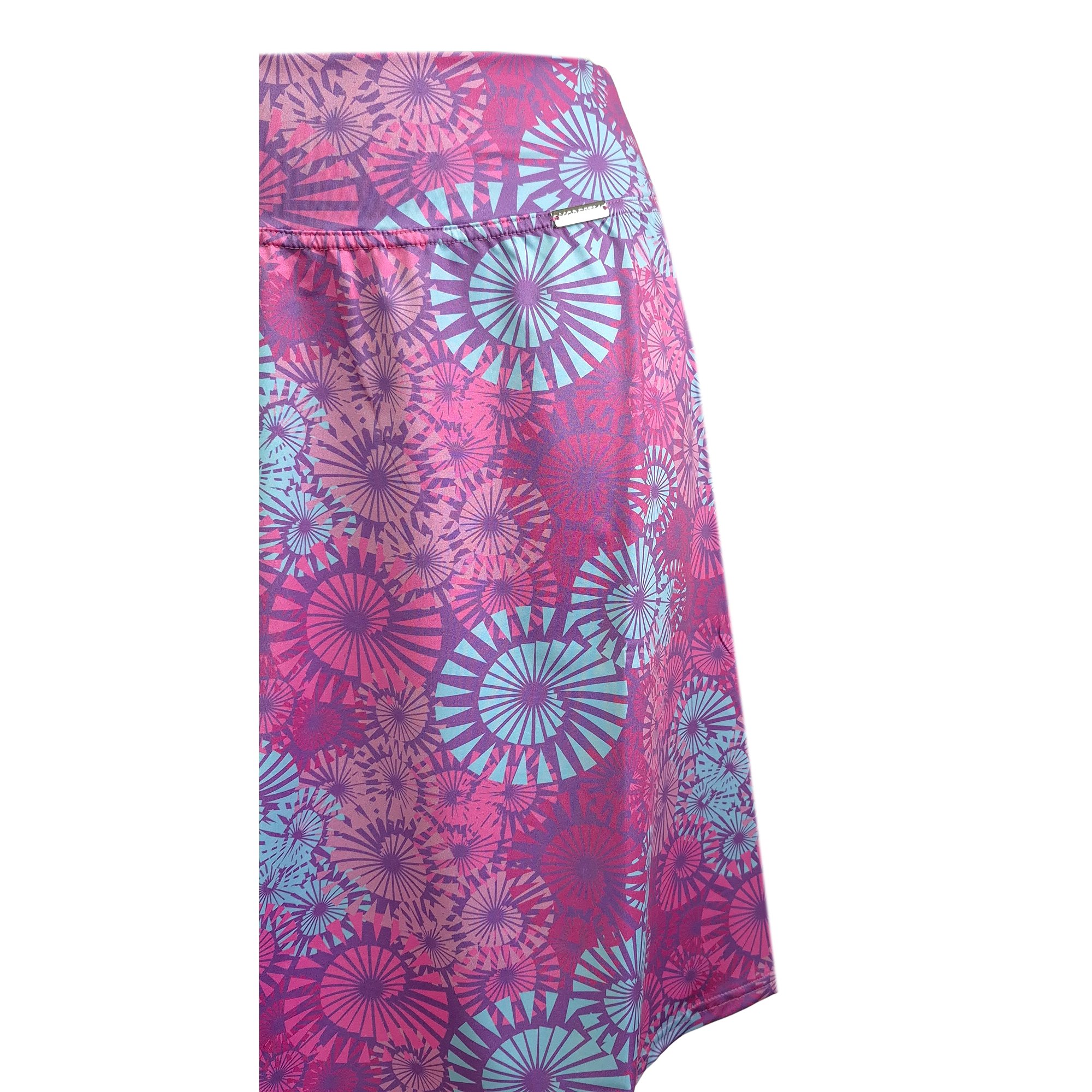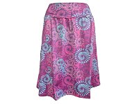 Krátká letní sukně střižená do A v růžové barvě s abstraktním vzorem. Elastická pasovka. Délka 54 cm. Údržba - praní na 30° v pračce. Materiál 96% polyester 4% elastan.