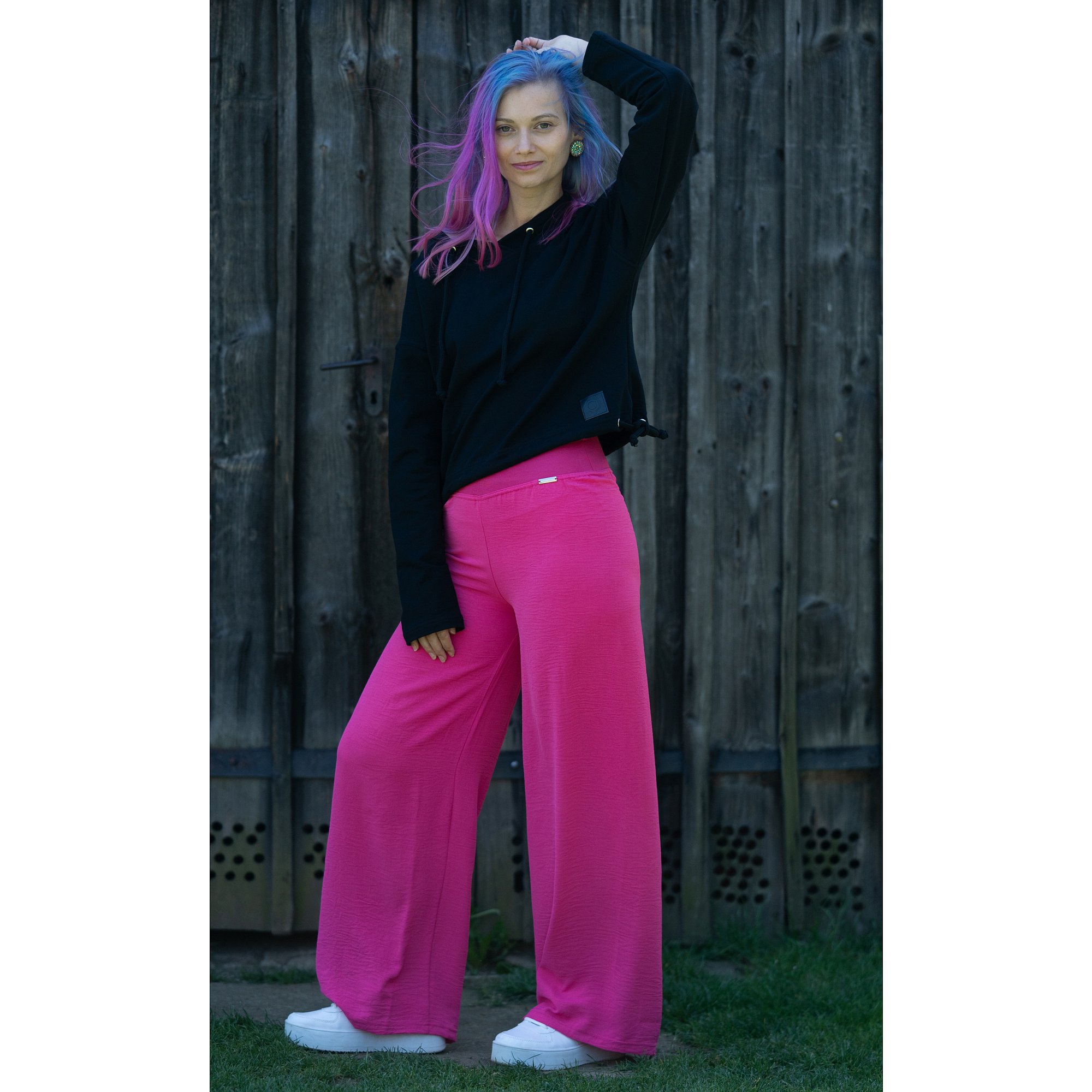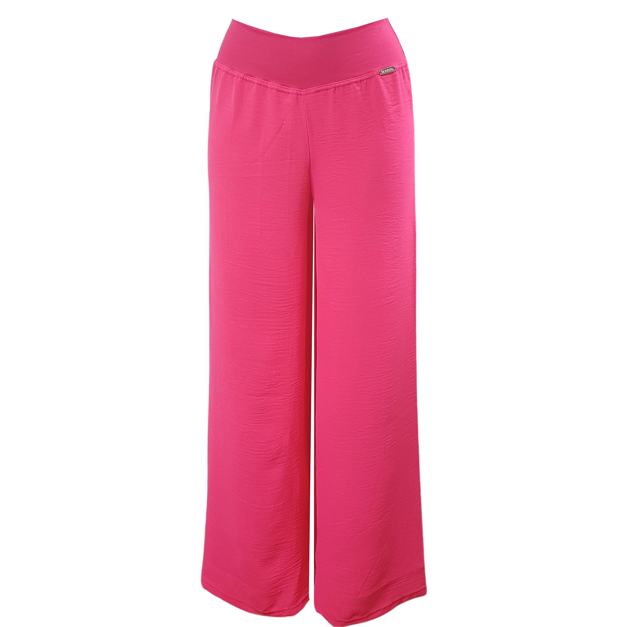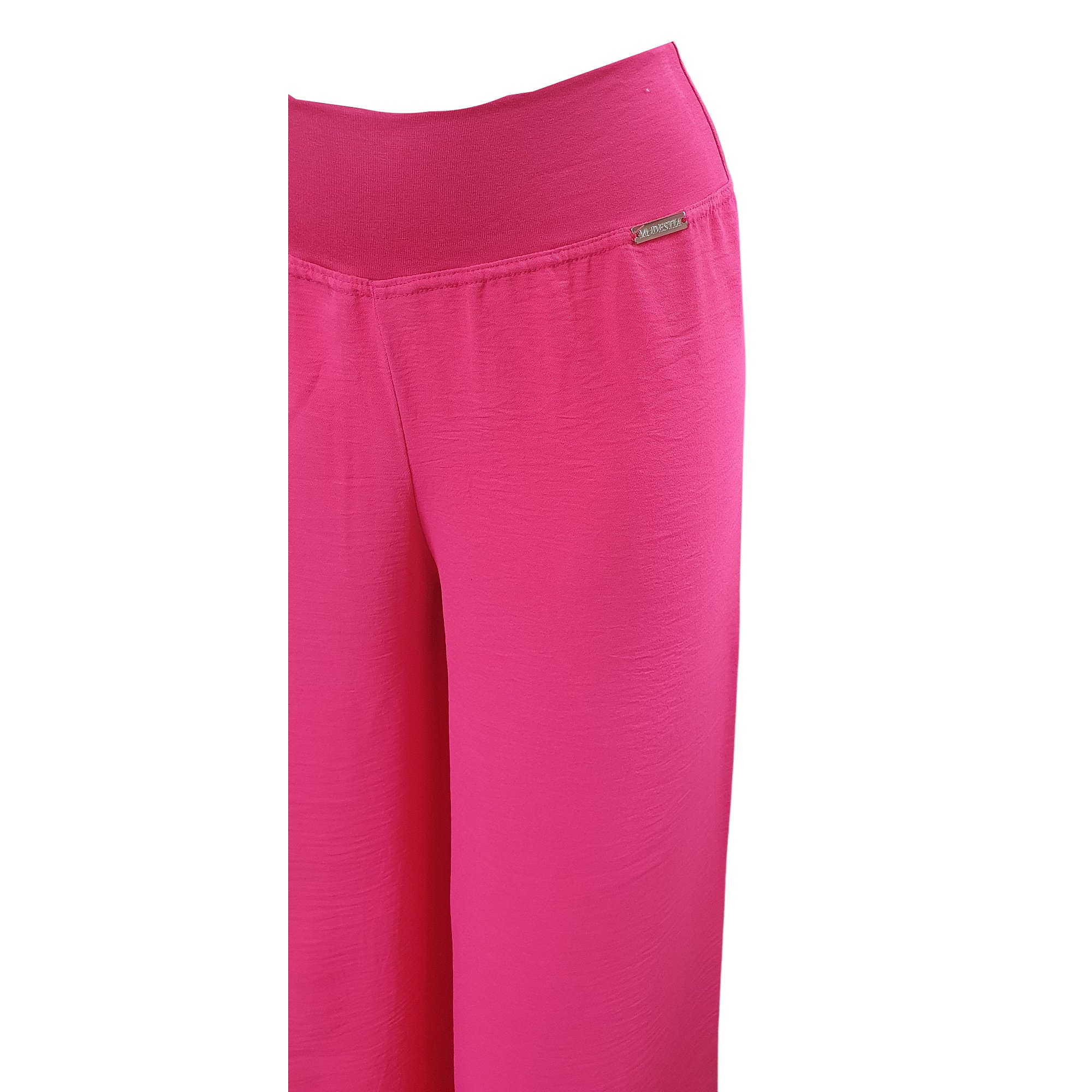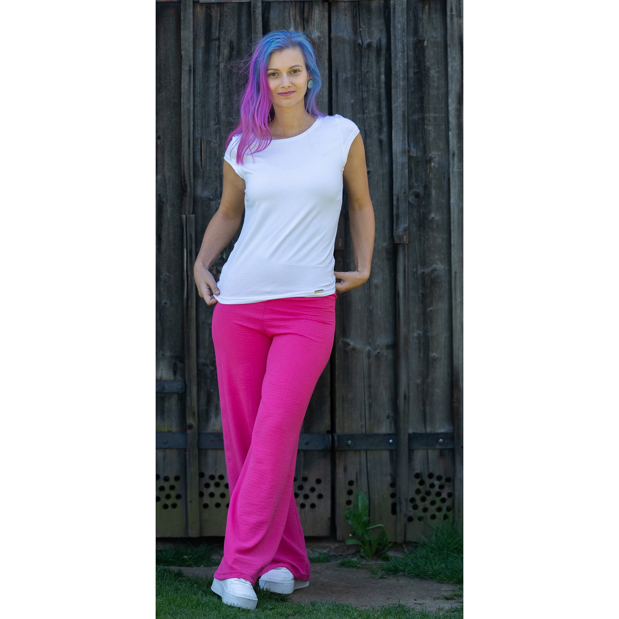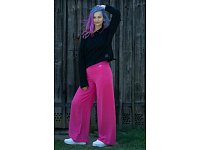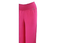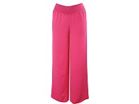 Letní pohodlné dlouhé kalhoty ze slabého materiálu v tmavě růžové barvě. V pase do elastické pasovky. Délka včetně pasu je 105cm. Šířka nohavice 31 cm. Pereme na 30°. 95% polyester 5% elastan