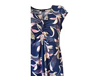 Dámské letní šaty Modestia s celoplošným květinovým vzorem na tmavě modrém podkladu, přestřižené pod prsy a nabrané do šňůrky na stažení. Délka u vel. 38 je 105 cm, stupňování v délce po 1 cm. Pereme v pračce na 30°. Materiál 96% polyester, 4% elastan.