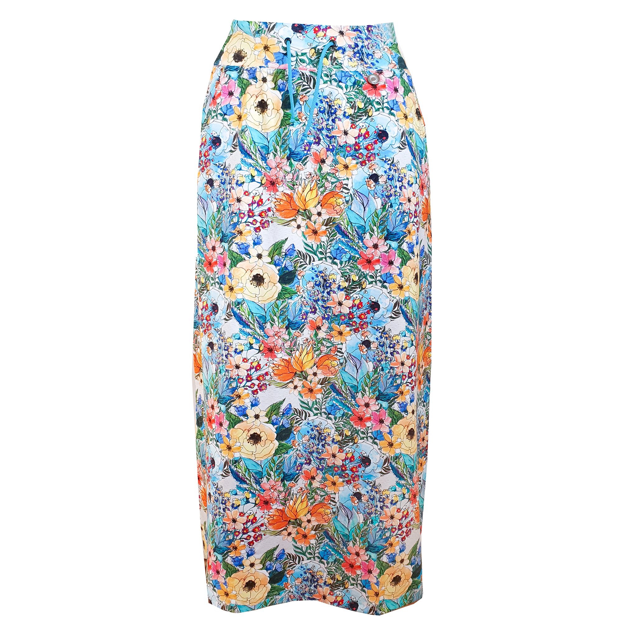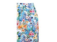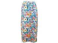 Dlouhá letní sukně se žluto modrým tiskem. Zajímavě řešená elastická pasovka. Délka 90 cm. Údržba - praní na 30° v pračce. Materiál: 95% bavlna 5% elastan.