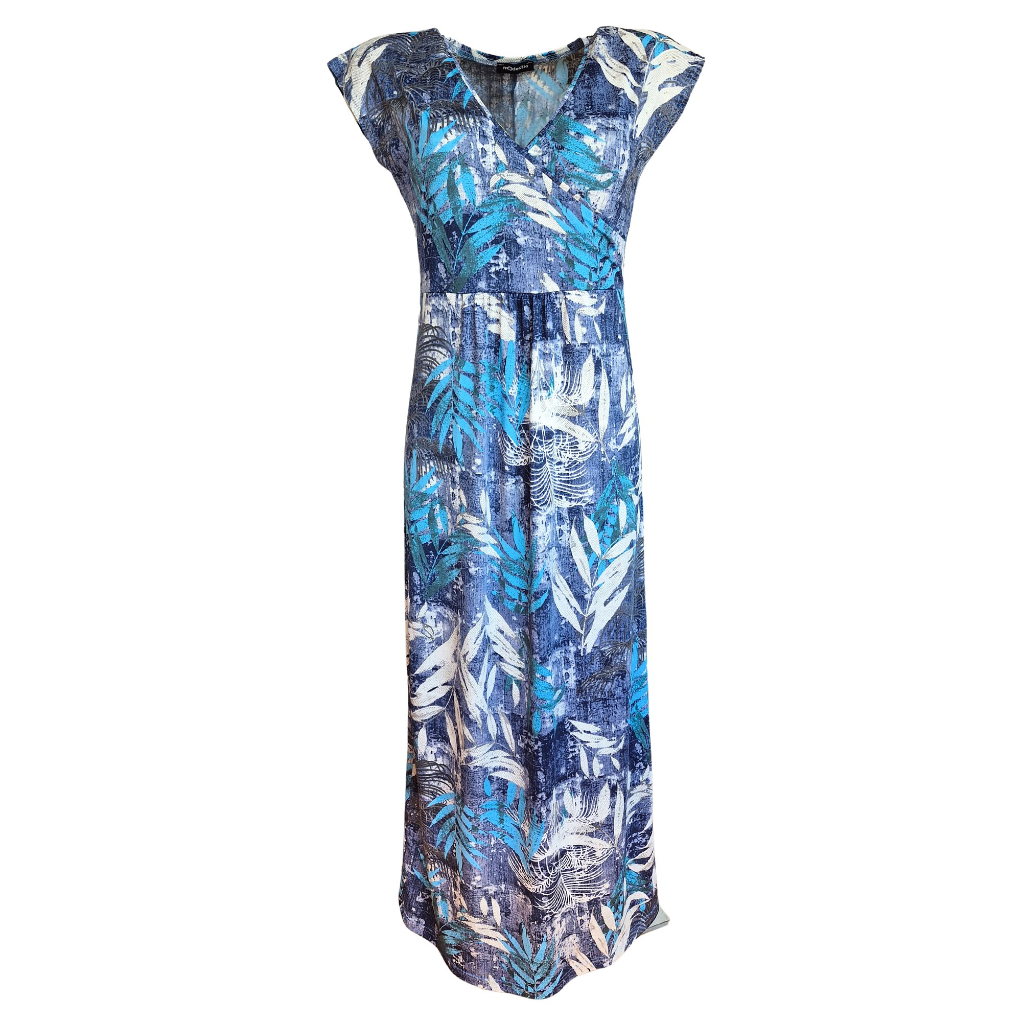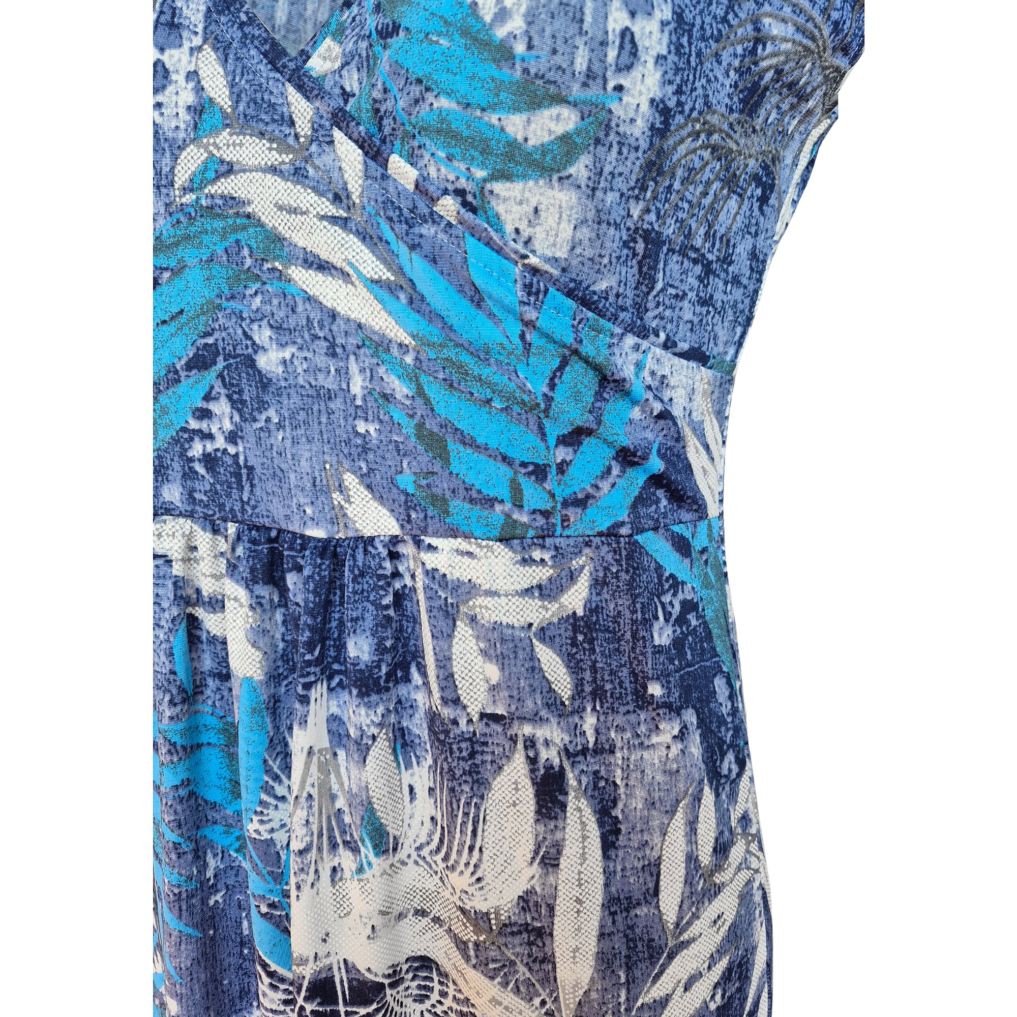 Krásné letní volné šaty s překříženým výstřihem a nabrané pod prsy. Spadlé rukávy. Délka šatů 132 cm. Pereme v pračce na 30°. Materiál 96% polyester,4% elastan.