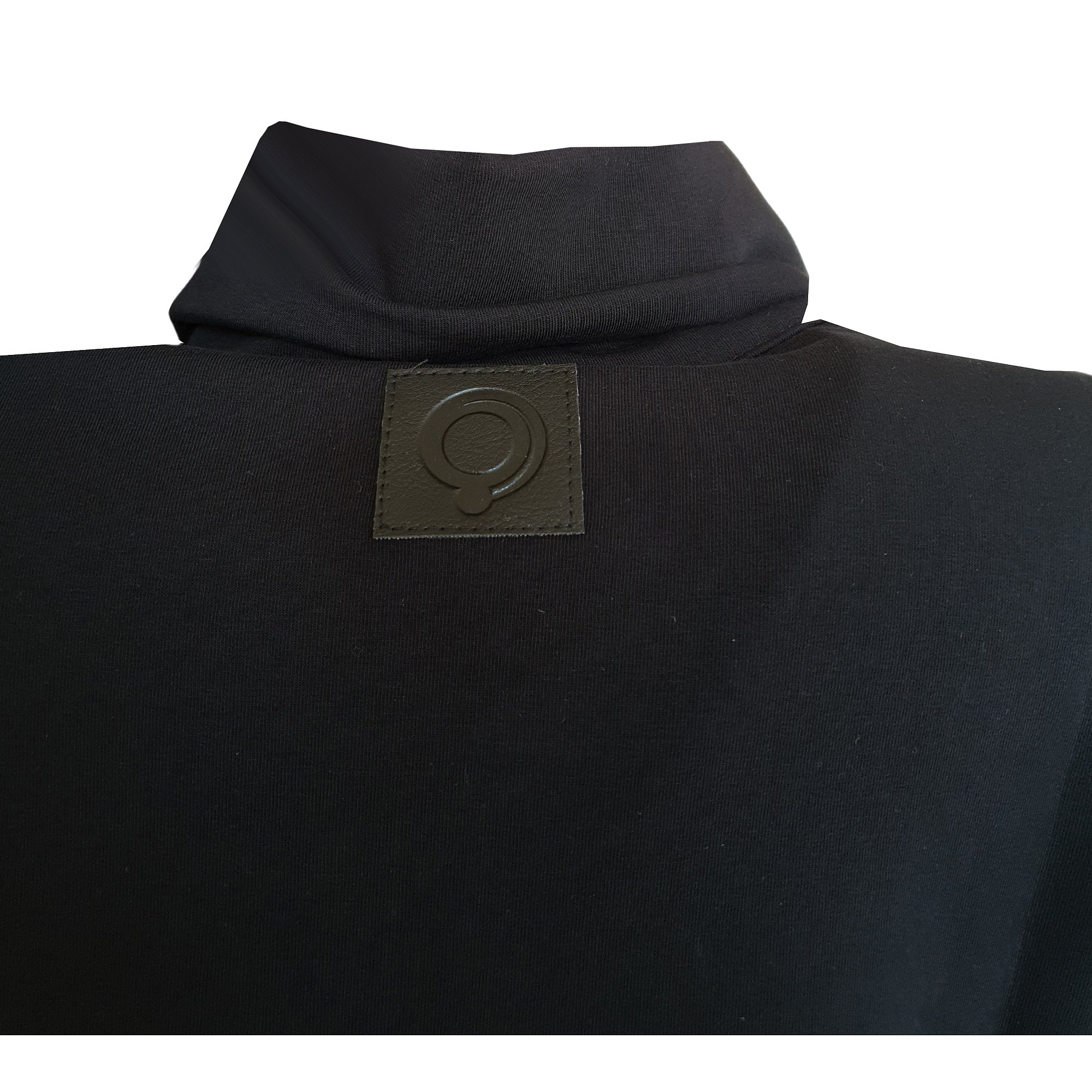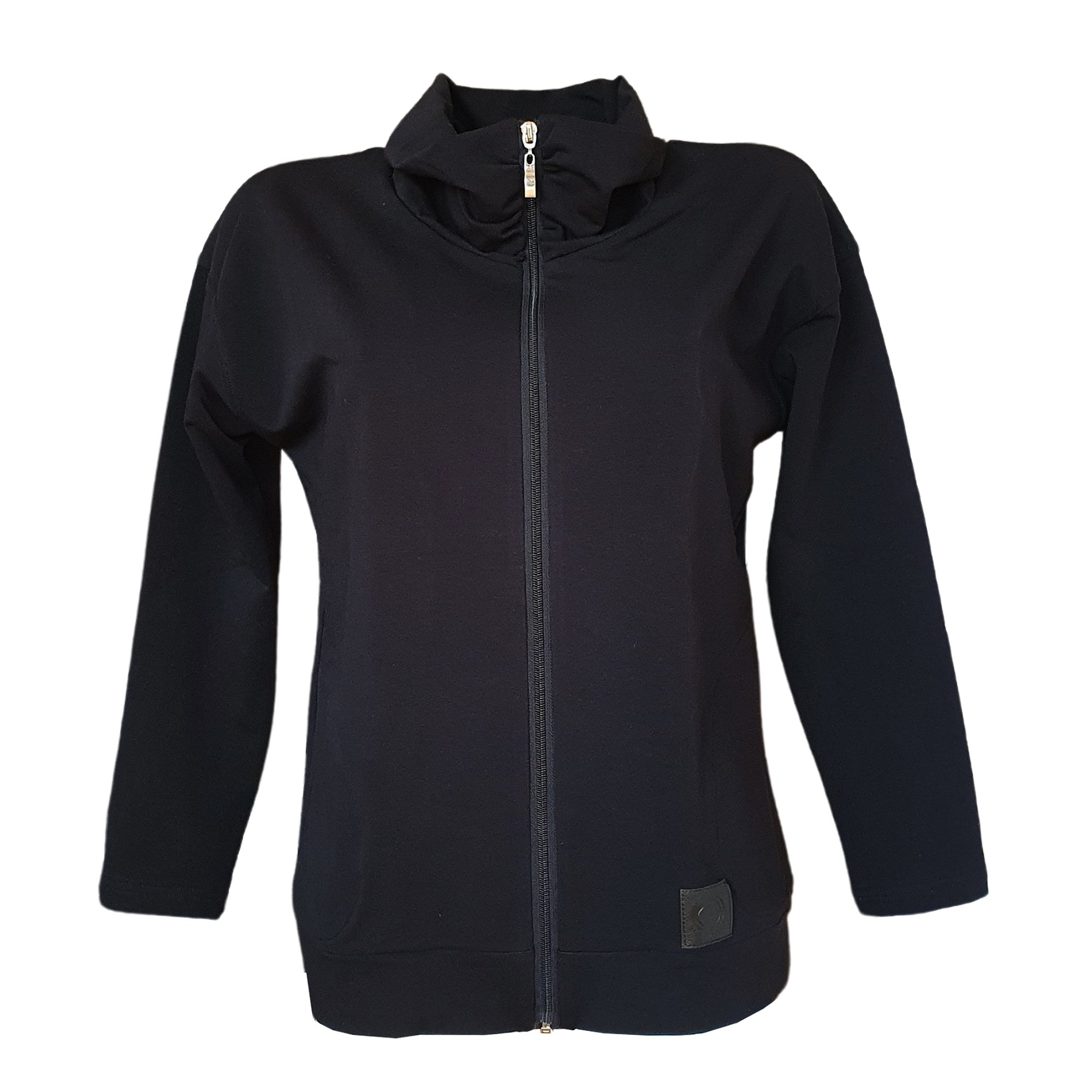 Mikina v černé barvě má dlouhé rukávy a zapínání na zip po celé délce. Mikina je vybavena vyšším stojáčkem se zipem. Na přední straně jsou praktické kapsy. Délka 65 cm. Pereme v pračce na 30°. Materiál 97% bavlna, 3% elastan.