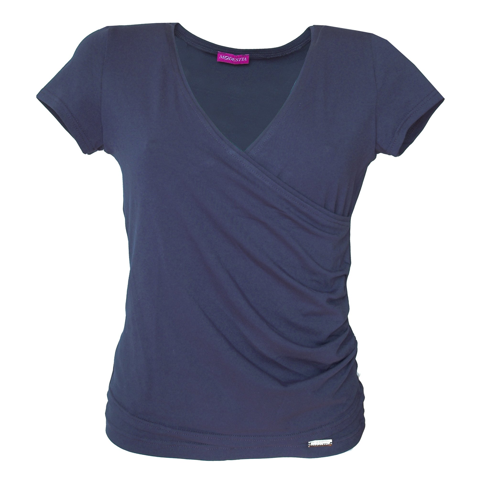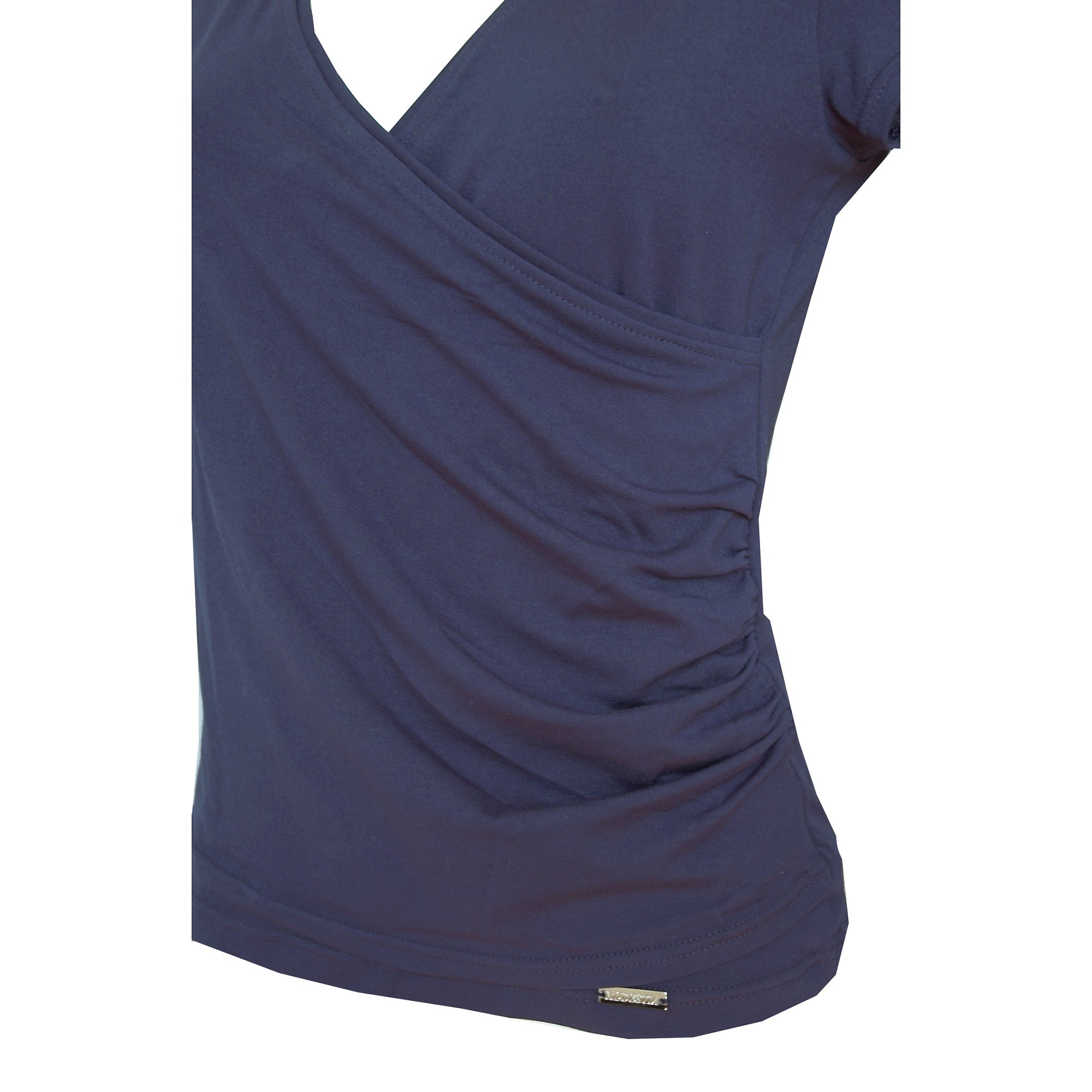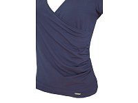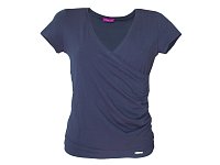 Zajímavě řešené tričko, krátký rukáv, na prsou překřížené, zavinovací vzhled. Po levé straně nařasené. Délka u vel. 38 je 58 cm, stupňování ve vel. po 1,5 cm. Materiál: 95 % viskóza 5 % elastan