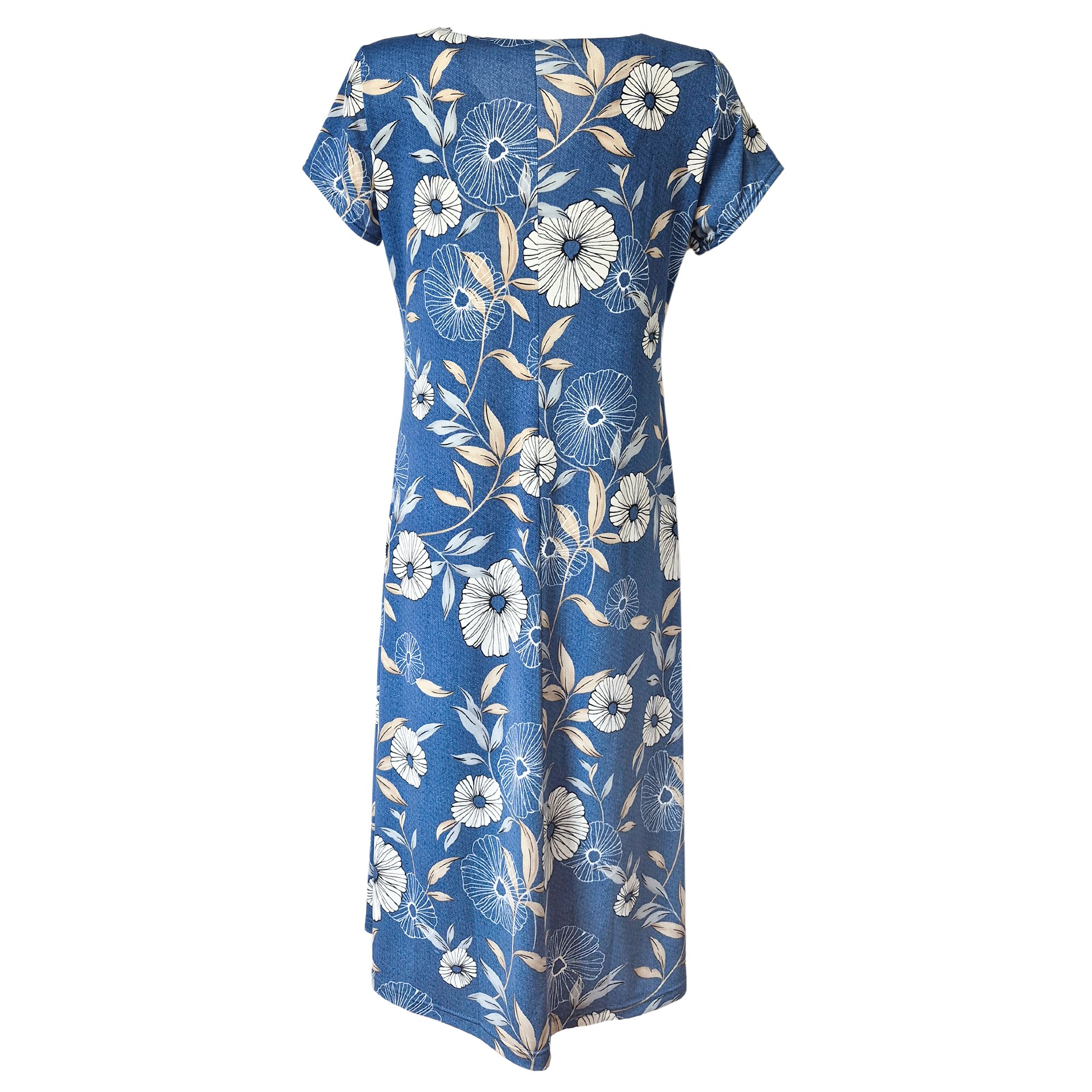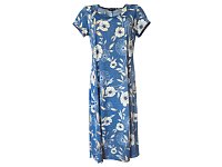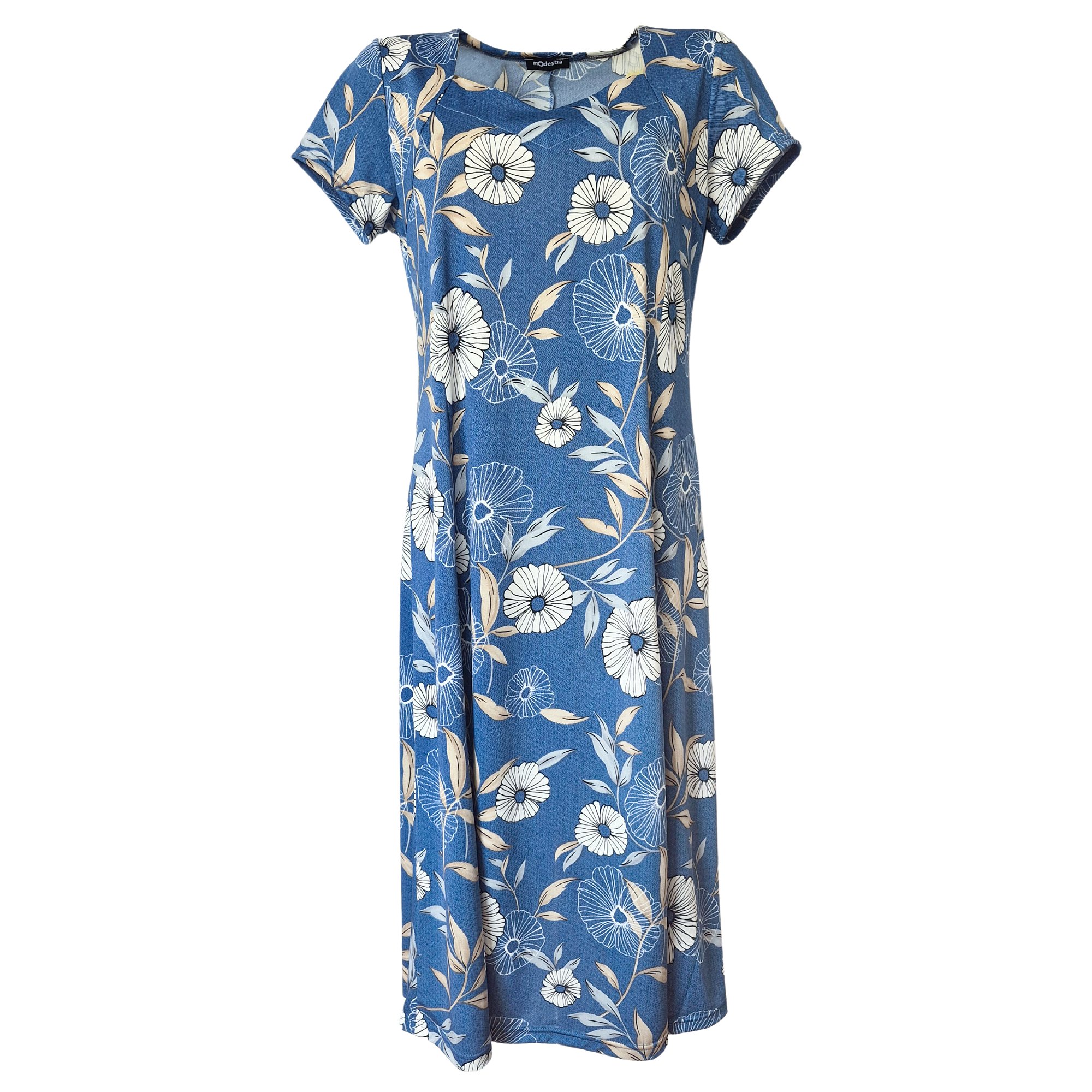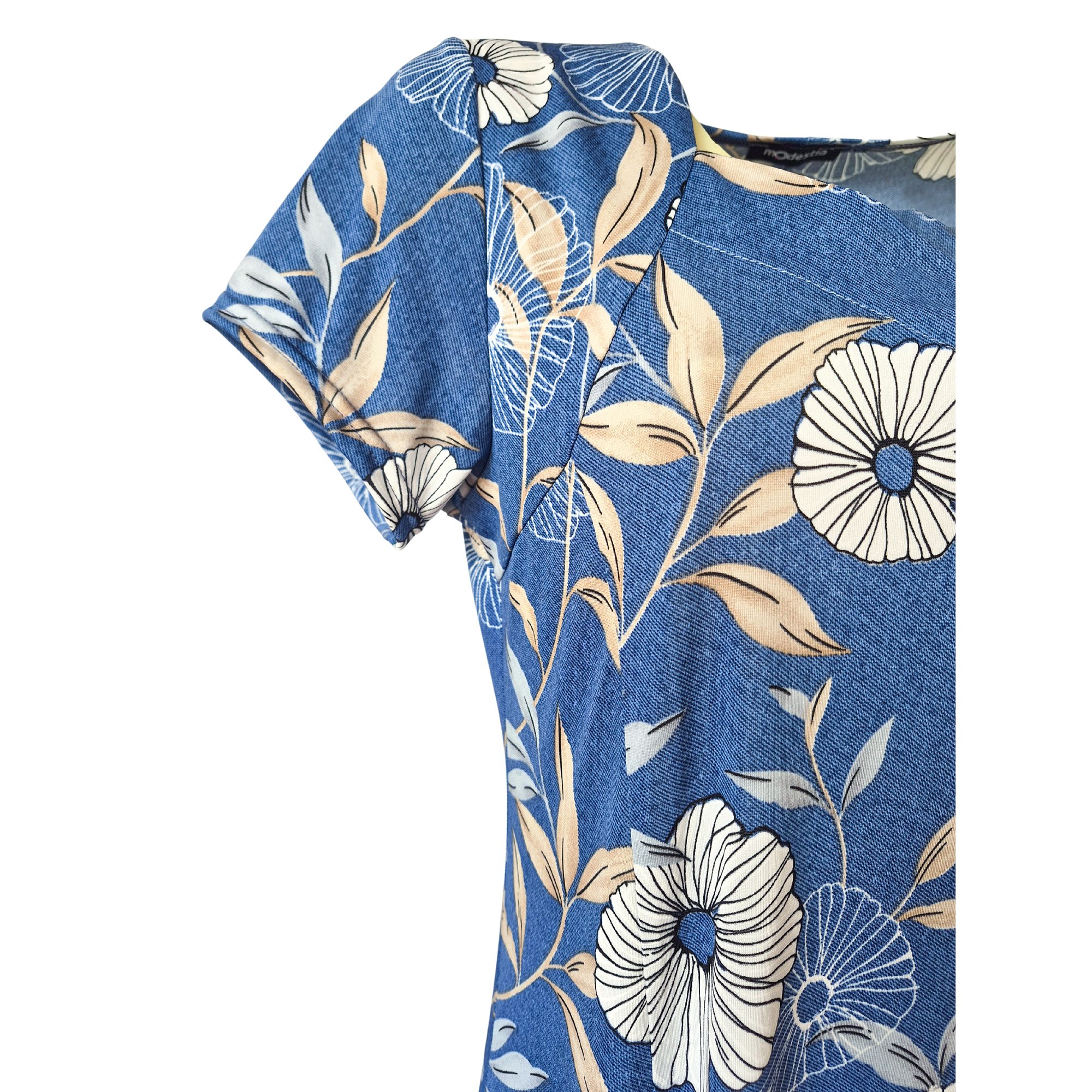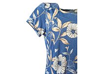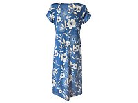 Šaty v princesovém střihu s rozšířenou sukní s krásným otevřeným výstřihem do V s jemným květinovým motivem na modrém podkladu. Délka 115 cm. Pereme v pračce na 30°. Materiál 96% polyester, 4% elastan.