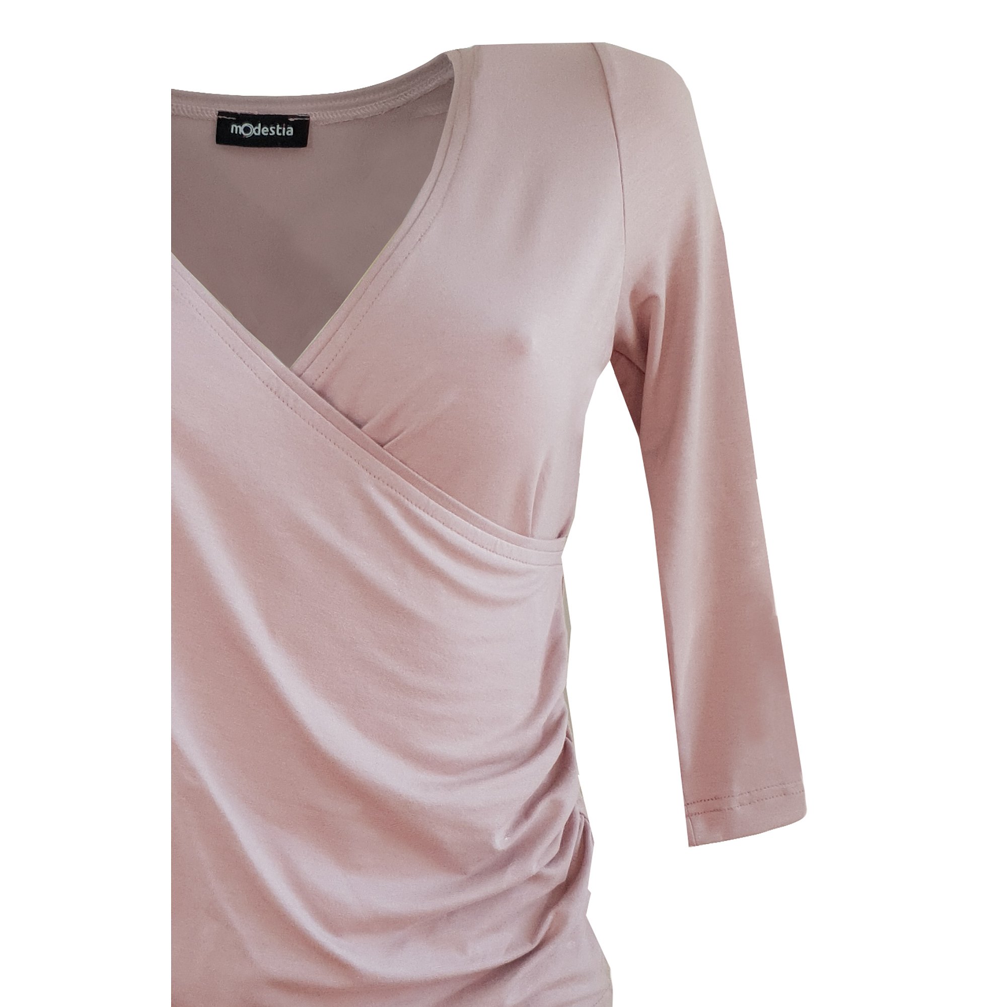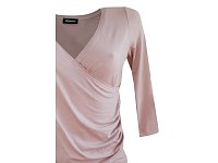 Zajímavě řešená halenka s 3/4 rukávem, na prsou překřížená, zavinovací vzhled. Po levé straně nařasené. Délka u vel. 38 je 58 cm, stupňování ve vel. po 1,5 cm. Barva světlá staro růžová.