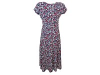 Krásné elegantní šaty s překříženým, nabraným vrchním dílem a širokou sukní. Přestřižené v pase. Červeno modro bílý tisk drobných kvítků. Lehký - jemný materiál. Délka 110 cm. Pereme v pračce na 30°. 95% polyester 5% elastan