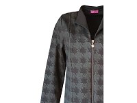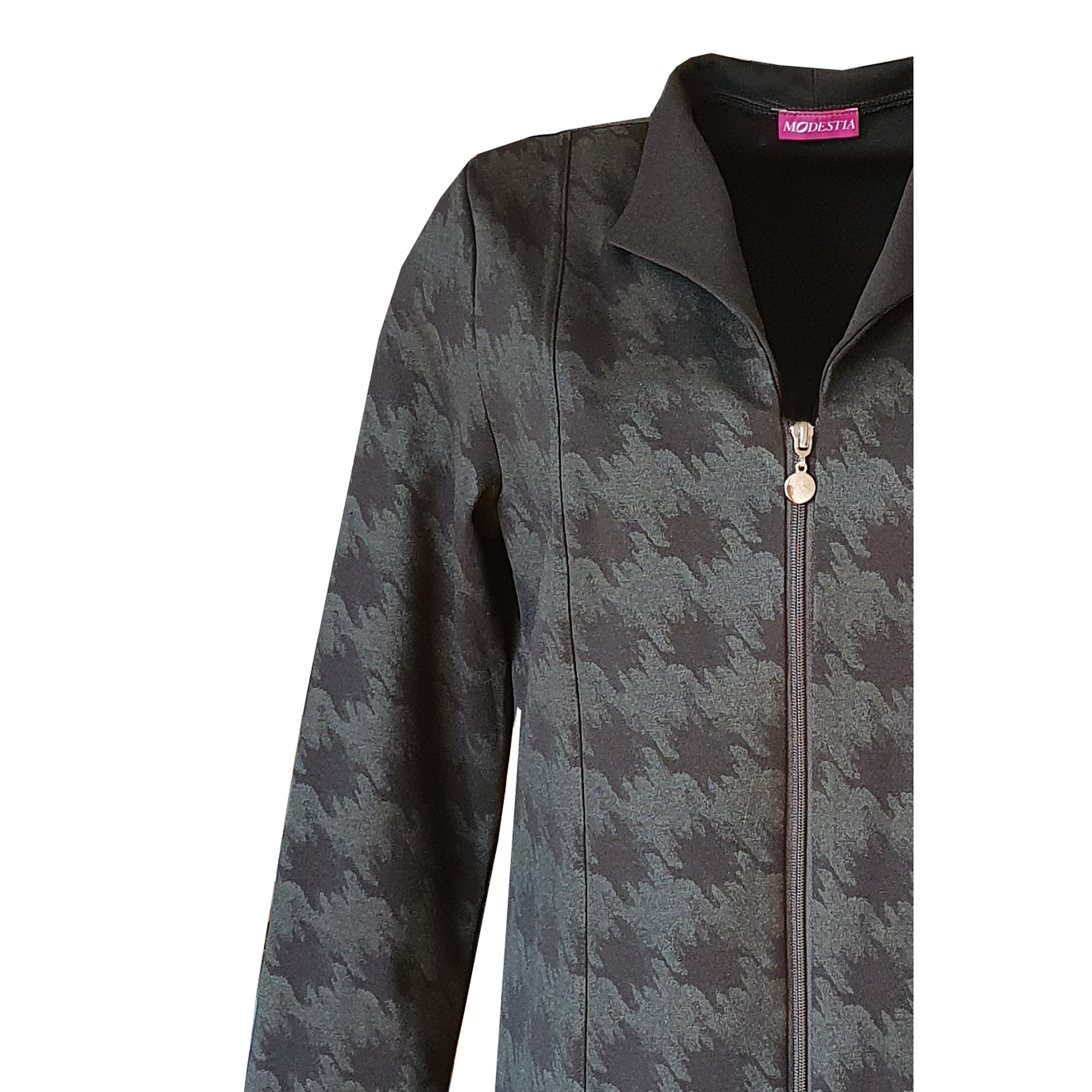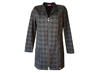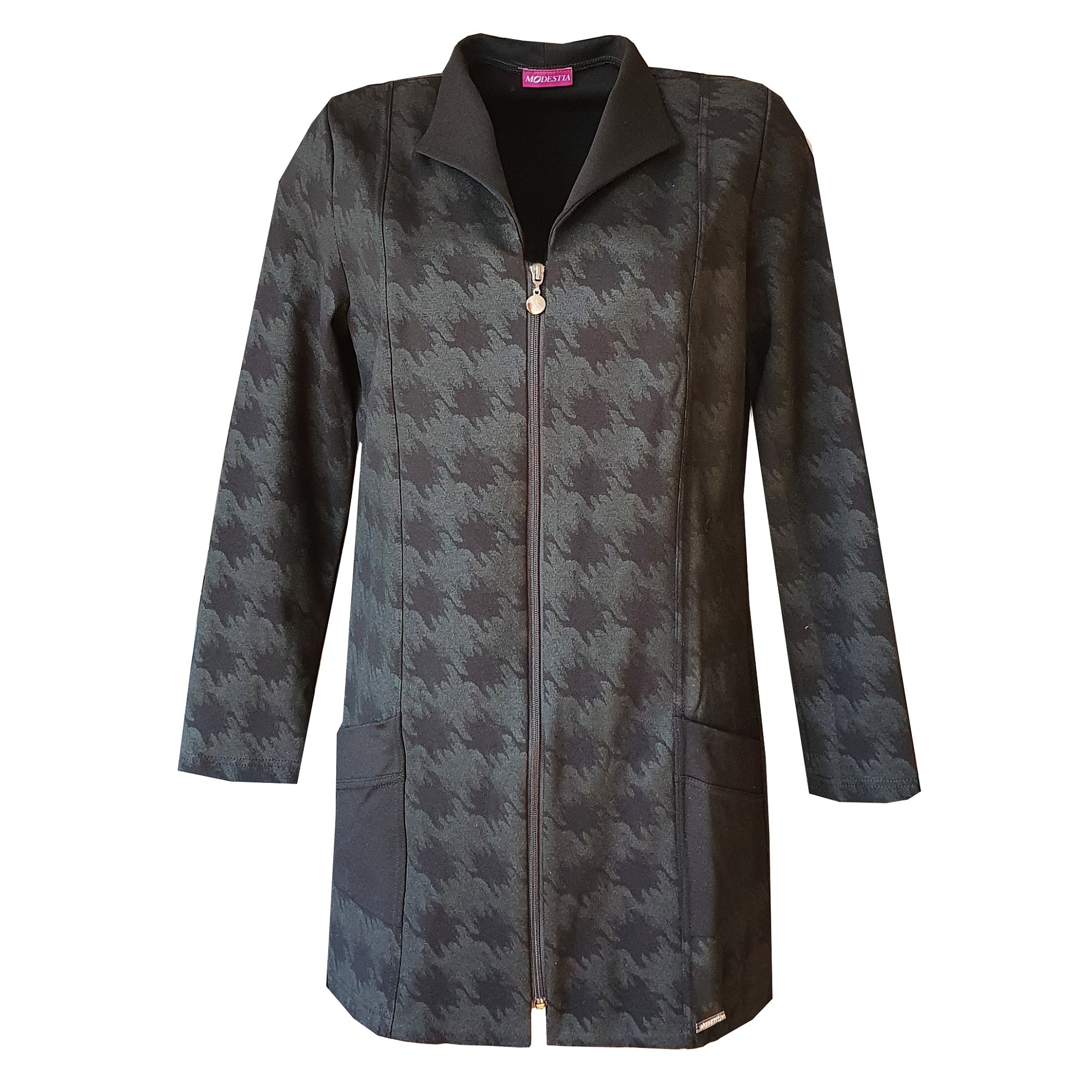 Elegantní prodloužený kabátek na zip. Barva černá se vzorem. Délka 85 cm. Pereme v pračce na 30°. Materiál: 74% polyester 21% viskóza 5% elastan