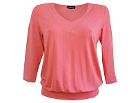 Halenka s krásným véčkovým výstřihem volného střihu, na bocích nabraná do širokého lemu. 3/4 rukáv. Barva - růžová. Pereme v pračce na 30°. Materiál: 95 % viskóza 5 % elastan