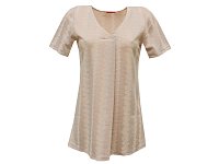 Krásná volná tunika s krátkým rukávem se skladem ve výstřihu. Tunika je v růžovo bílé barvě s tiskem a leskem. Pereme v pračce na 30°. Materiál: 74% polyester 21% viskóza 5% elastan