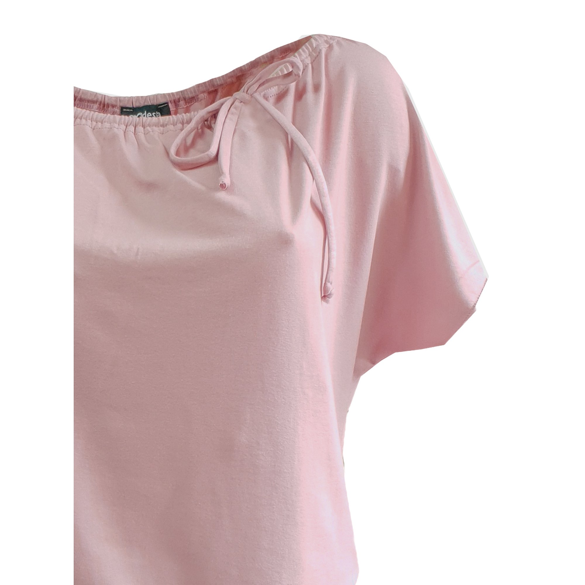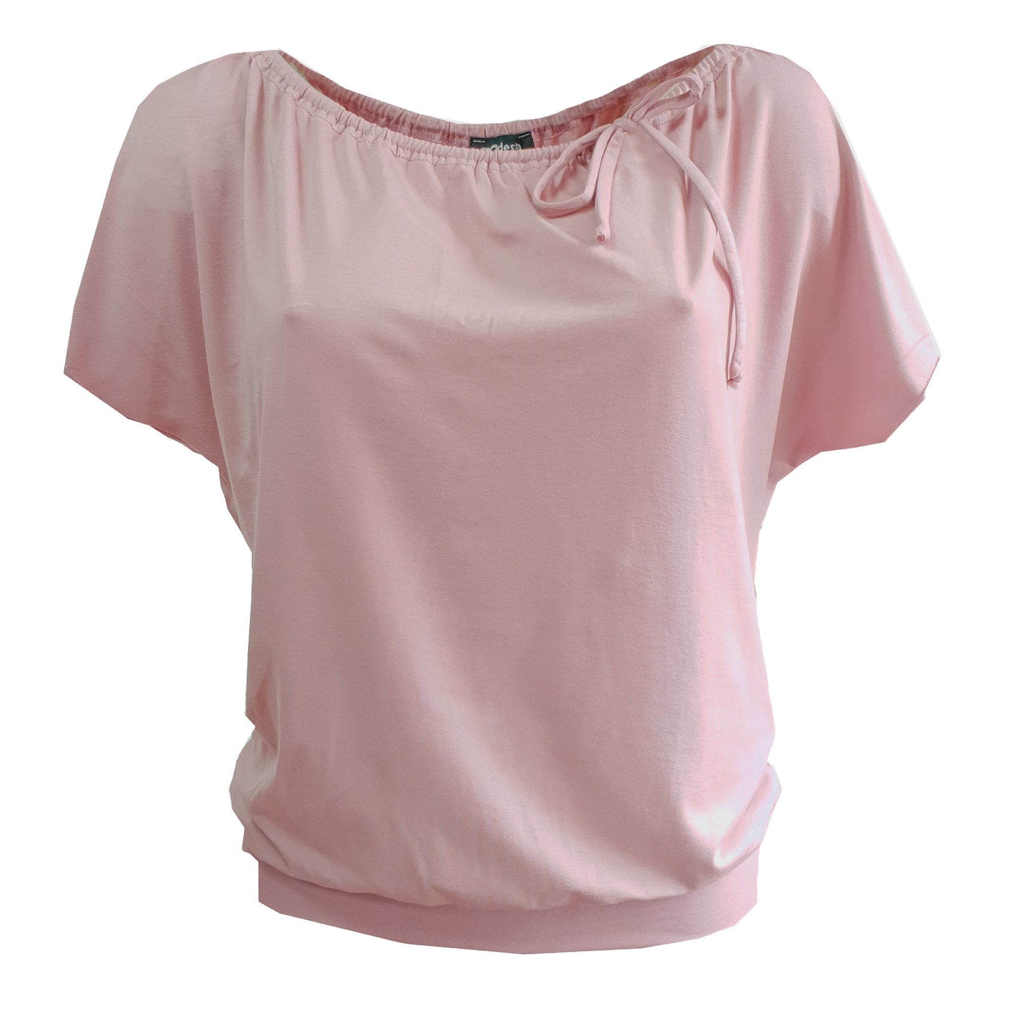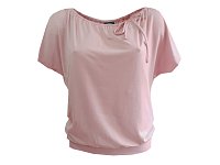 Růžová halenka netopýřího střihu, ve výstřihu stažená do šňůrky a na spodní části dvojitý lem. Spadlý volný rukáv. Materiál: 95% viskóza 5% elastan