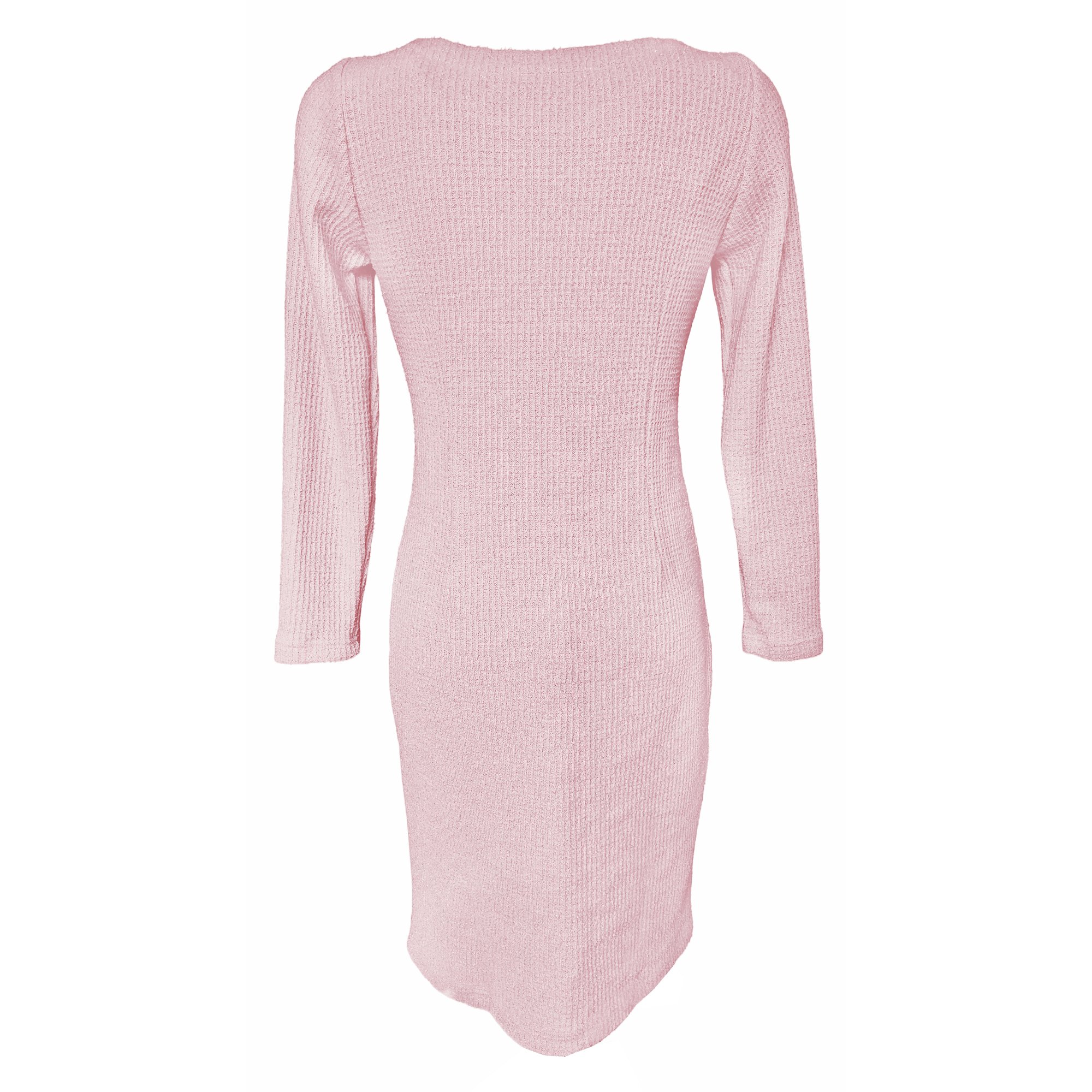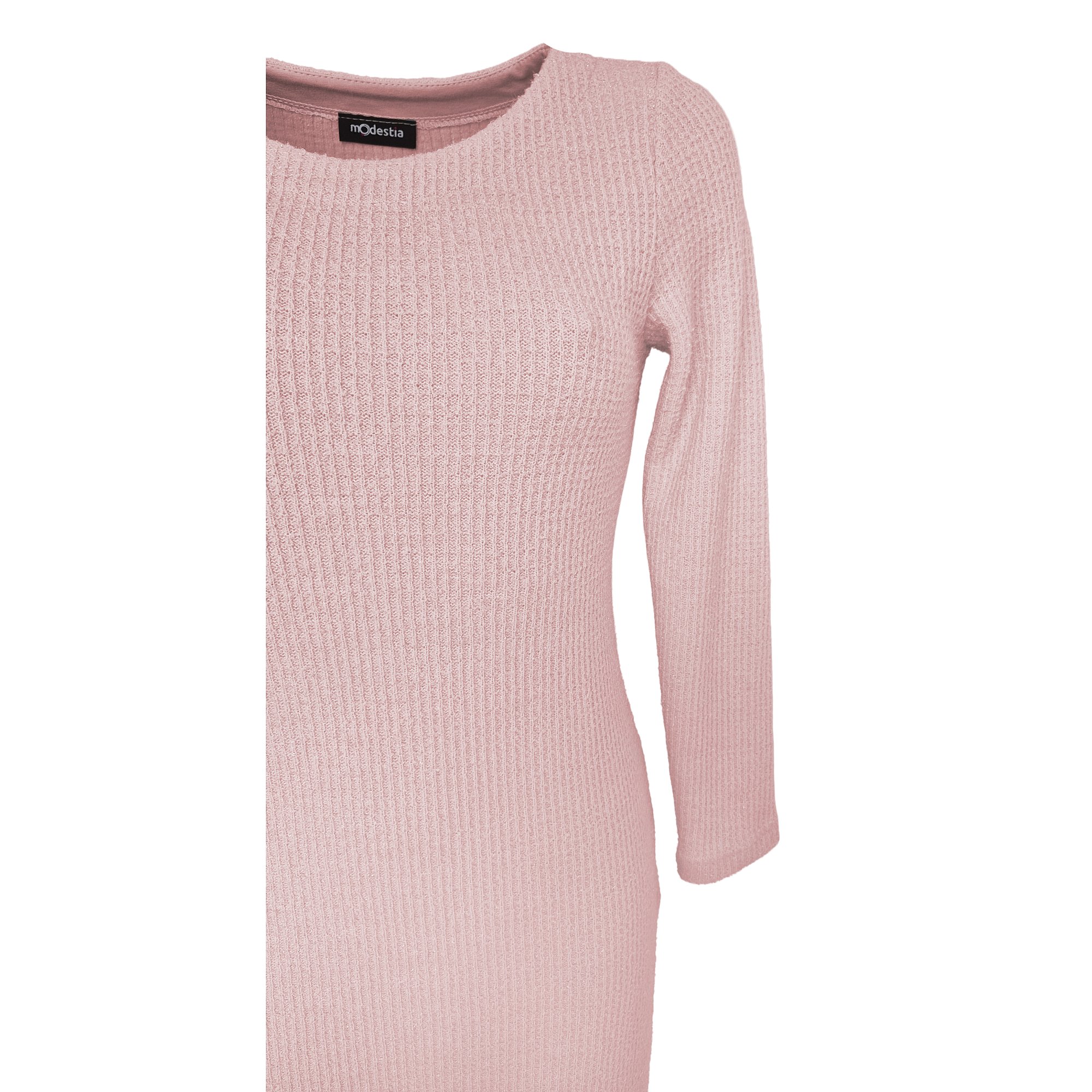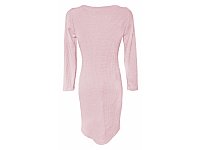 Dámské šaty mají jednoduchý, ale elegantní střih, který krásně zvýrazní postavu. Jsou vyrobené z žebrovaného úpletu s jemnou strukturou. Barva je jemně pudrově růžová, která působí velmi ženským dojmem. Materiál 74 % polyester,21% viskoza, 5% elastan.