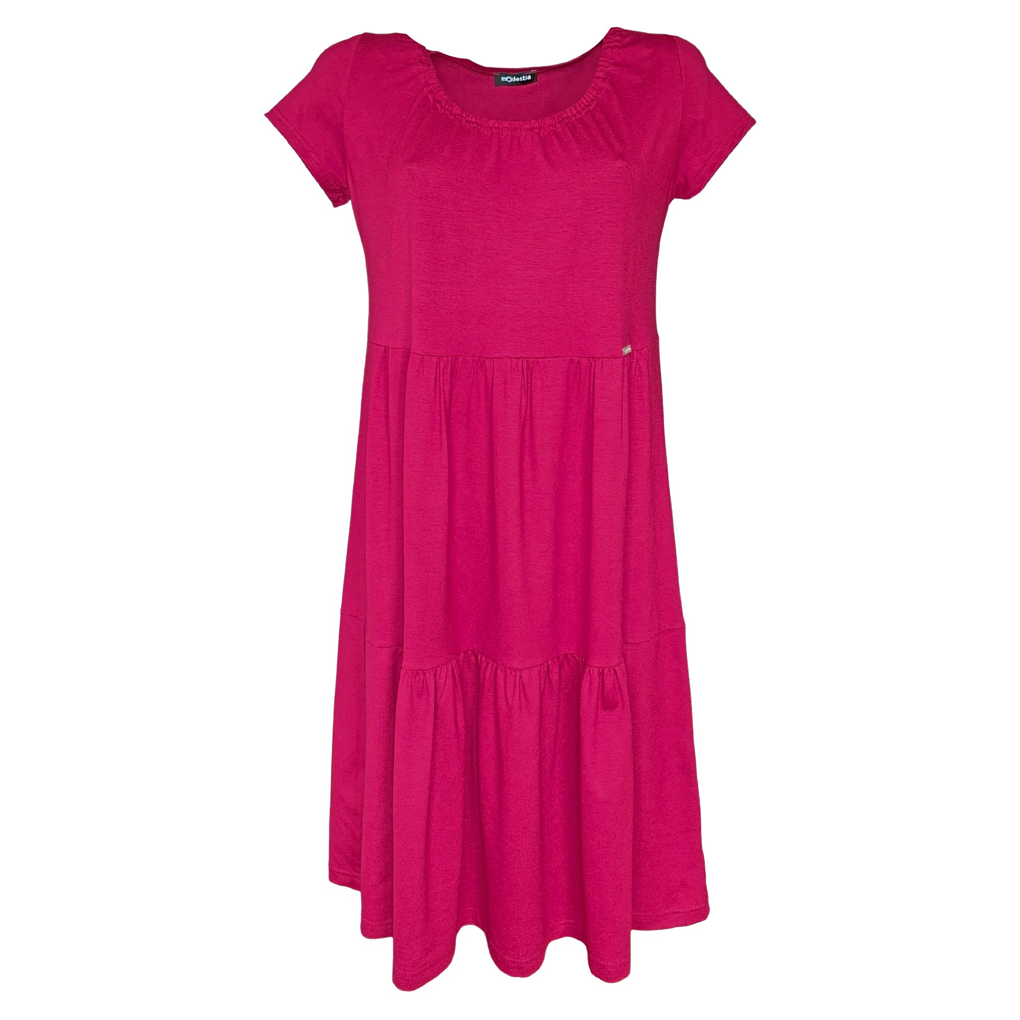 Dámské šaty Modestia v růžovo fialové barvě mají volný, pohodlný střih s krátkým rukávem a nabíraným kulatým výstřihem. Přestřižené pod prsy a jemným nařasením ve spodní části. Délka 105 cm. Materiál: 95% viskoza, 5% elastan.
