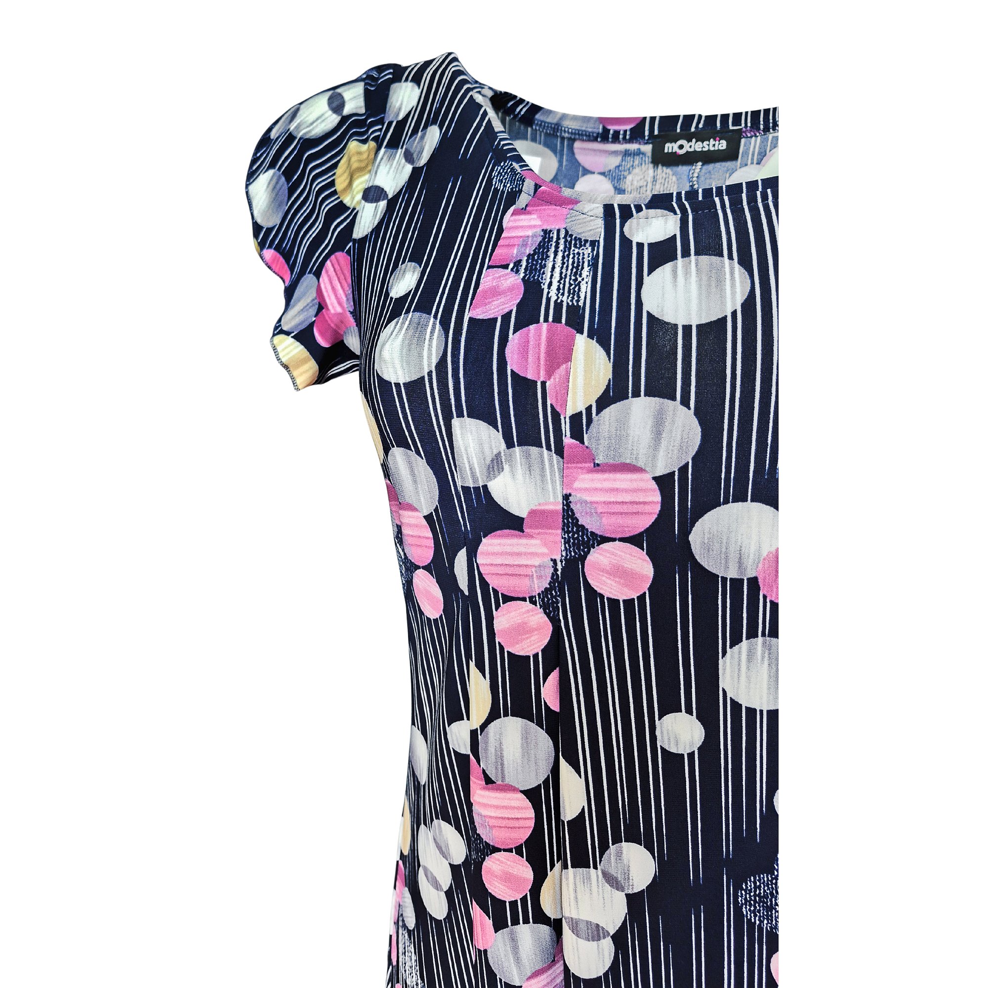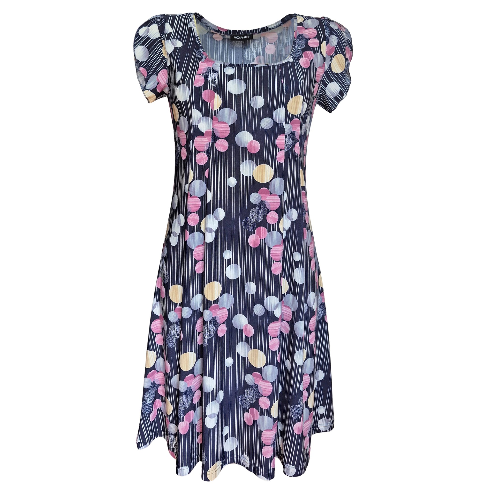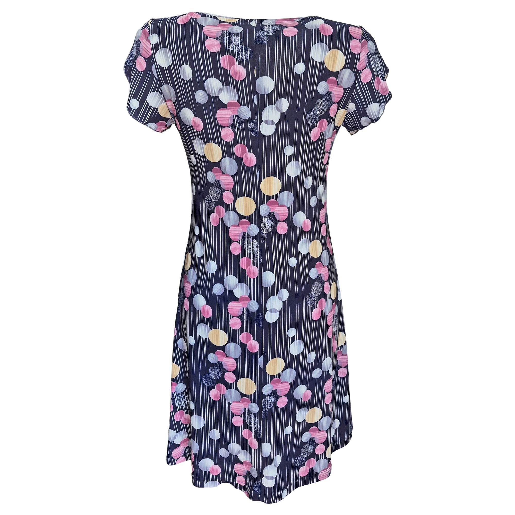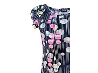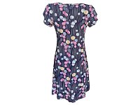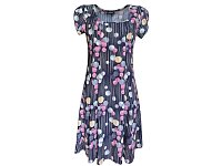 Letní volné romantické šaty se sklady na prsou s větším otevřeným výstřihem. Barva modrá a růžová s drobnými koly. Zajímavě řešený volánový rukávek. Délka šatů 97 - 100 cm. Pereme v pračce na 30°. Materiál 96% polyester, 4% elastan.