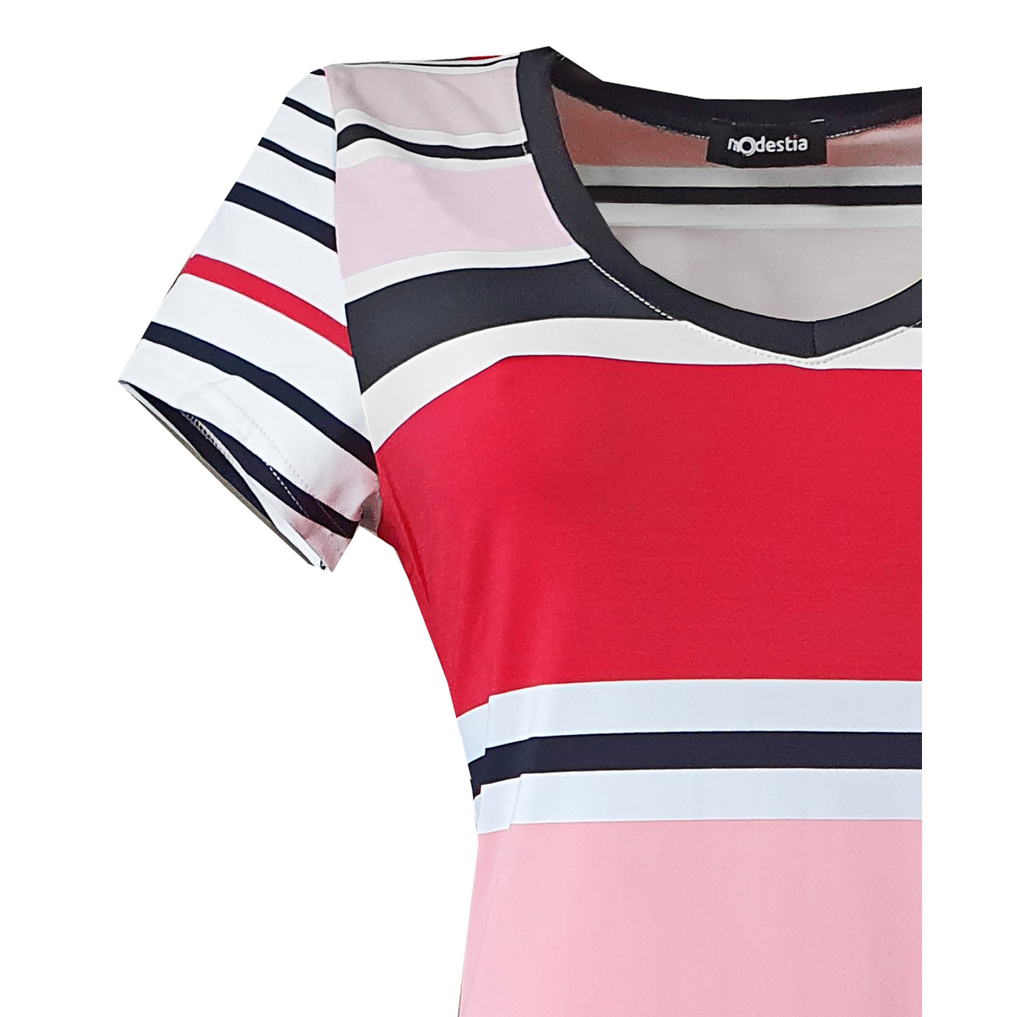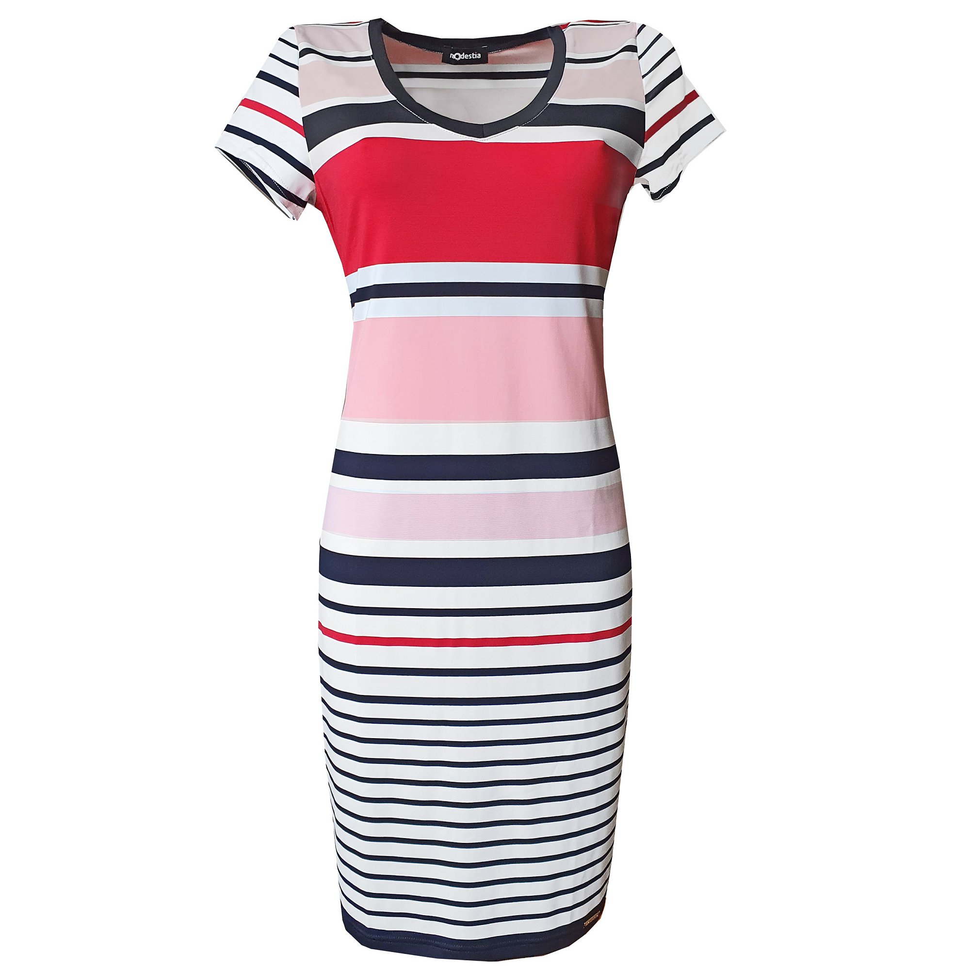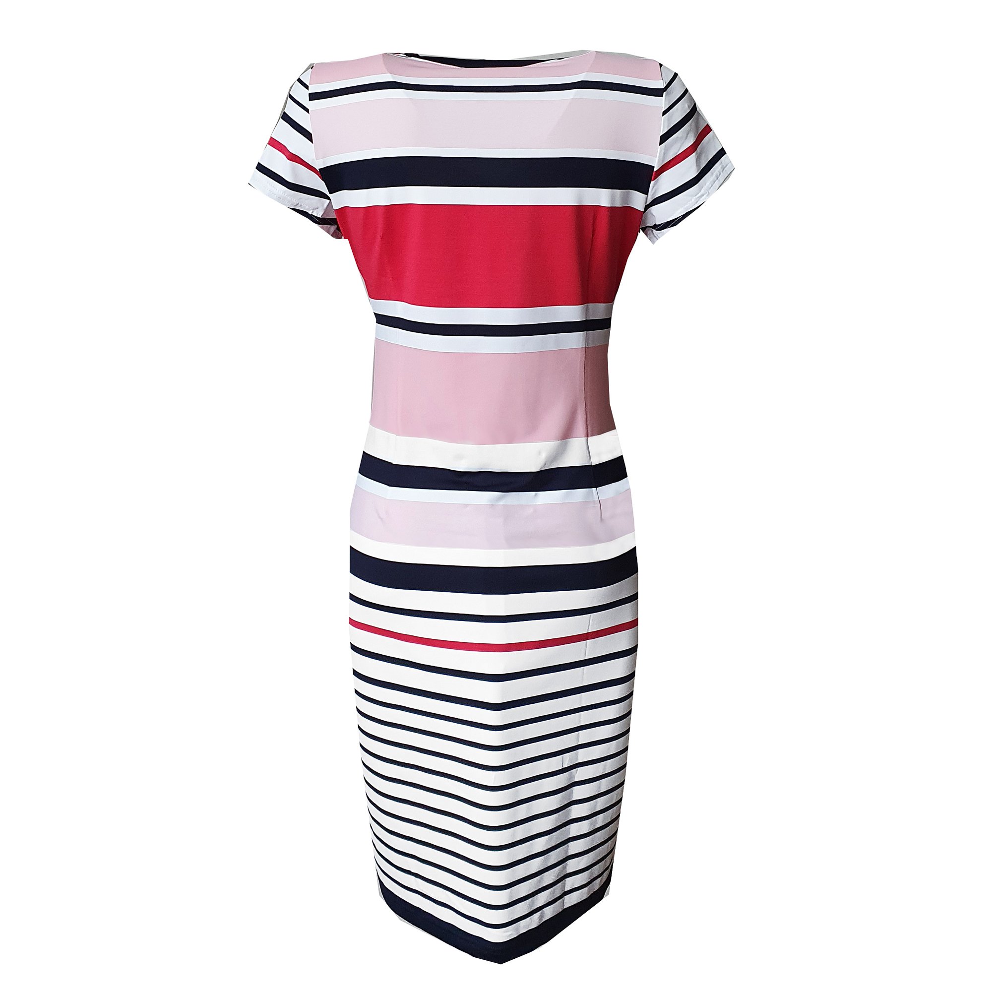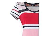 Šaty s krátkým rukávem s modro bílo růžovými pruhy v klasickém projmutém střihu. Délka 100 cm. Pereme v pračce na 30°. Materiál: 21% viskóza 74% polyester 5% elastan