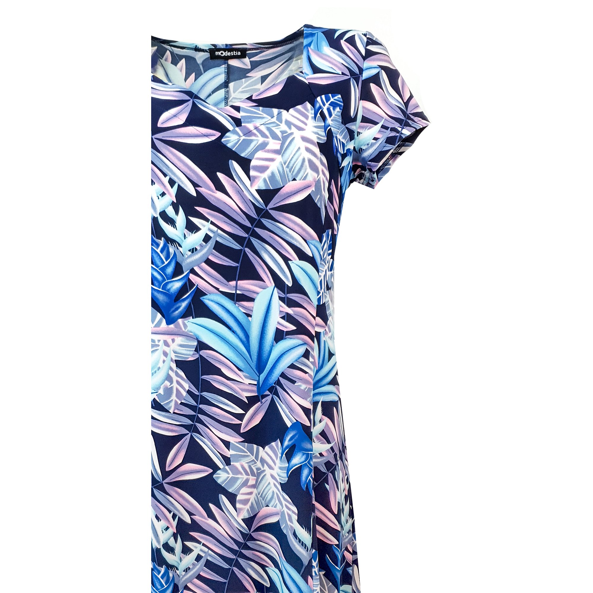 Šaty v princesovém střihu s rozšířenou sukní s krásným otevřeným výstřihem v krásných pastelových barvách růžové a modré. Délka 105 cm. Pereme v pračce na 30°. 95% polyester 5% elastan