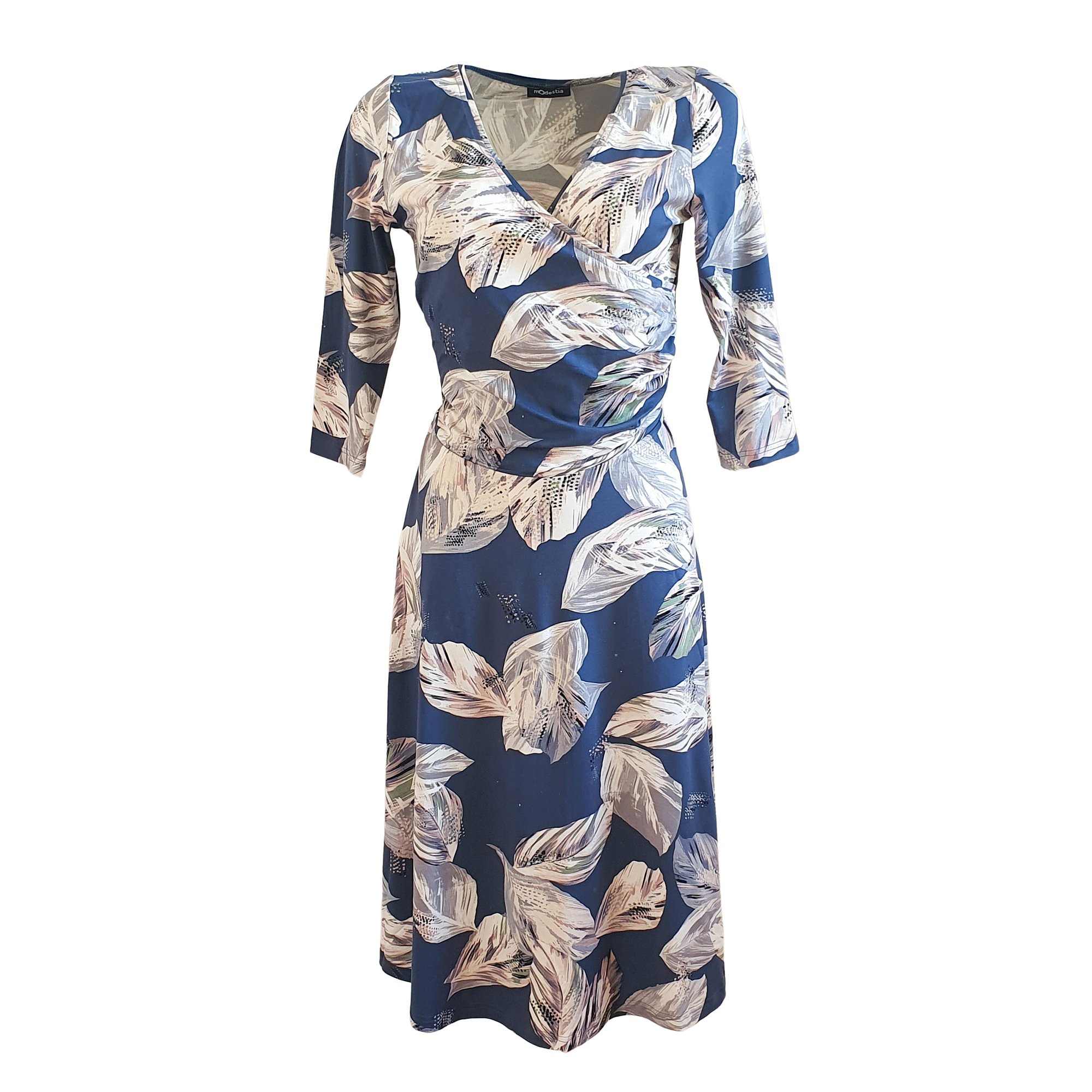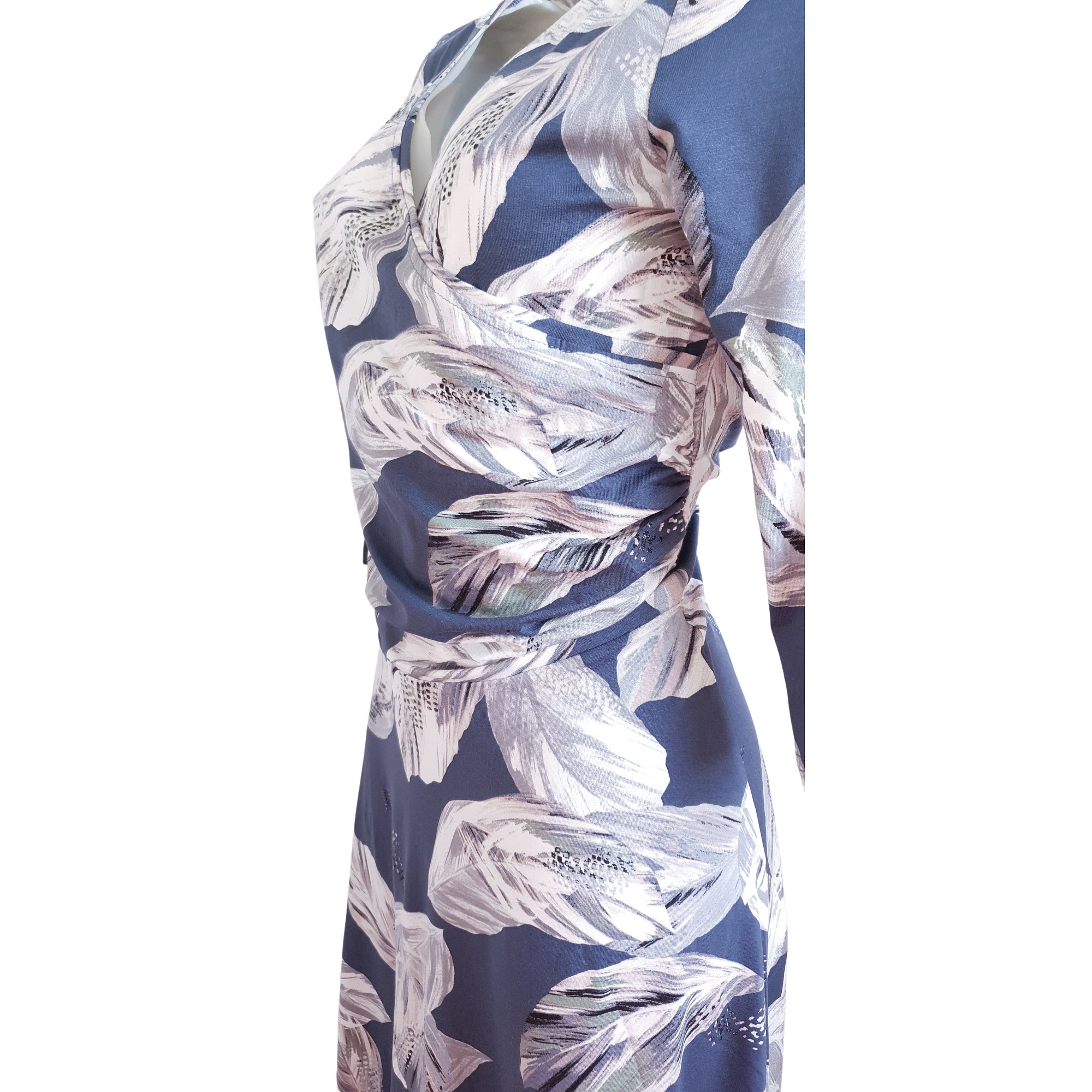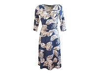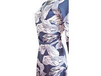 Krásné elegantní šaty s překříženým, nabraným vrchním dílem a širokou sukní. Barva modrá s velkým vzorem Šaty jsou přestřižené v pase s 3/4 rukávem. Délka 110 cm.