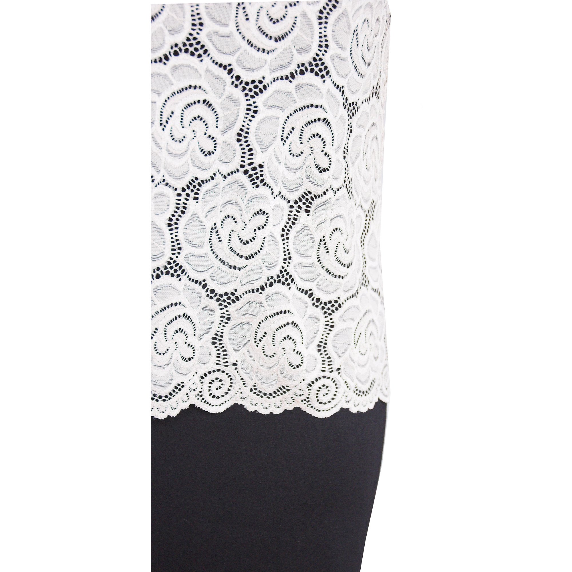Elegantní šaty s krajkovým podšitým vrchním dílem ve světle smetanové barvě a hladkou rovnou sukní v barvě černé. Délka 100 cm. Materiál: 74% polyester 21% viskóza 5% elastan