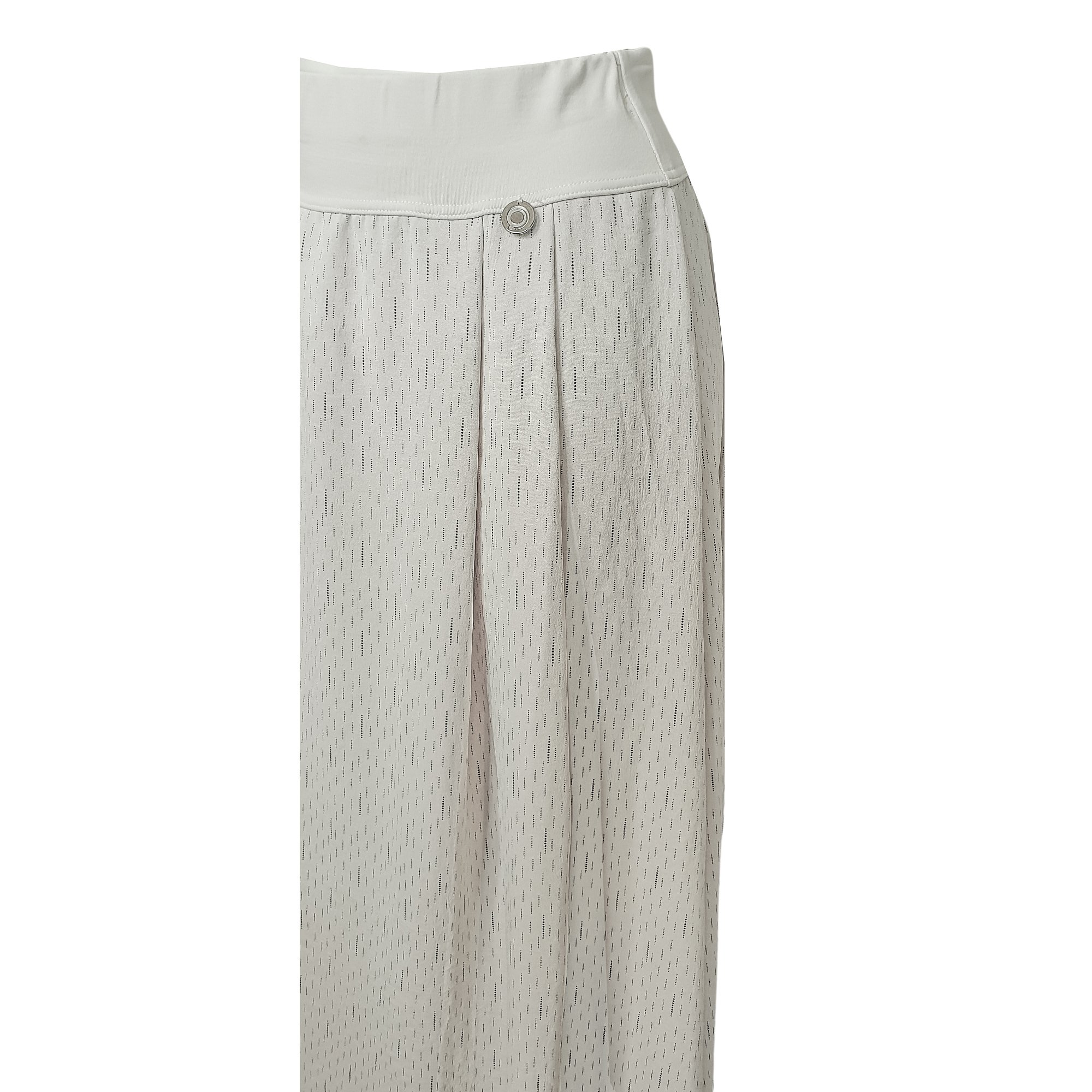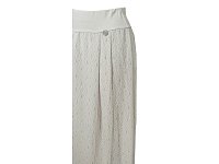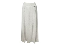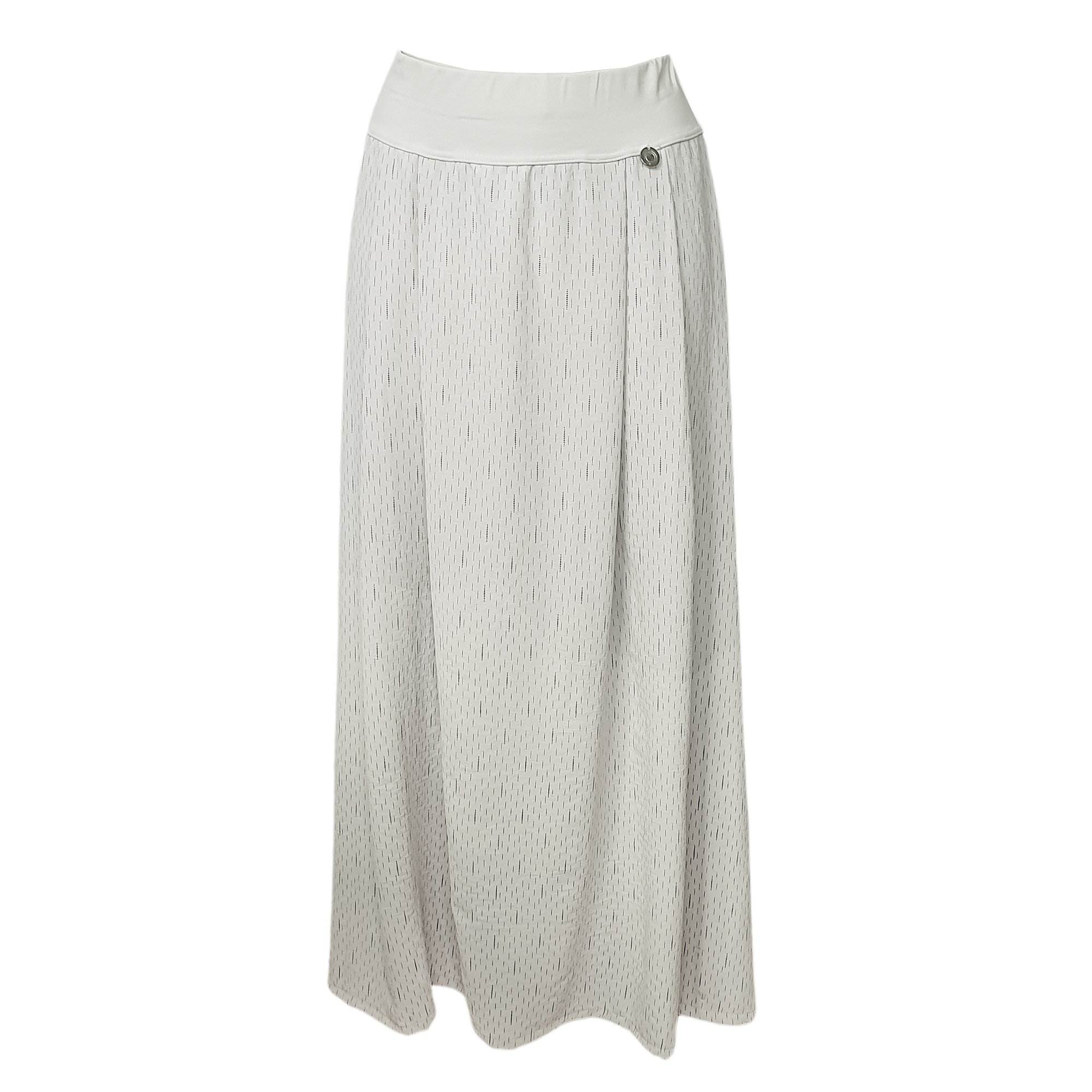Široká sukně se sklady na předním i zadním díle, do gumy v pase ve smetanové barvě s jemným černým vzorem. Tady je video. Délka 95 - 100 cm. 97% viskóza 3% elastan