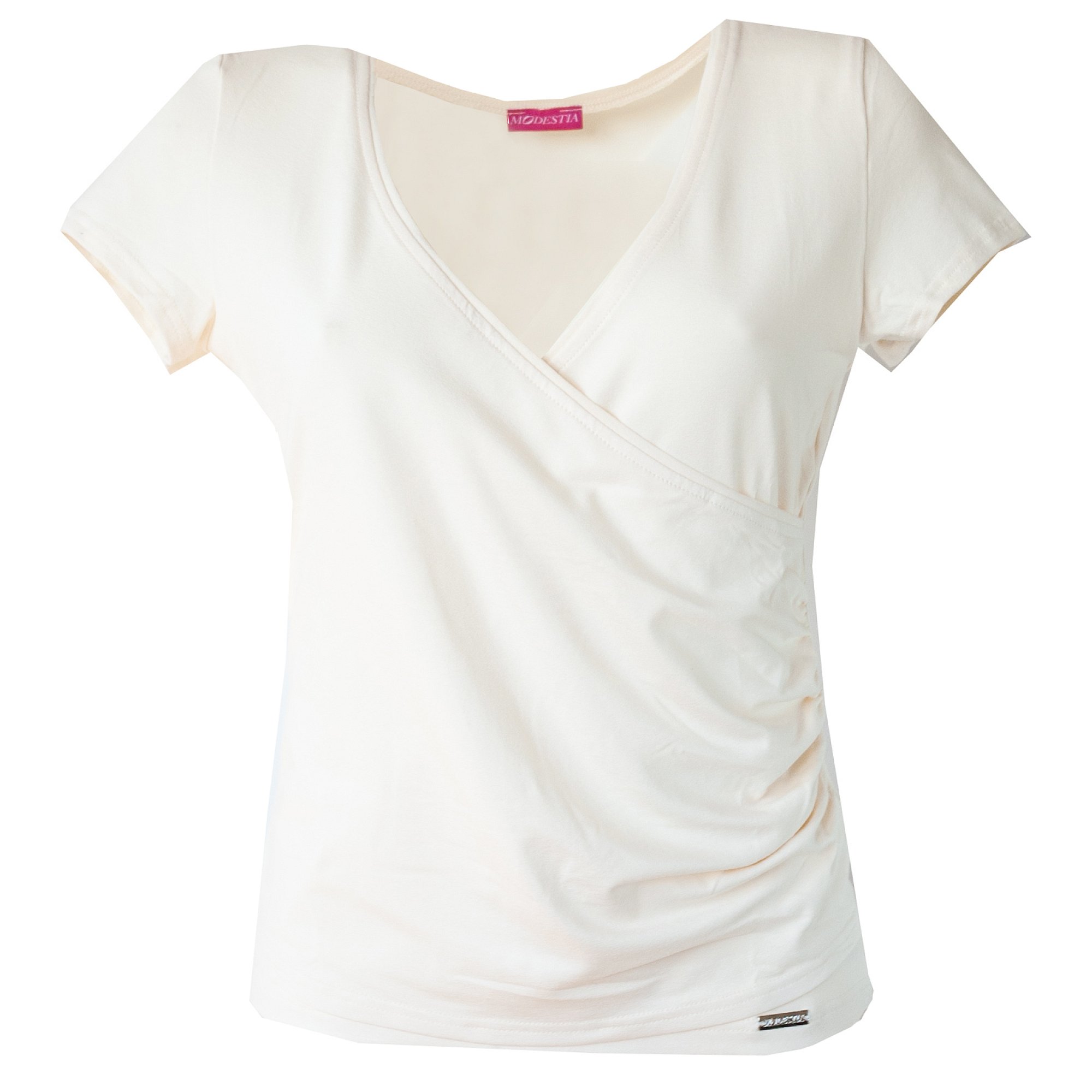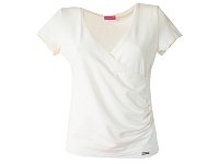 Zajímavě řešené tričko, krátký rukáv, na prsou překřížené, zavinovací vzhled. Po levé straně nařasené. Délka u vel. 38 je 58 cm, stupňování ve vel. po 1,5 cm. Materiál: 95 % viskóza 5 % elastan