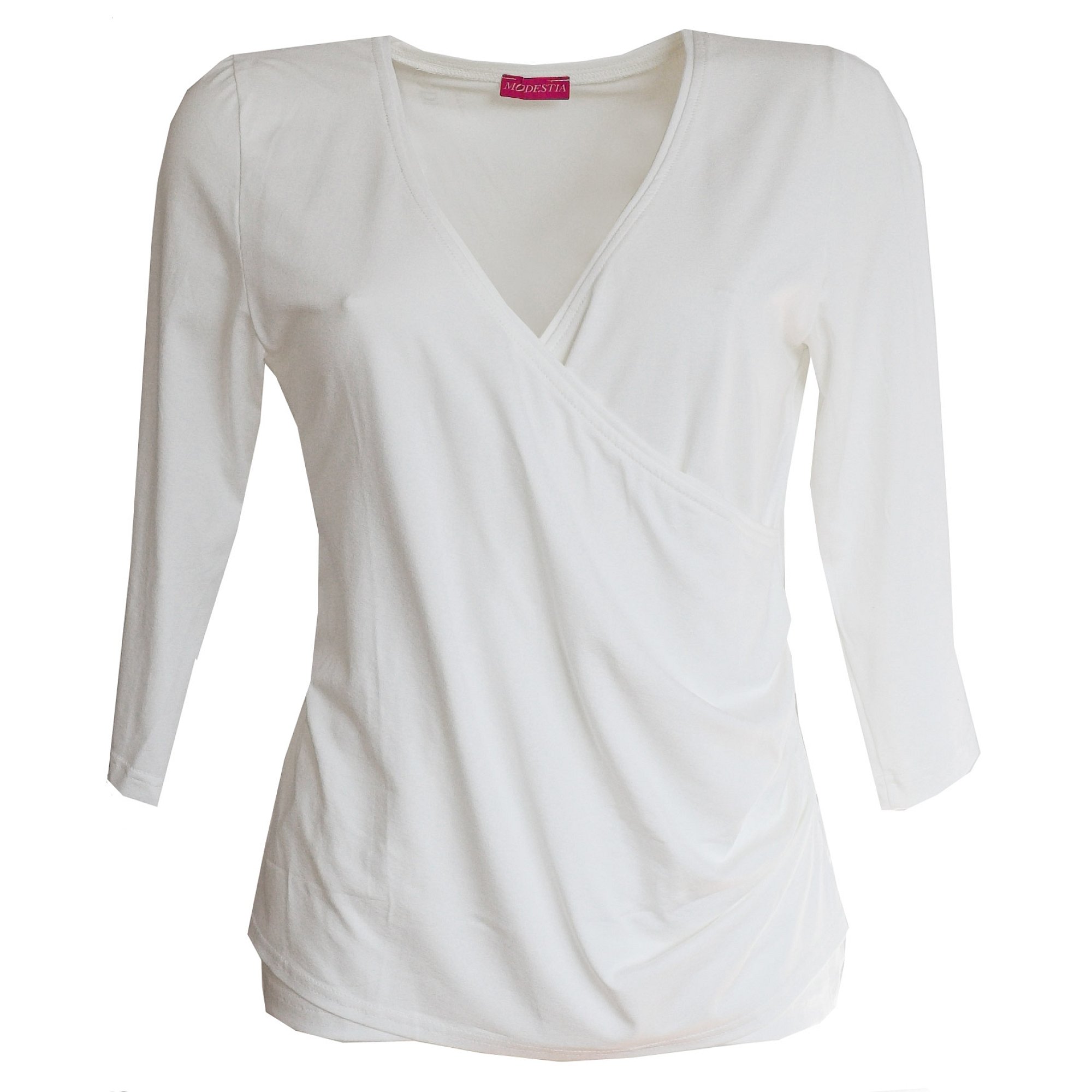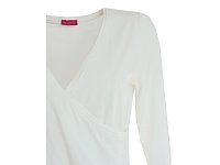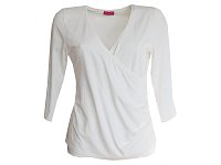 Zajímavě řešená halenka s 3/4 rukávem, na prsou překřížená, zavinovací vzhled. Po levé straně nařasené. Délka u vel. 38 je 58 cm, stupňování ve vel. po 1,5 cm. Materiál: 95 % viskóza 5 % elastan