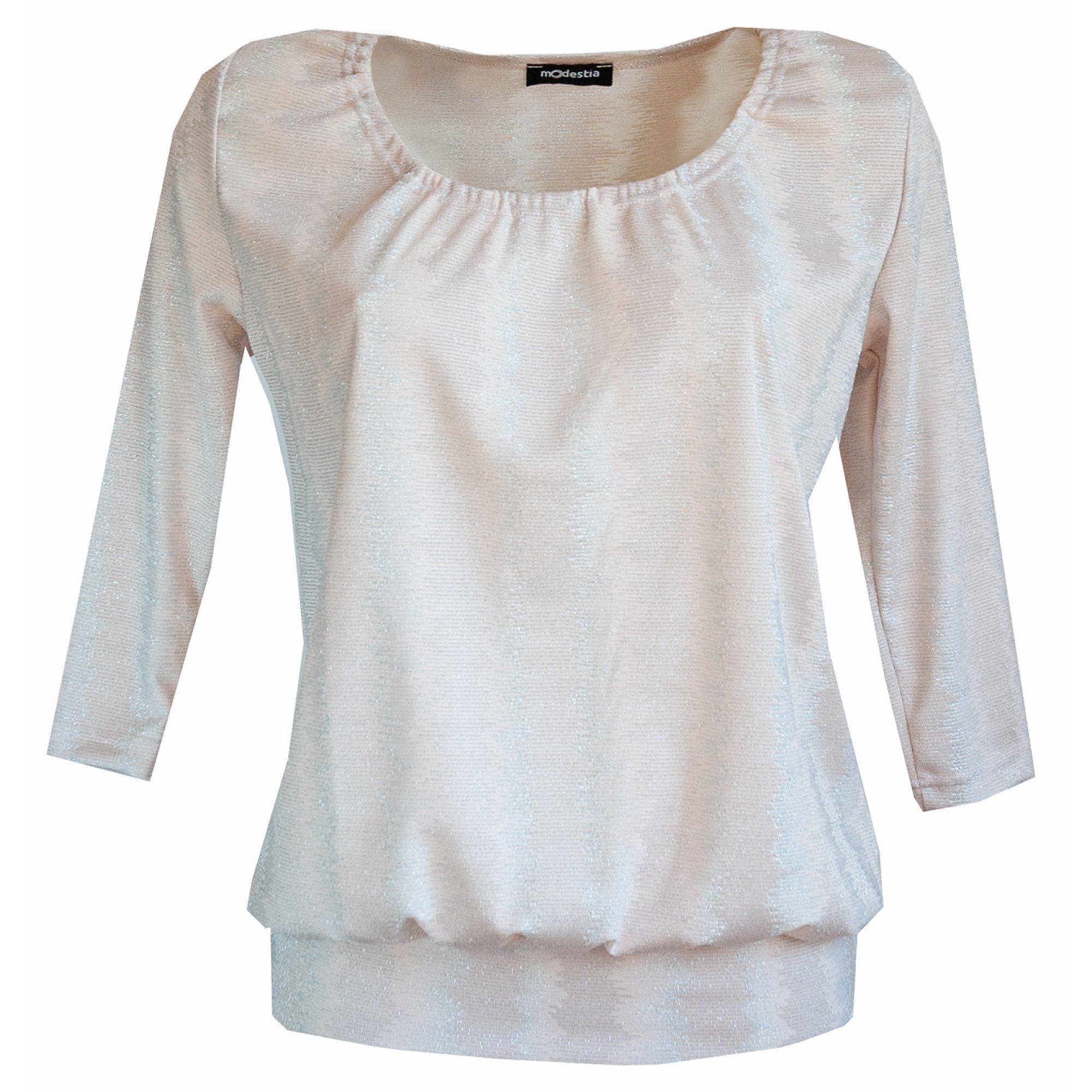 Elegantní společenská halenka s 3/4 rukávem. Nabraná ve výstřihu do gumičky, délka ukončená dvojitým lemem. Lesk v pruzích na světle růžové. Délka u velikosti 38 je 67 cm. Stupňování v délce po 1 cm a