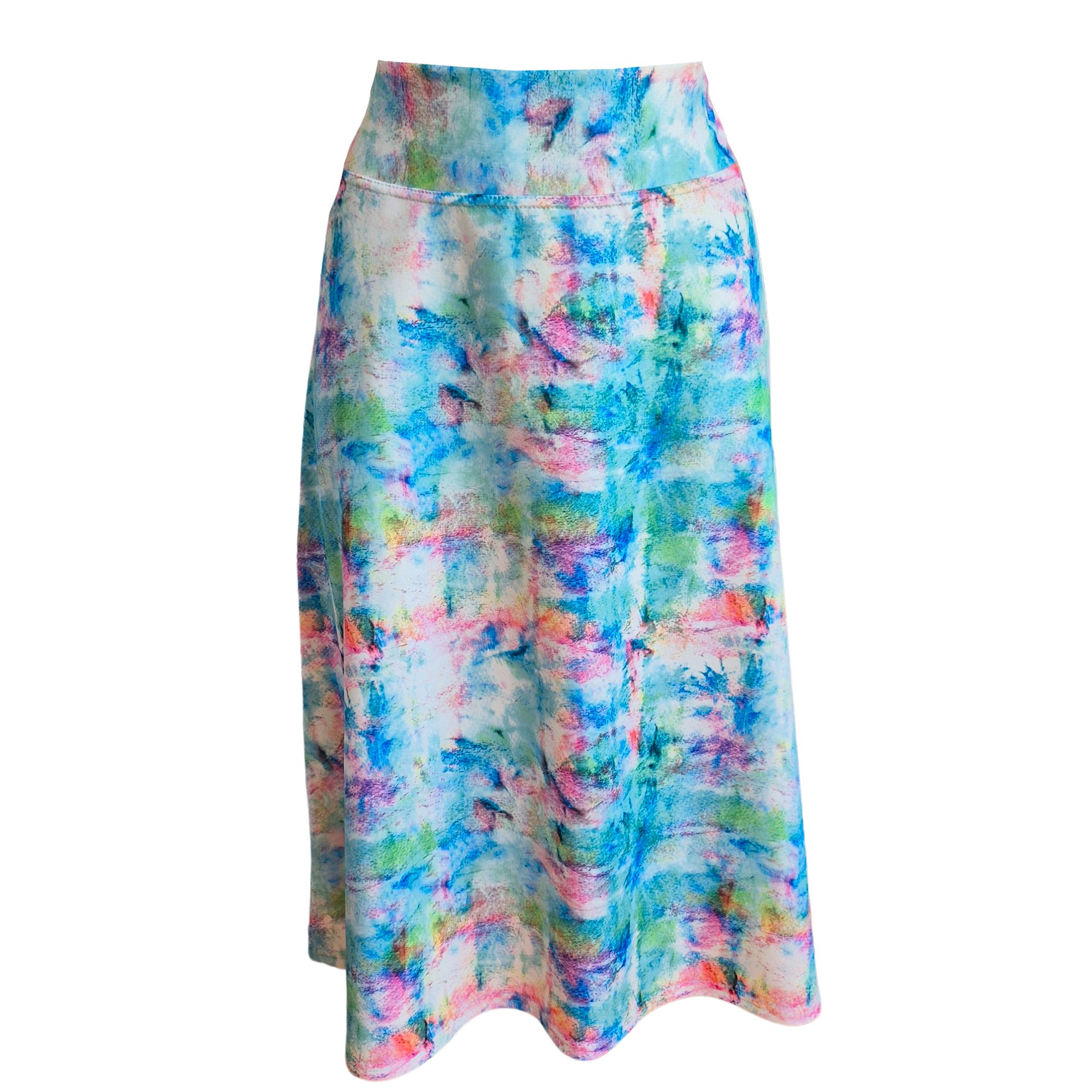 Sukně zaujme svým svěžím, akvarelovým potiskem v pestrých barvách – modré, růžové, zelené i fialové odstíny.Má lehce rozšířený A-střih. Pas je hladký a lehce zvýšený. Délka 57 cm. Materiál nepočesana teplákovina 95% bavlna 5% elastan.
