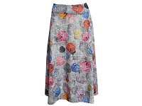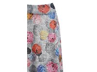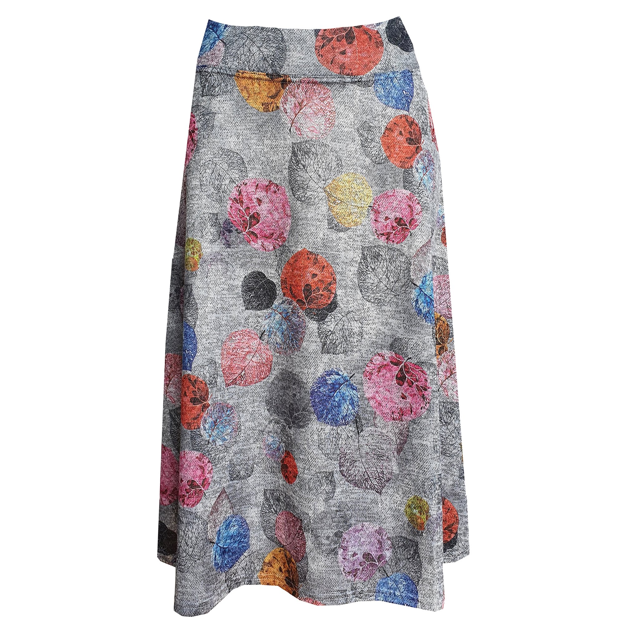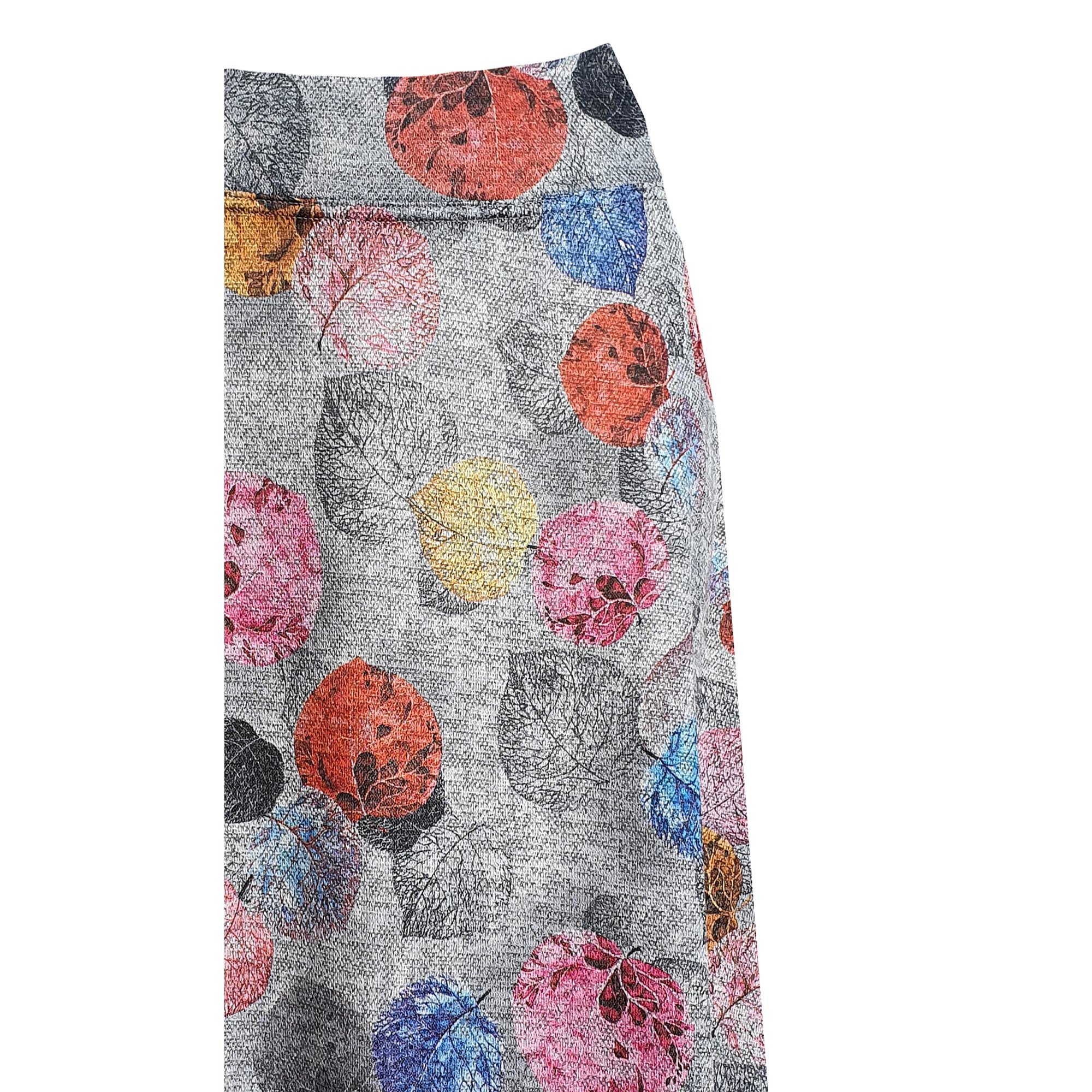 Sukně ze svetrového materiálu s tiskem barevných listů na světle šedé. Elastický pas. Délka 70 cm. Pereme v pračce na 30°. Materiál: 74% polyester 21% viskóza 5% elastan