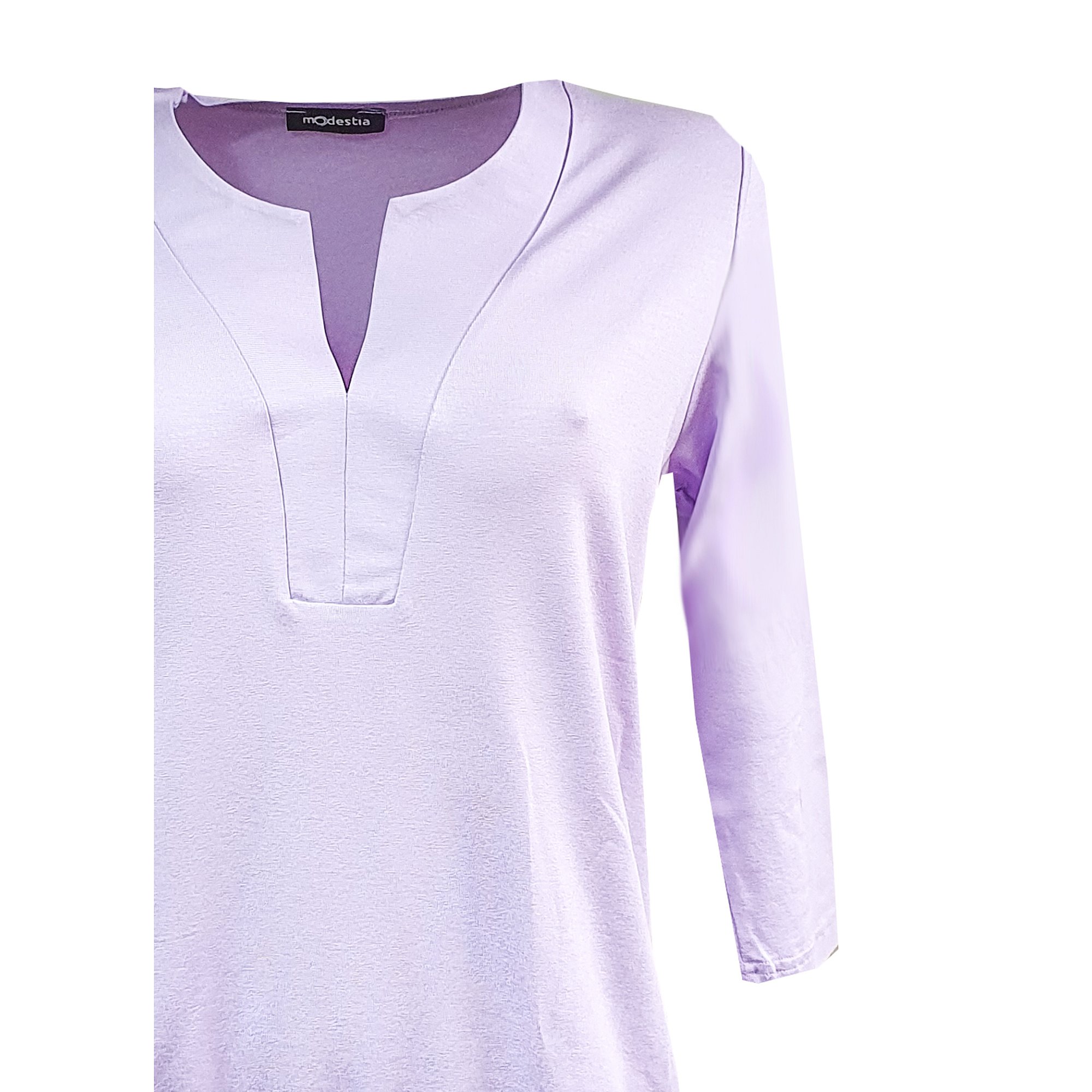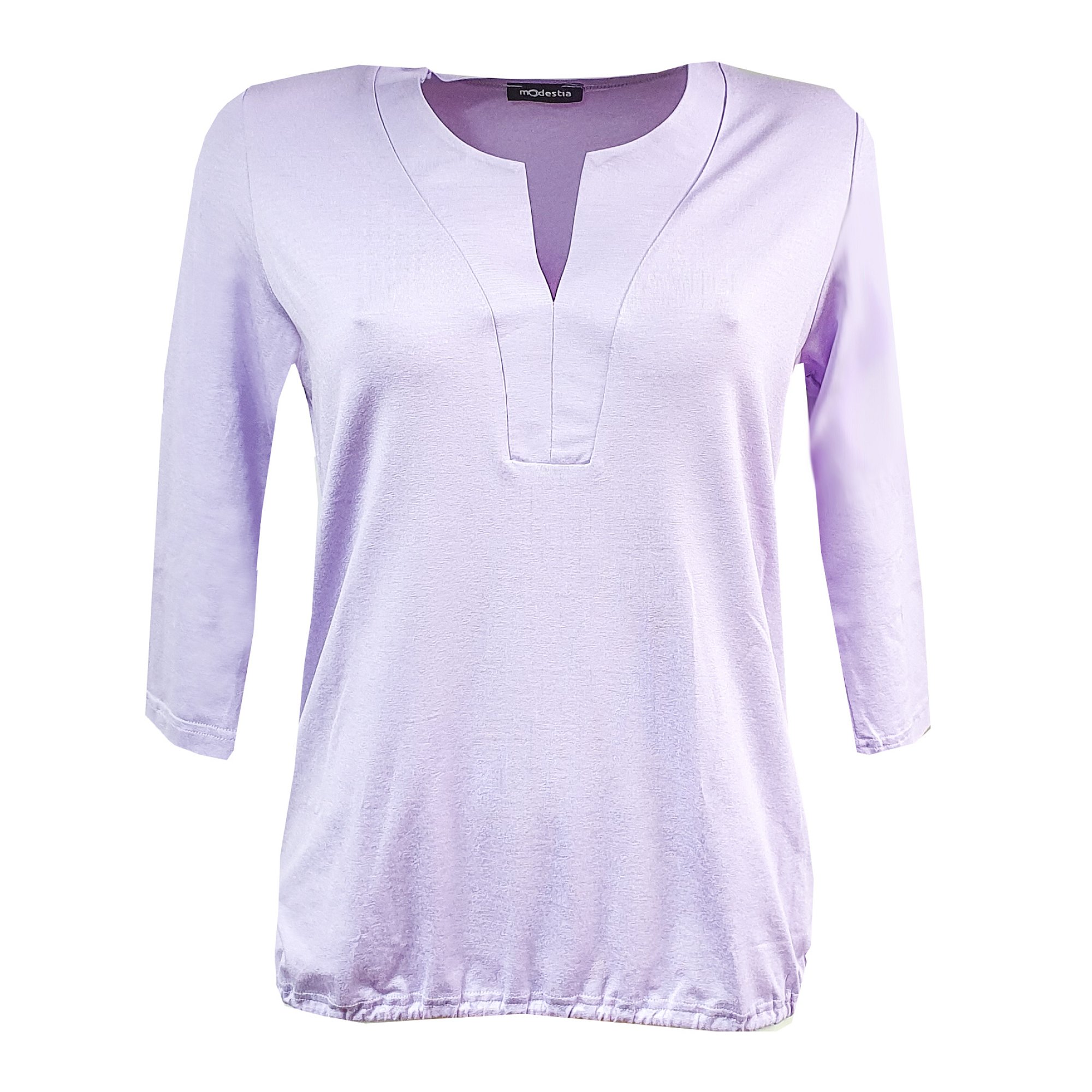 Dámská halenka volnějšího střihu s kulatým výstřihem s prostřihem ve světle fialové barvě. Spodní lem nabraný do gumičky. (Gumička je pouze navlečená - lze jednoduše vytáhnout.) Pereme v pračce na 30°. 95% viskóza 5% elastan