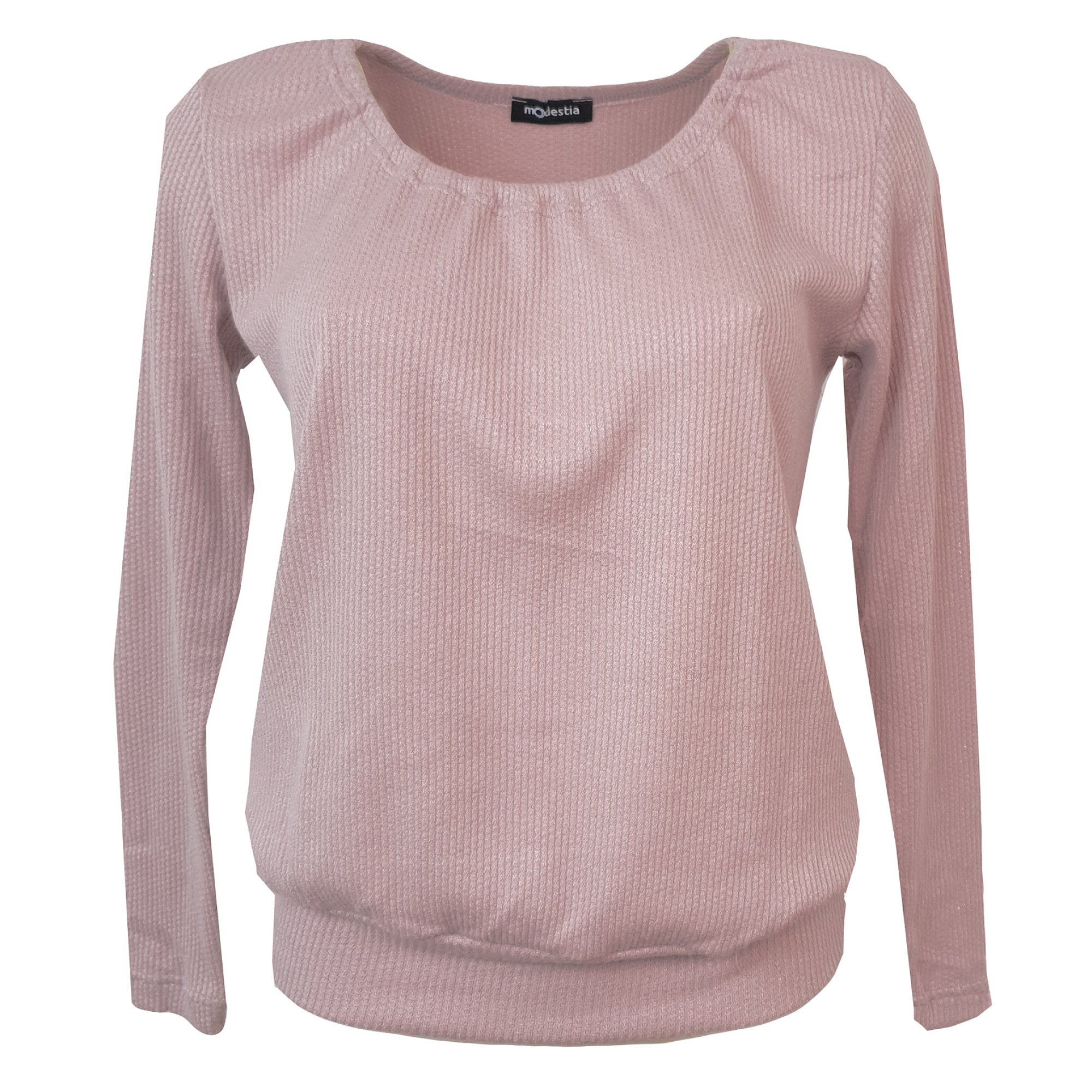 Halenka z měkkého svetrového materiálu s dlouhým rukávem. Nabraná ve výstřihu do gumičky, délka ukončená dvojitým lemem. Barva světle růžová. Pereme na 30°. Materiál: 74% polyester 21% viskóza 5% elas