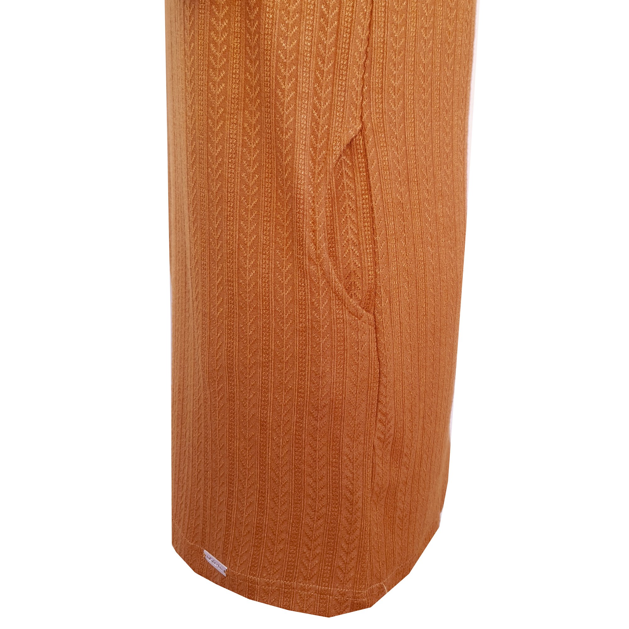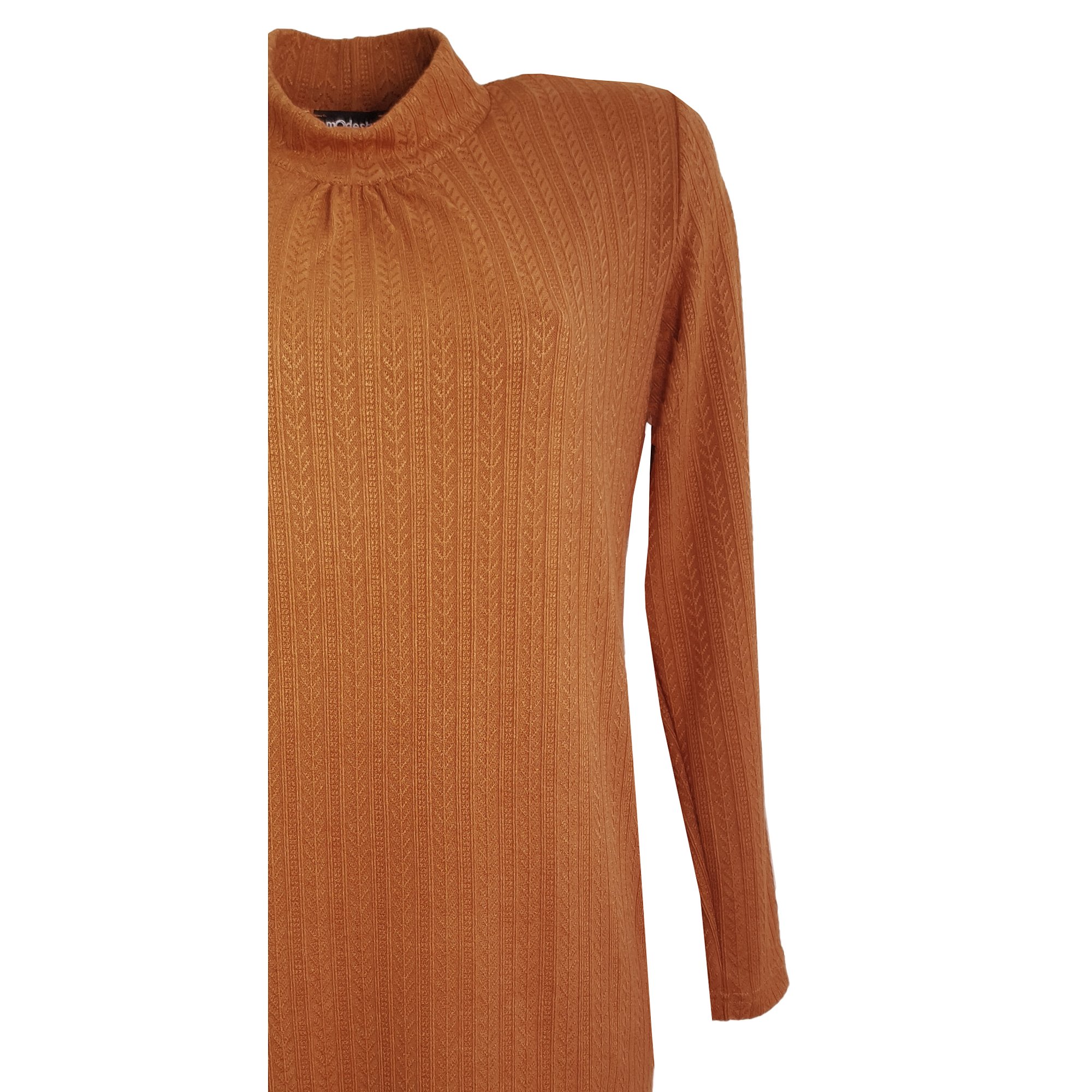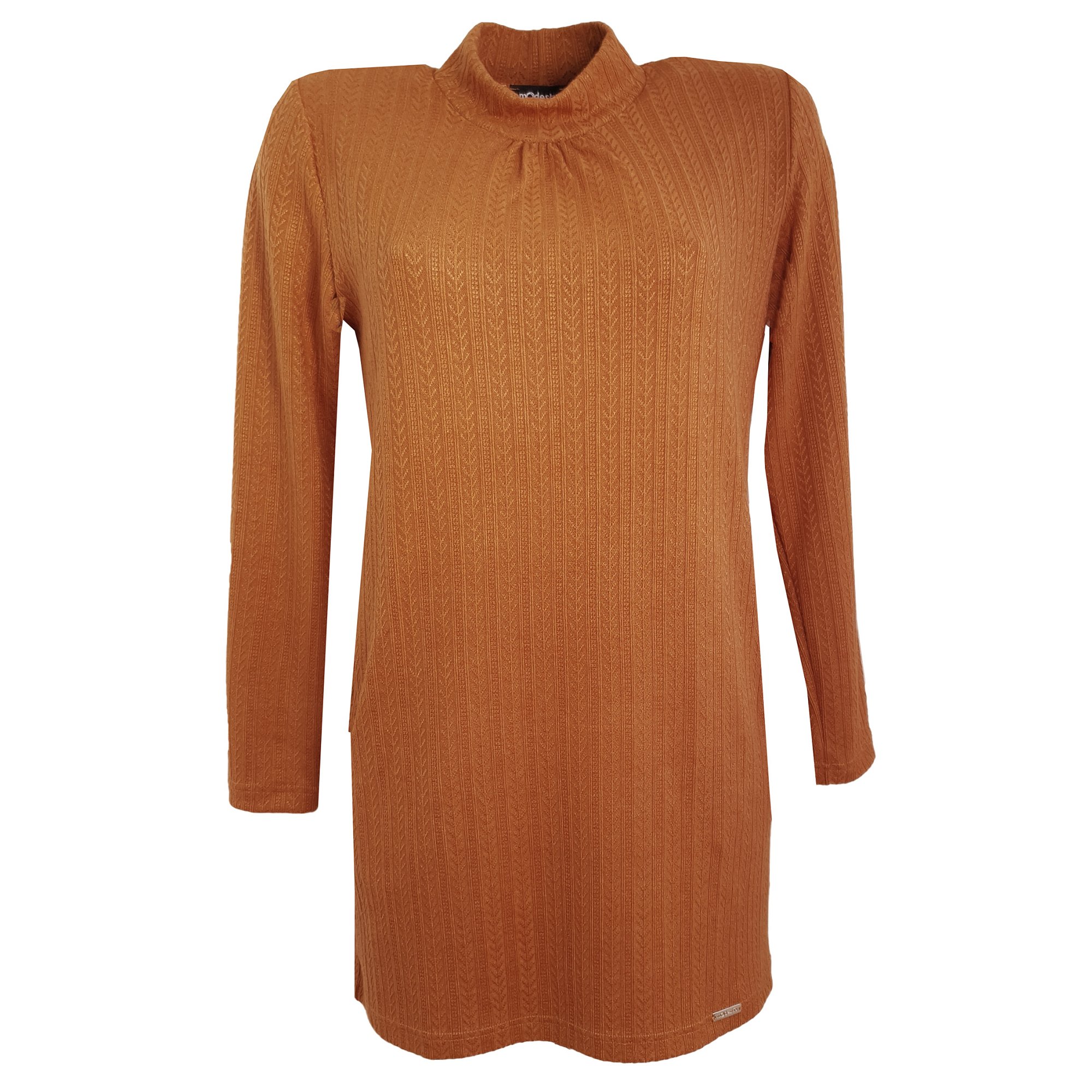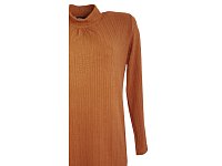 Tunika ze svetrového materiálu v tmavě pískové barvě s jemným plastickým vzorem s dlouhým rukávem. Tady je video. Elegantní módní stojáček s řasením a kapsy na boku. Délka 80 cm.