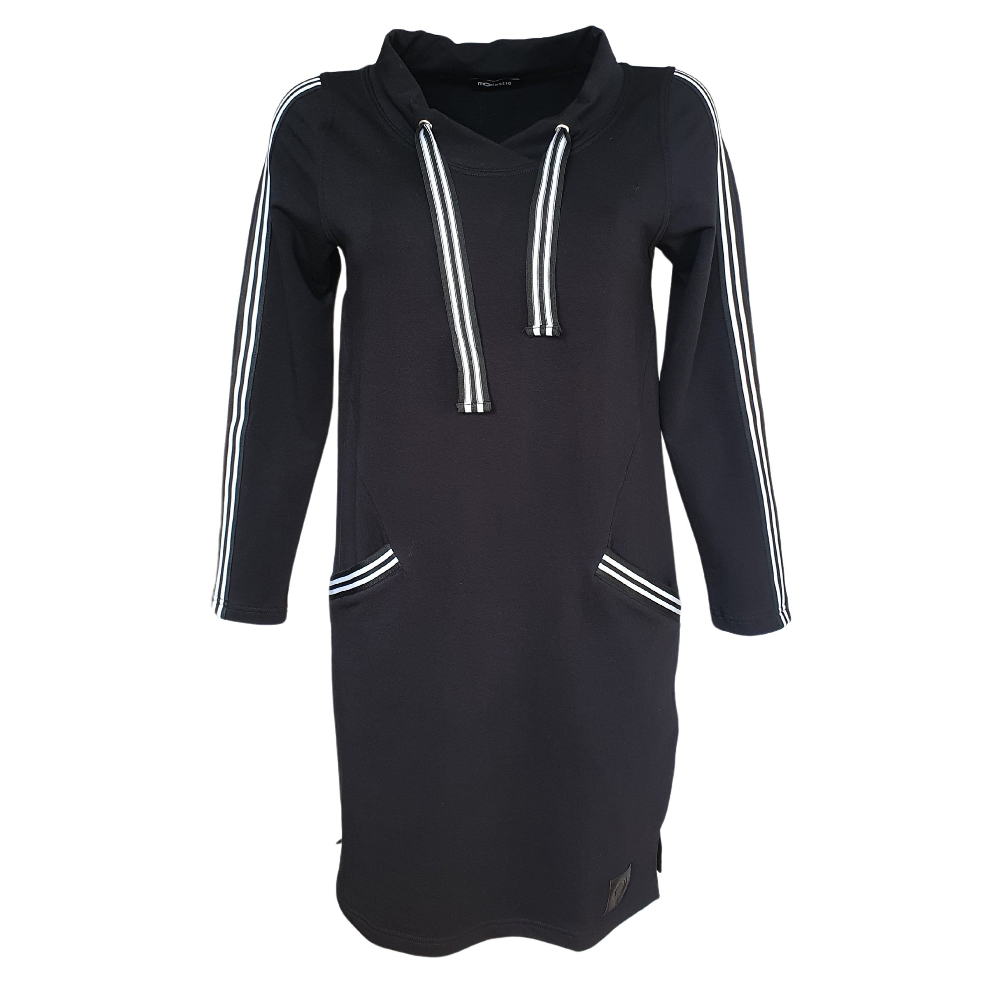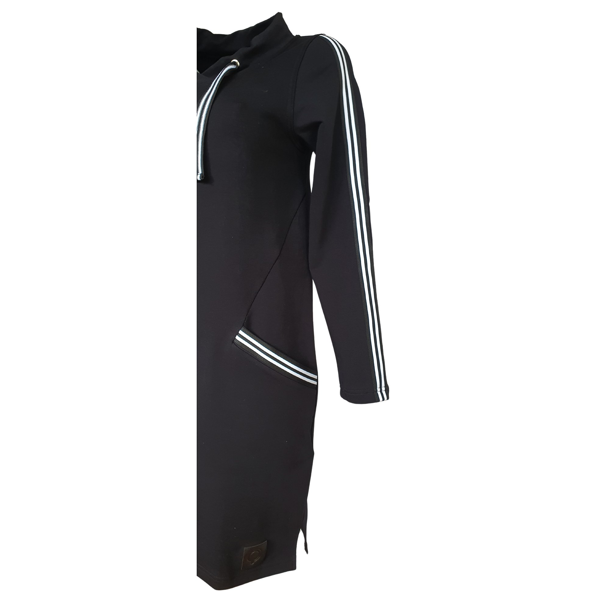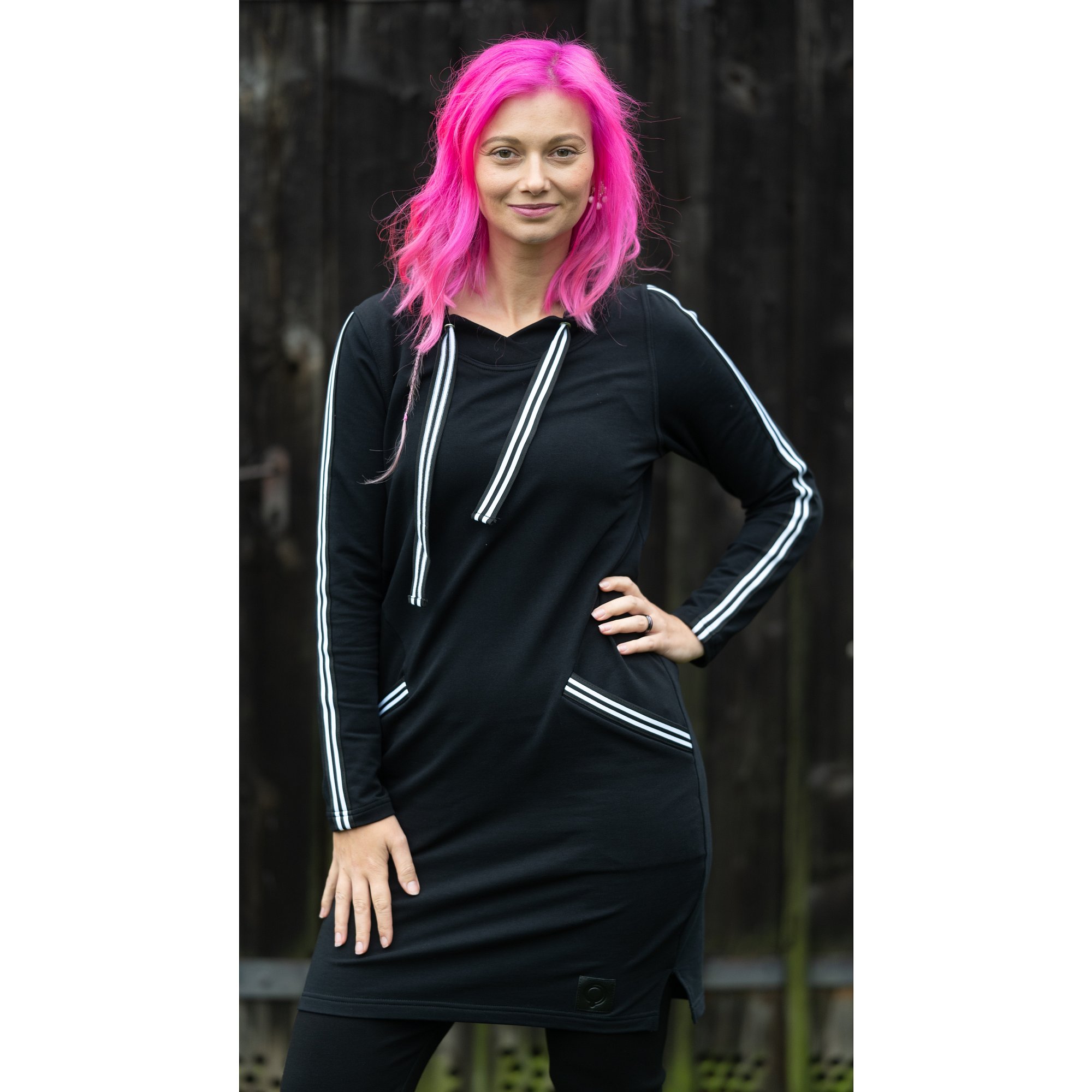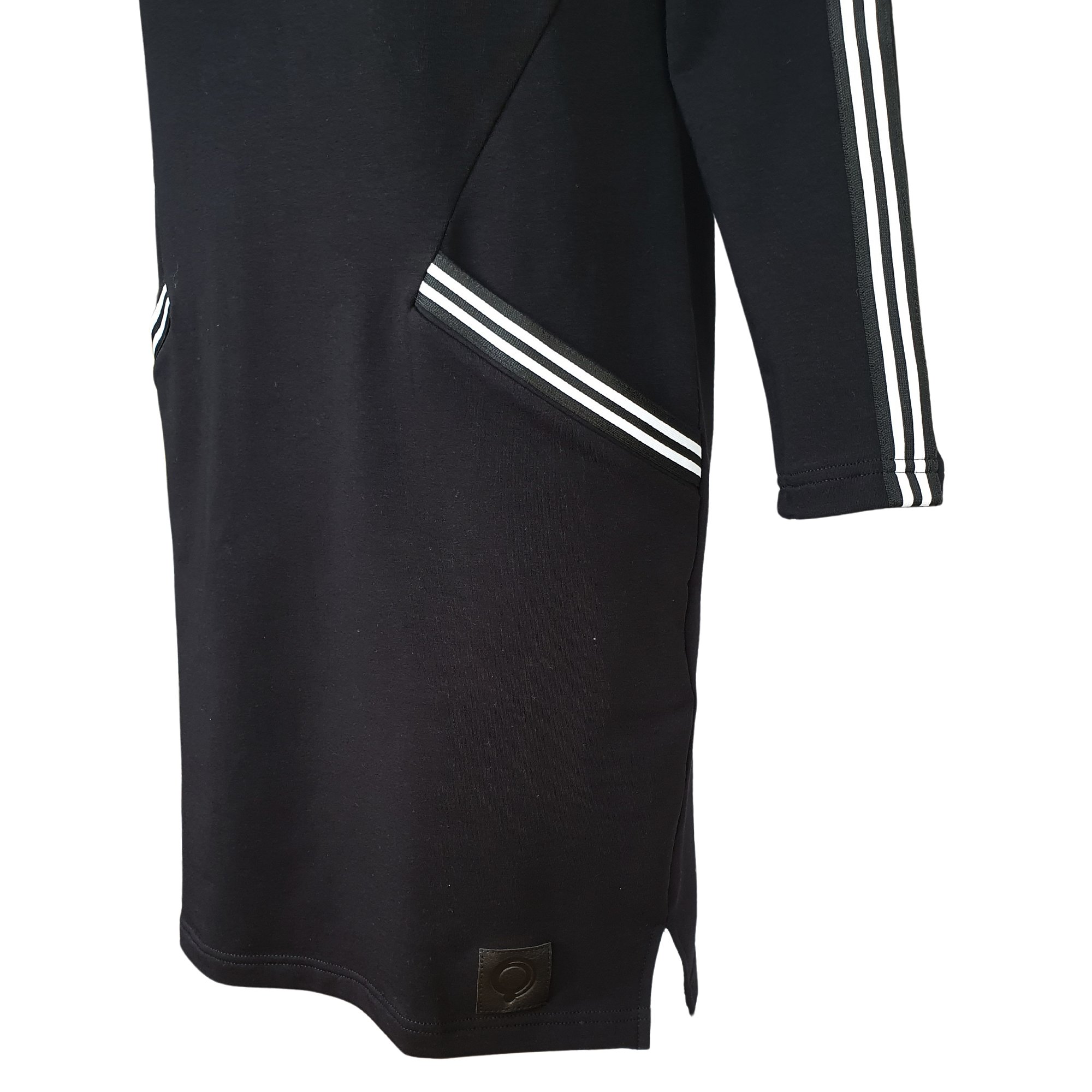 Tunika v černé barvě s praktické kapsy a kontrastními černo-bílými pruhy.Délka 90 cm.Tady je video. Tunika má vysoký límec s černobílými šňůrkami.Materiál 97% bavlna,3%elastan