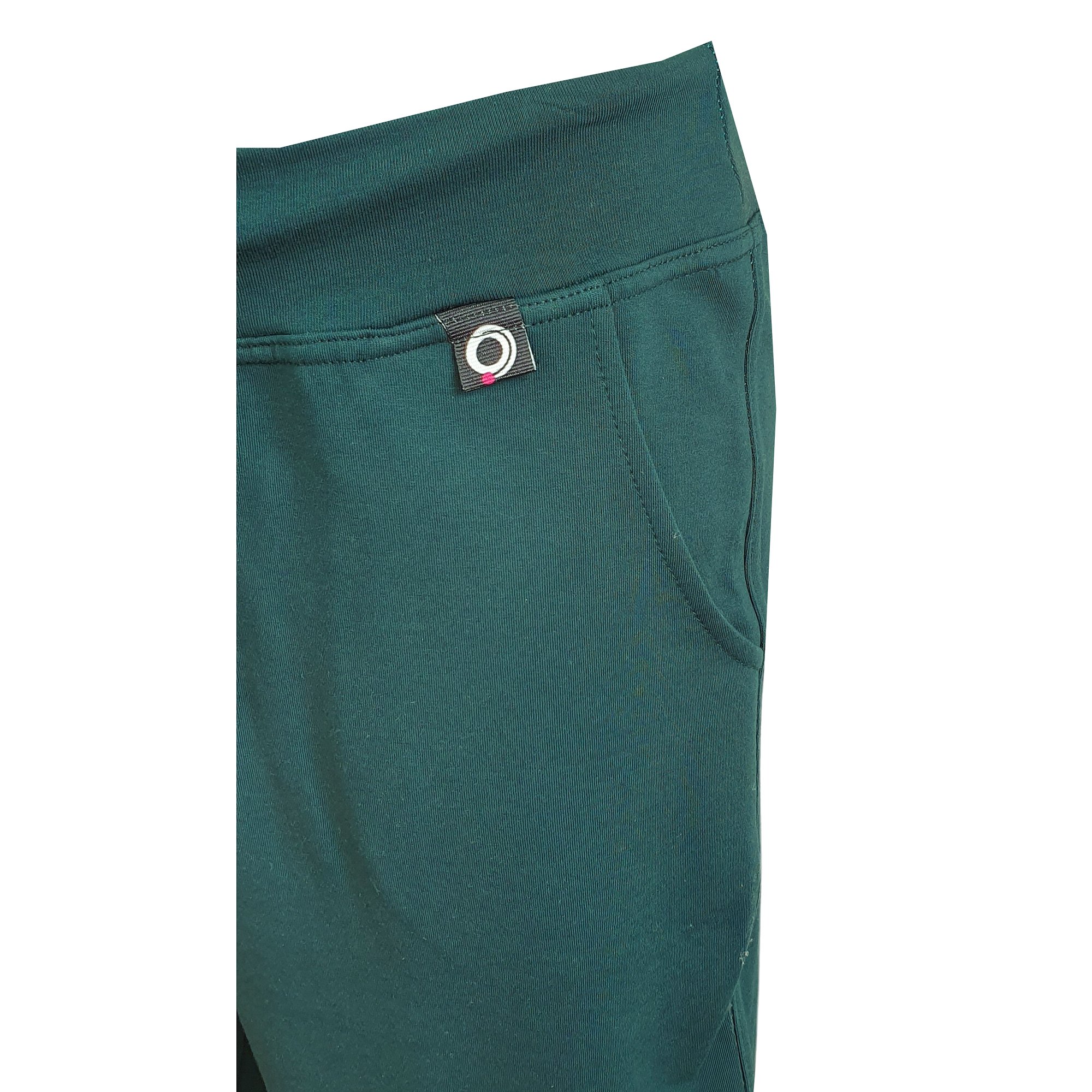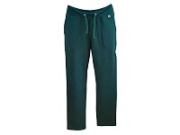 Kalhoty z teplákoviny v lahvově zelené barvě s kapsami. Pereme v pračce na 30°. 97% bavlna 3% elastan