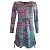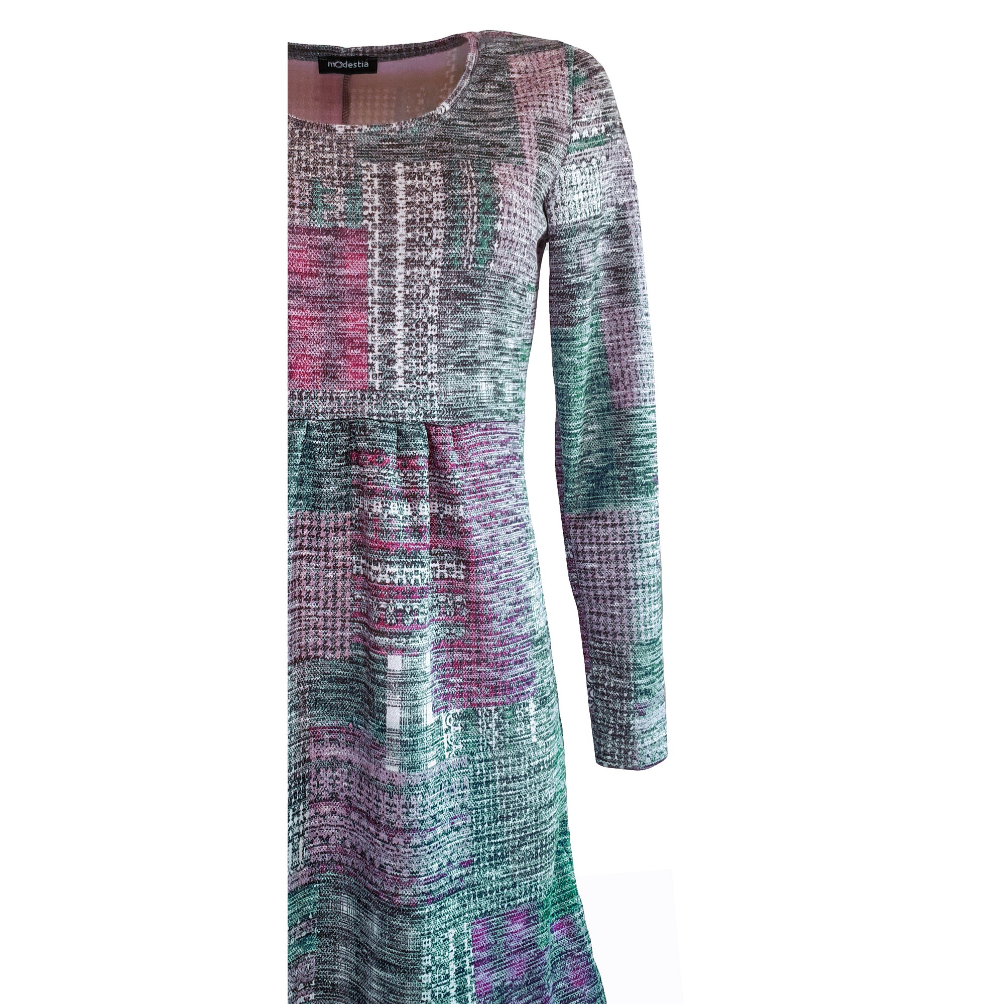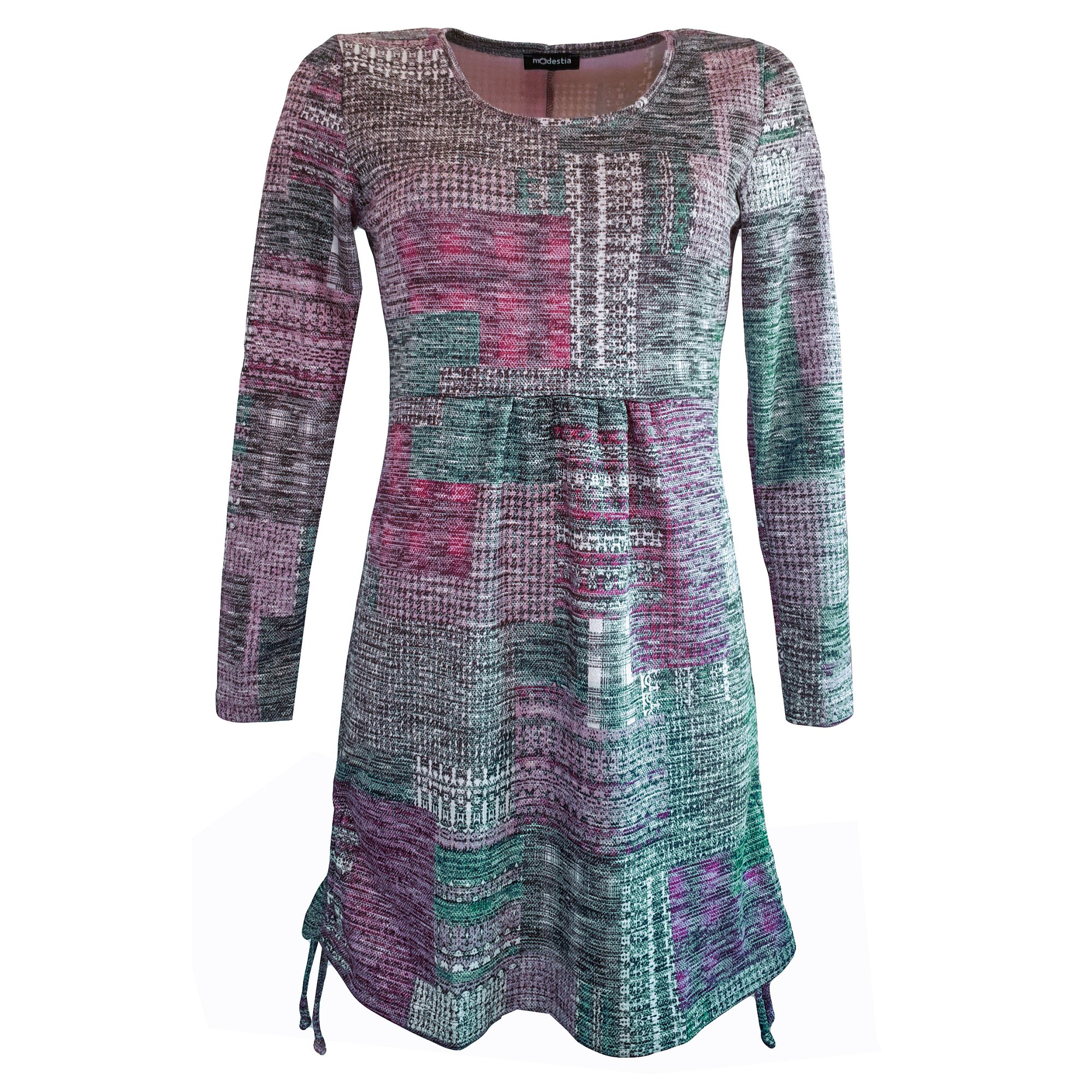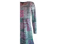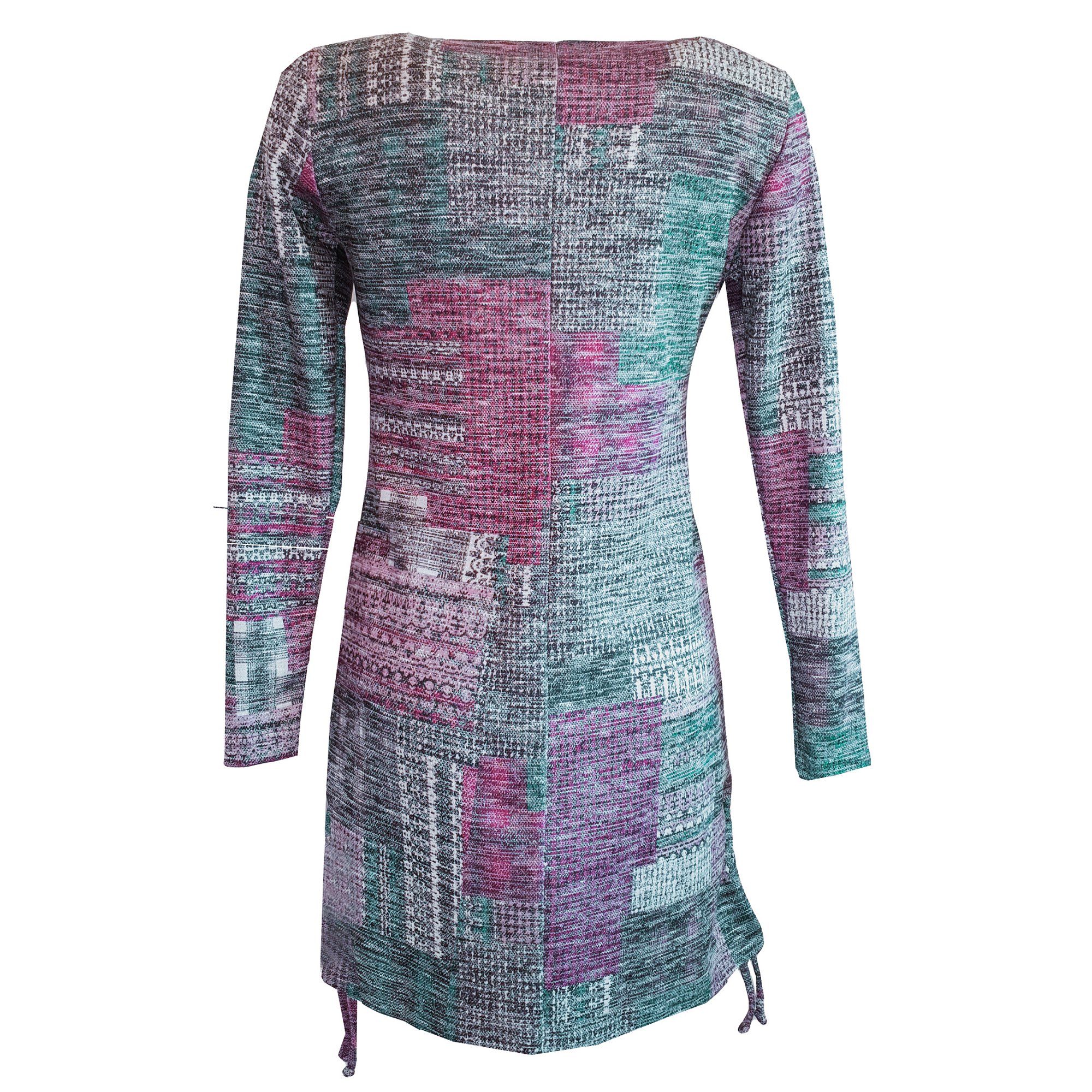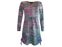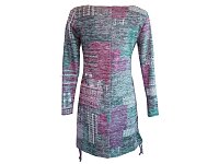Tunika s dlouhým rukávem, nabraná do sedla, svetrový materiál. V bočních švech jsou všité tkaničky na stažení - upravení délky. Barva šedá s vínovo zeleno hnědým geometrickým tiskem.