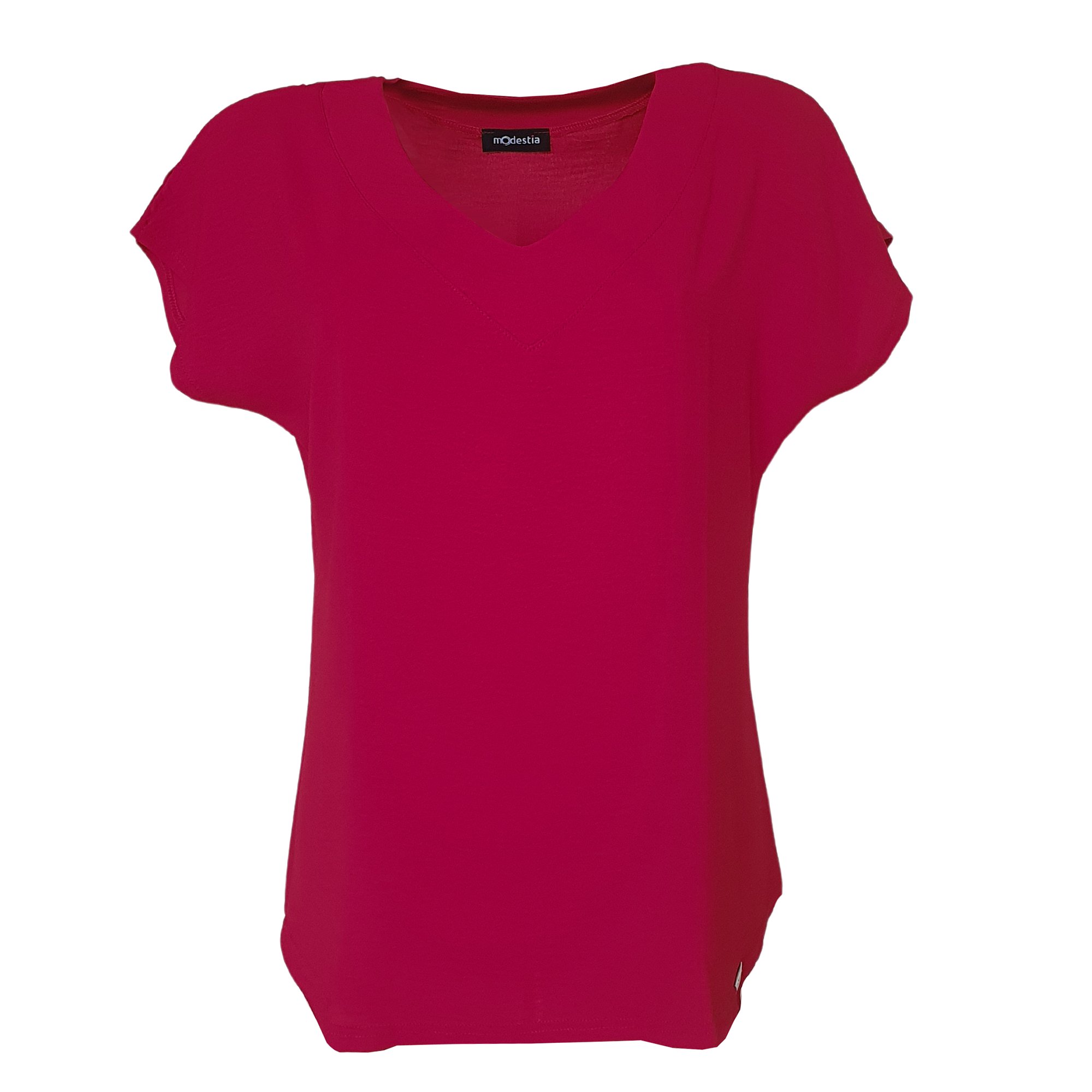 Volné triko s kimonovým rukávem s krásným širokým výstřihem do V v tmavě červené barvě. Pereme v pračce na 30°. 95% viskóza 5% elestan