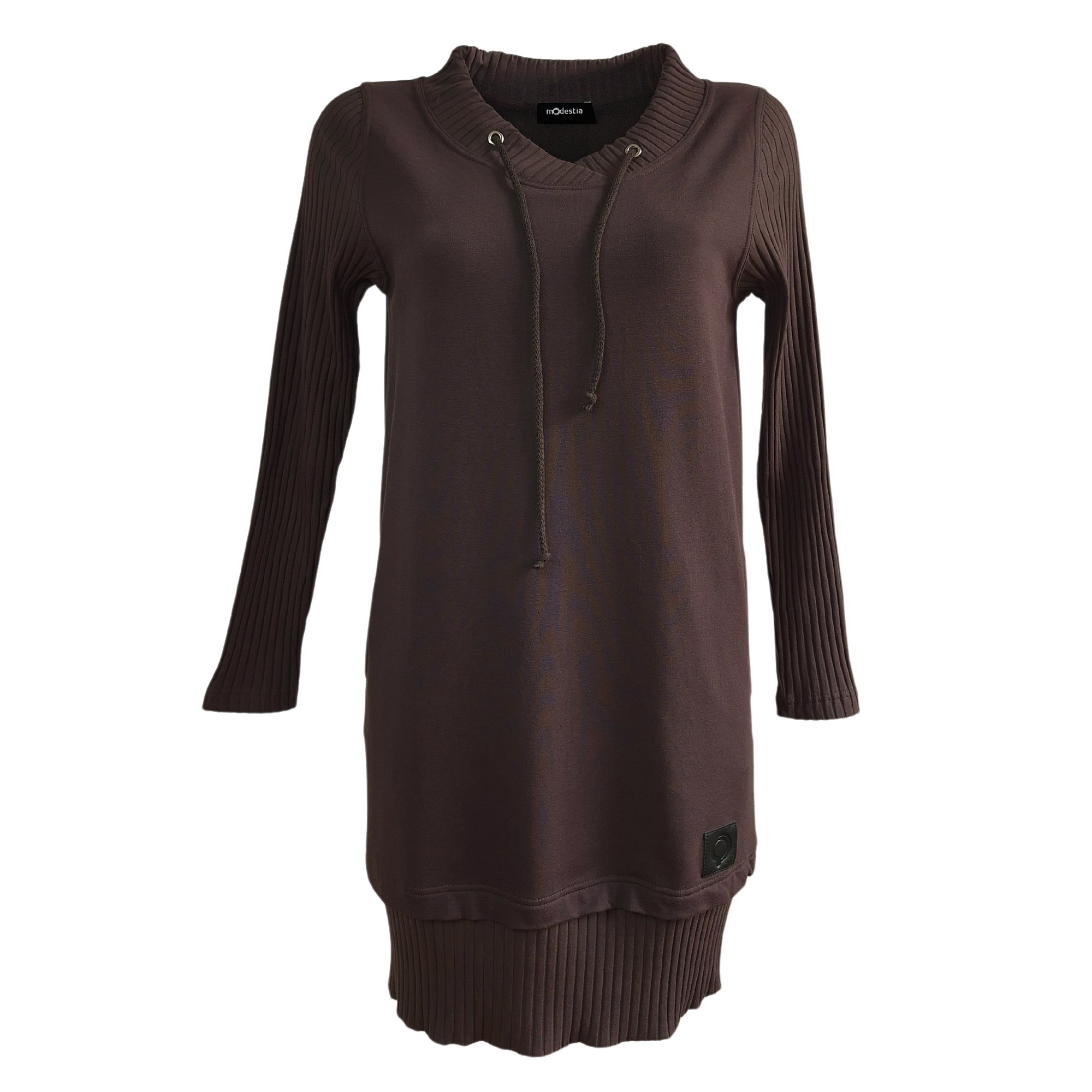 Naše tmavě hnědé mikinové šaty mají jednoduchý, ale stylový střih s dlouhými žebrovanými rukávy,žebrovaným spodním lemem a bočními kapsami.Kulatý výstřih je doplněn šňůrkami k lehké regulaci u krku.Délka 88 cm. Materiál 95% bavlna, 5% elastan.