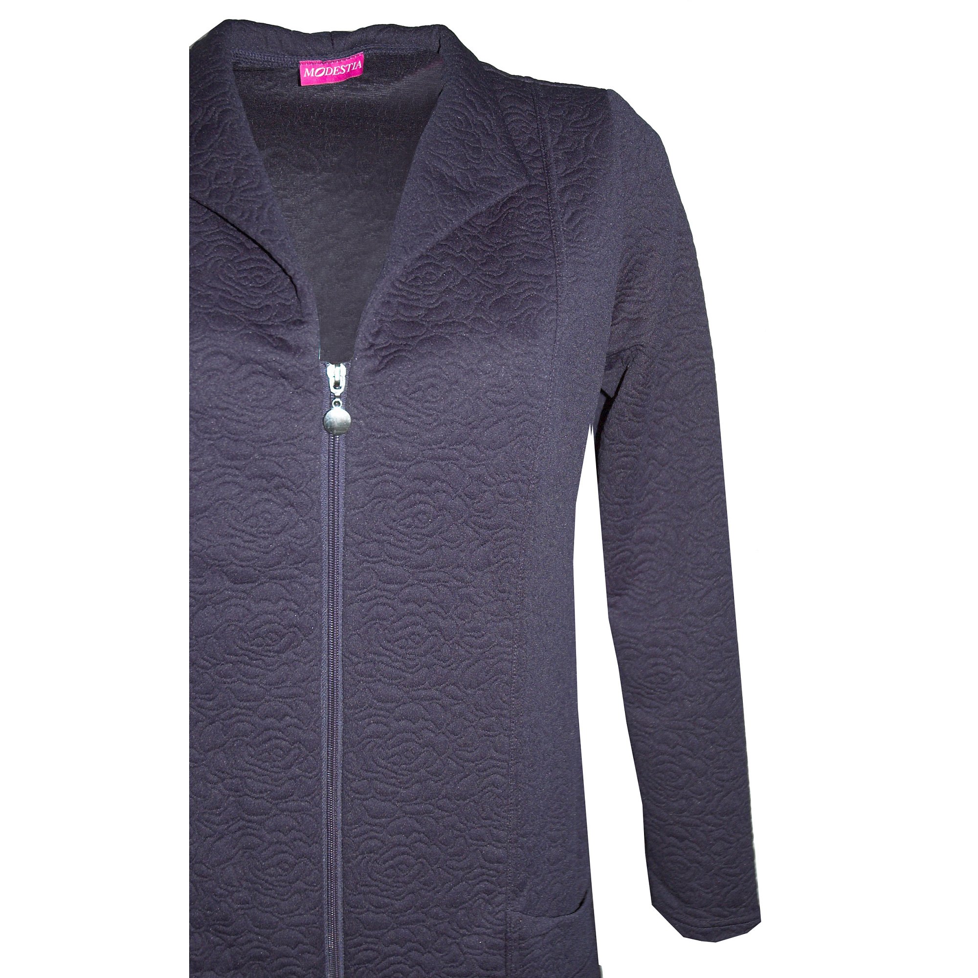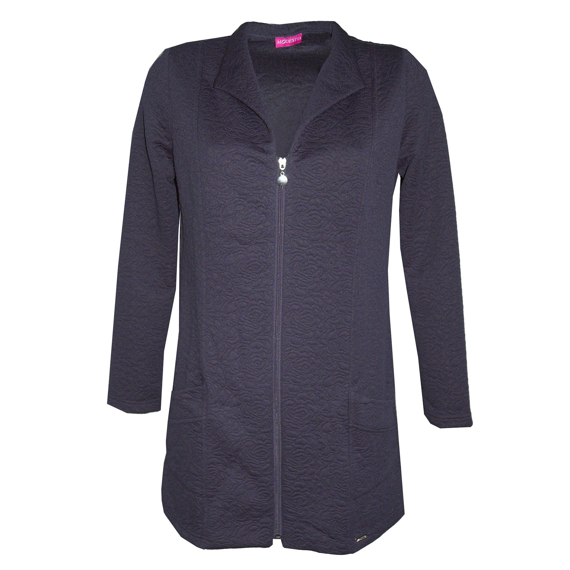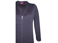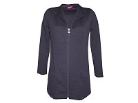 Elegantní prodloužený kabátek na zip. Barva tmavě modrá s vytlačovaným vzorem květů. Délka 85 cm. Pereme v pračce na 30°. Materiál: 74% polyester 21% viskóza 5% elastan