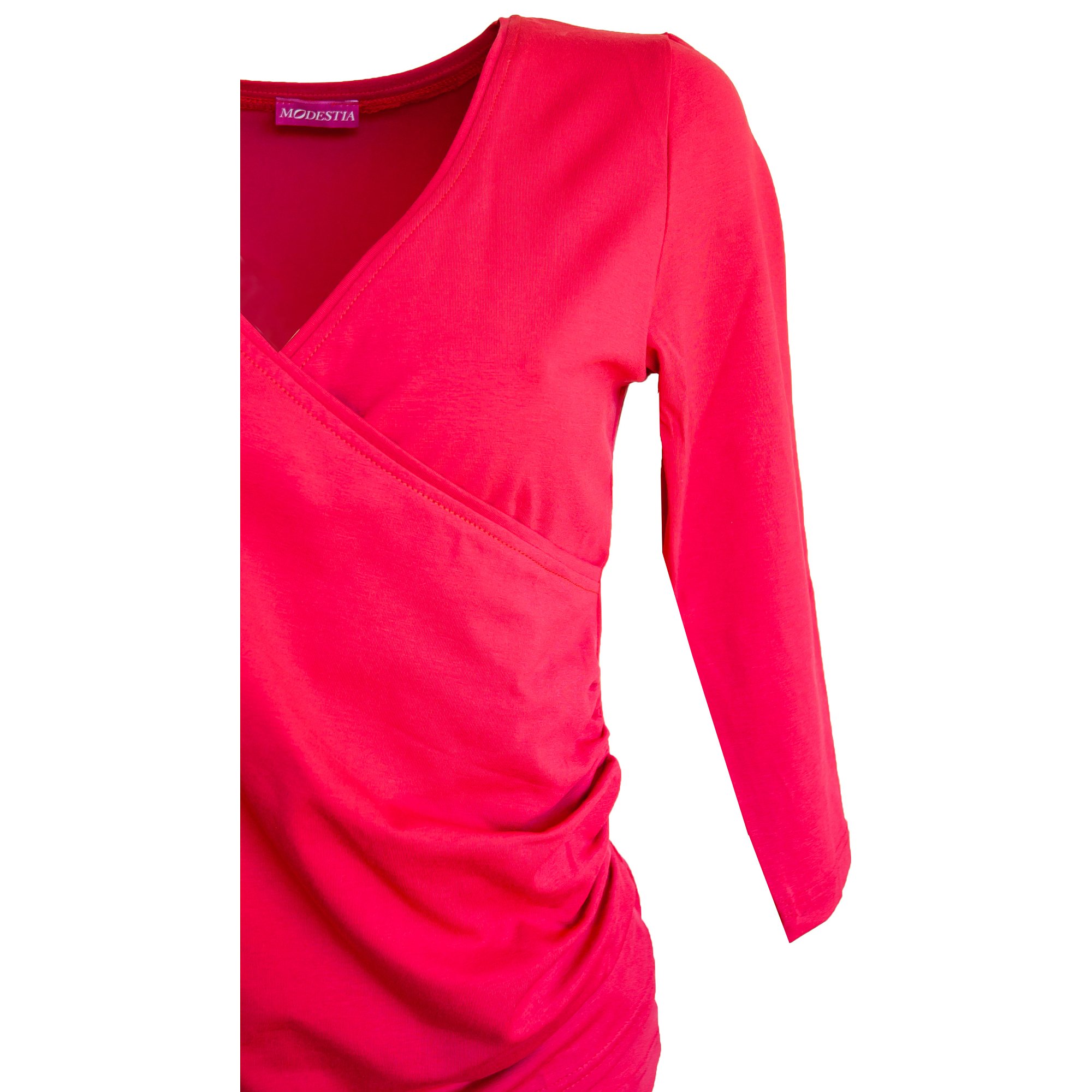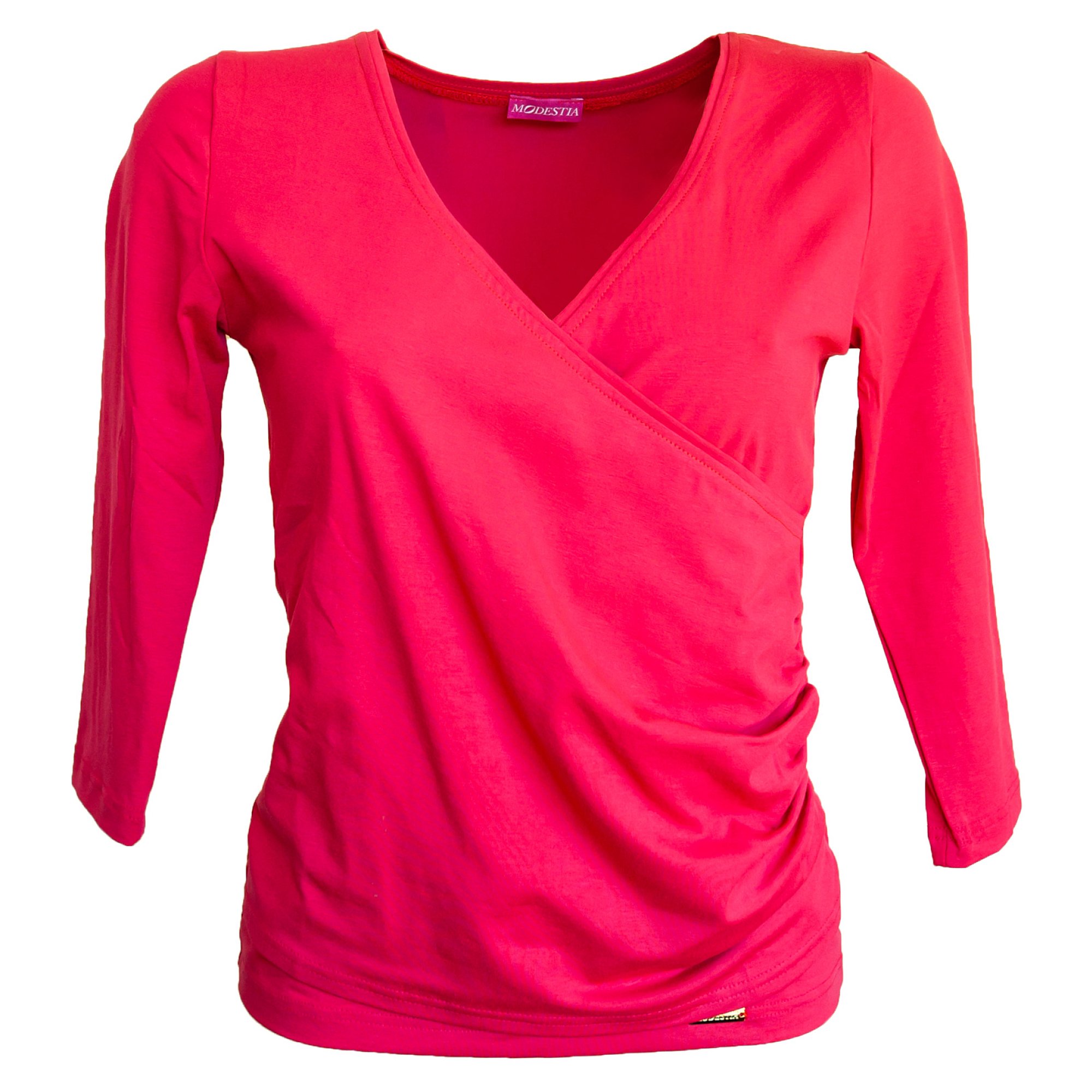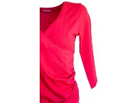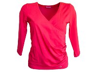 Zajímavě řešená halenka s 3/4 rukávem, na prsou překřížená, zavinovací vzhled. Po levé straně nařasené. Délka u vel. 38 je 58 cm, stupňování ve vel. po 1,5 cm. Barva tmavě růžová. Materiál: 95 % viskó