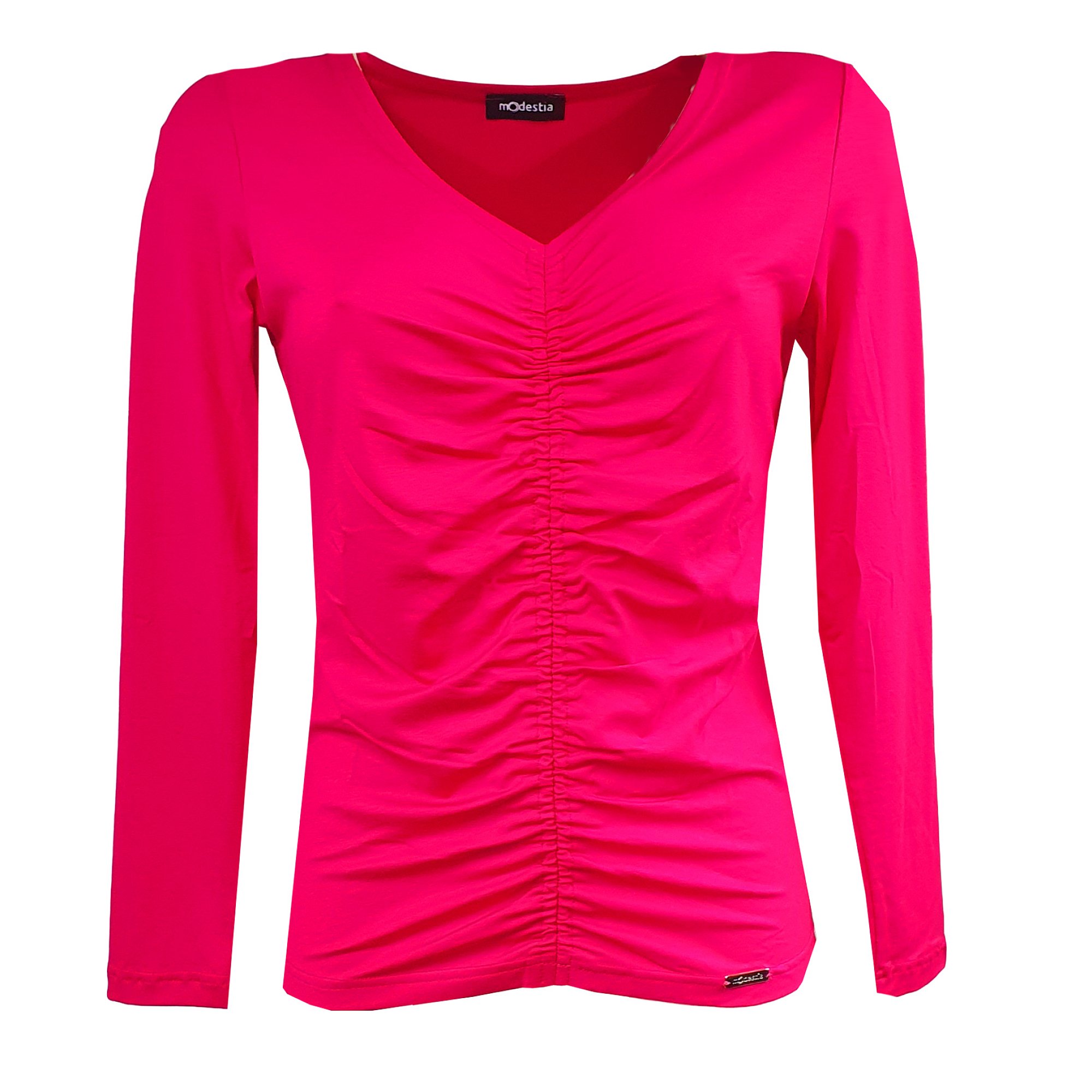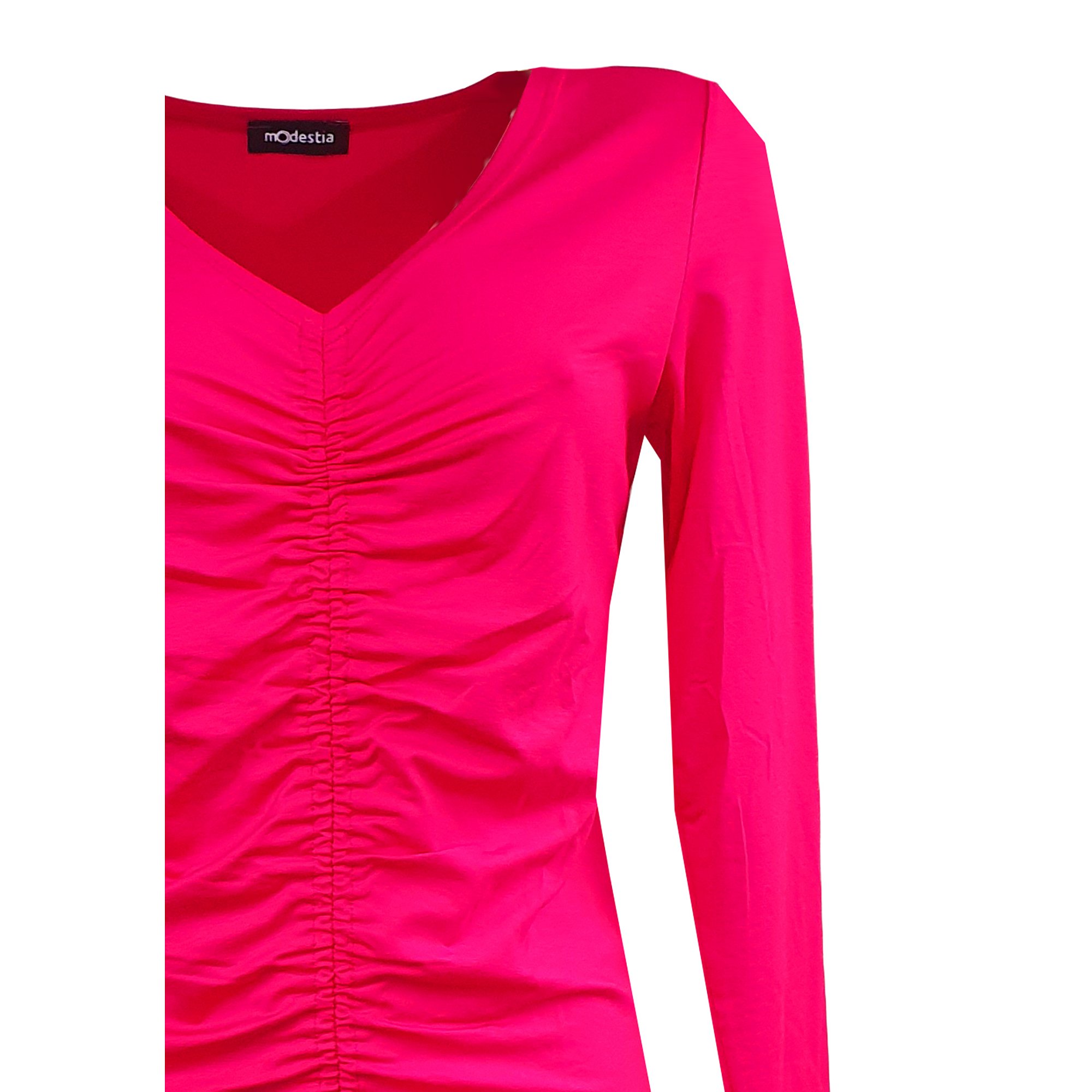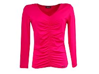 Zajímavě řešený top s výstřihem do V s dlouhým rukávem. Od výstřihu až dolů řasení do gumičky. Barva jahodová.Tady je video. 95% viskóza 5% elastan