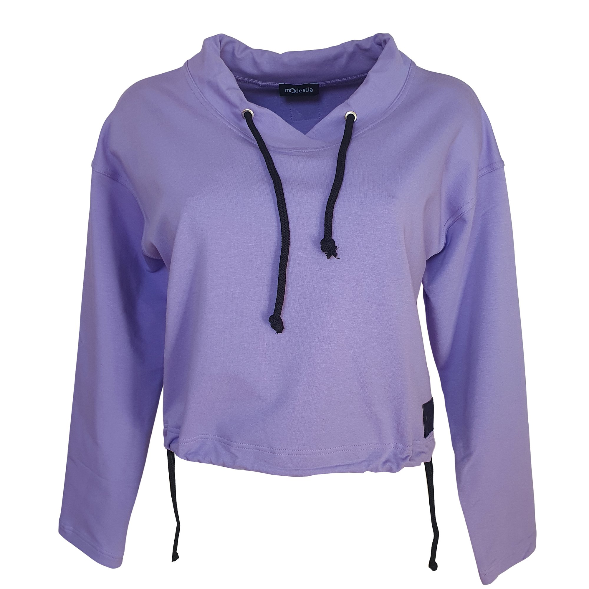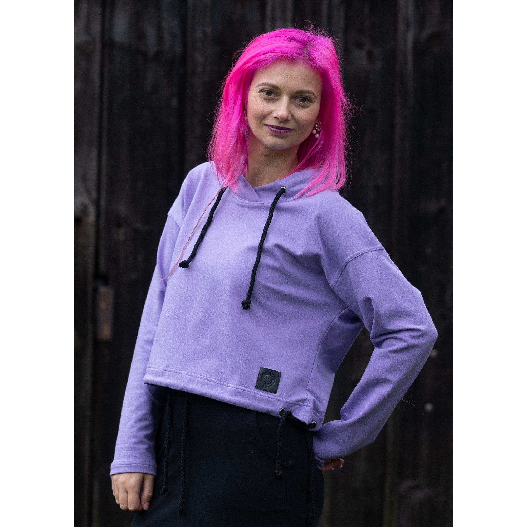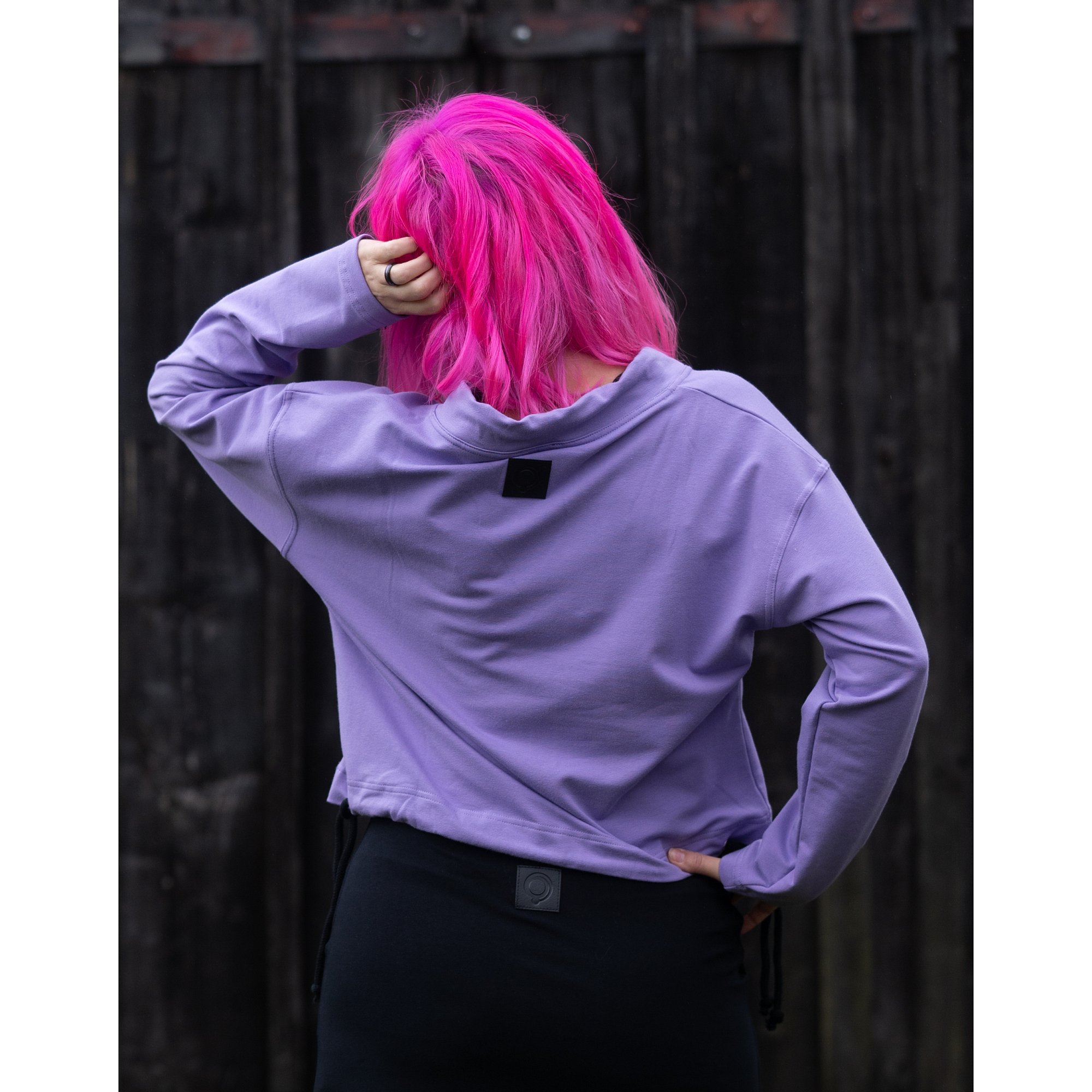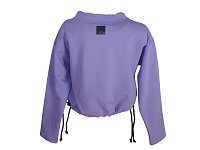 Módní Crop top ve fialové barvě s dlouhým rukávem a stojákem se šňůrou u krku. Šňůry na stažení v pase.Tady je video. Délka 50 cm. Materiál: 97% bavlna, 3% elastan.