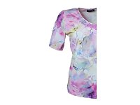 Světlé triko v pastelových barvách s krátkými rukávy s lemovaným výstřihem. Délka u vel. 38 je 54 cm, stupňování v délce po 1,5 cm. Pereme v pračce na 30° 95% viskóza 5% elastan