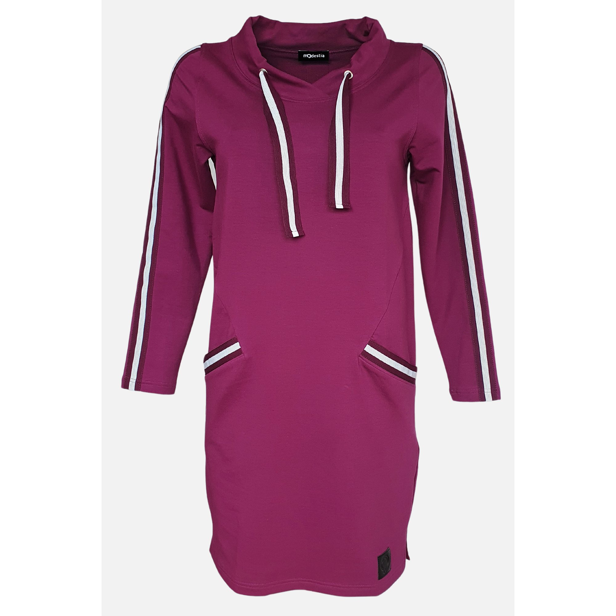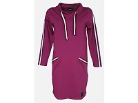Tunika ve vínové barvě s praktickými kapsy a kontrastními vínovo-bílými pruhy. Tunika má vysoký límec se stahovacími šňůrkami. Délka 90 cm. Materiál 97% bavlna,3% elastan.