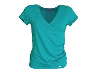 Zajímavě řešené tričko, krátký rukáv, na prsou překřížené, zavinovací vzhled. Po levé straně nařasené. Délka u vel. 38 je 58 cm, stupňování ve vel. po 1,5 cm. Materiál: 95 % viskóza 5 % elastan