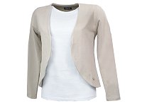 Volnočasová vesta - sako s dlouhým rukávem v barvě bílé kávy. Materiál - nepočesaná teplákovina. Délka 57 cm. Pereme v pračce na 30°. 92% bavlna 8% elastan