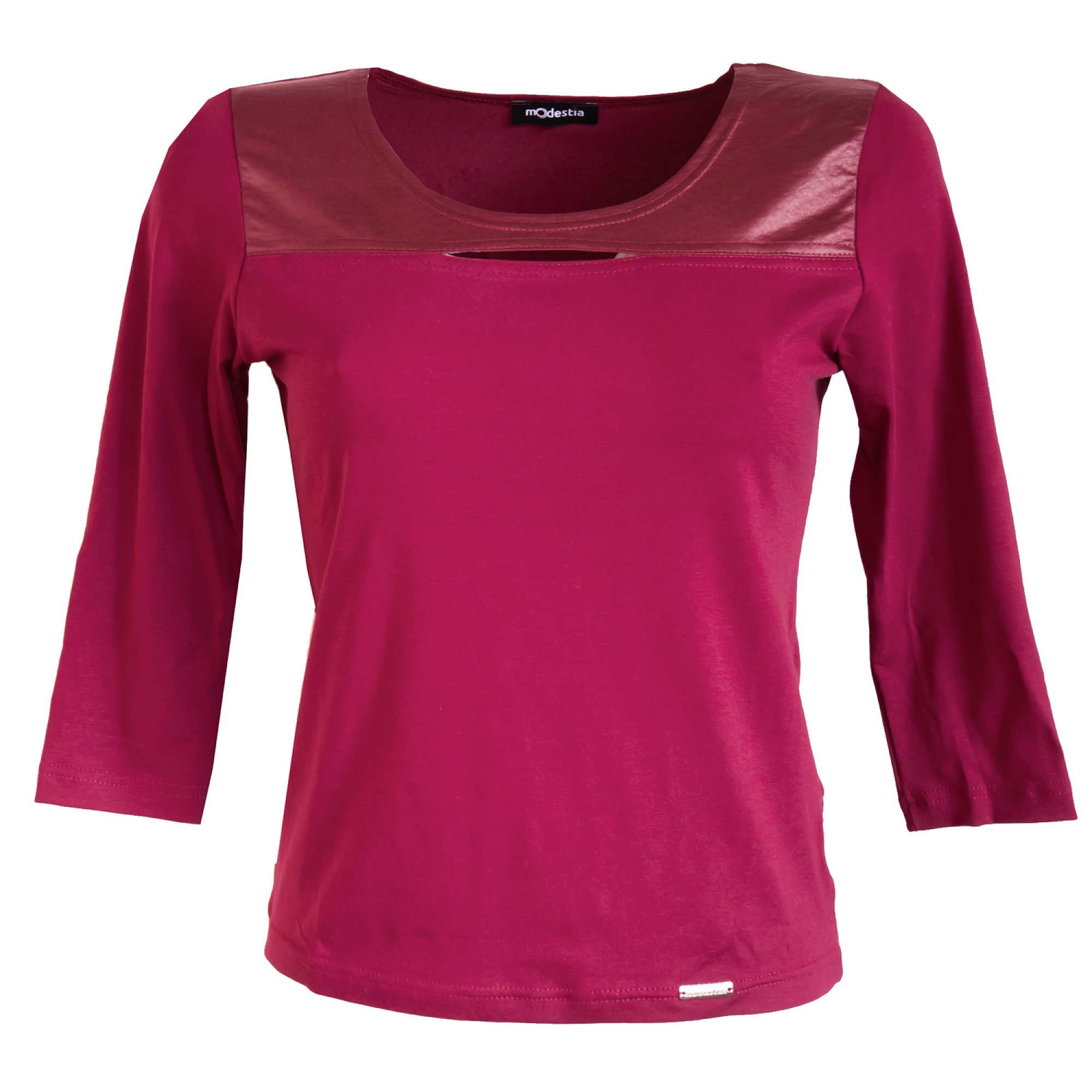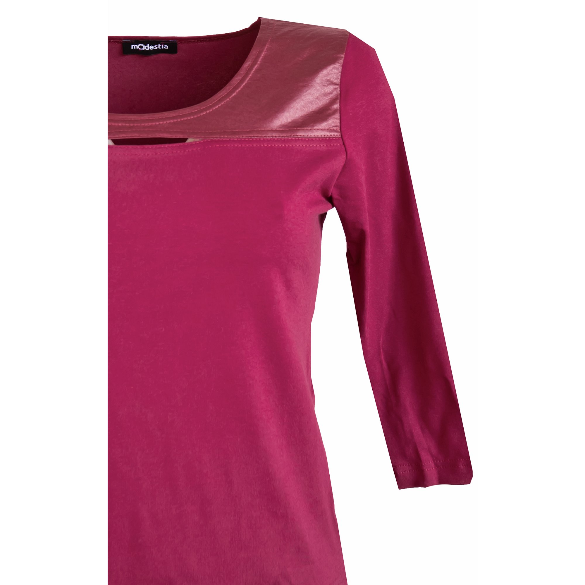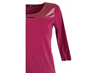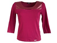 Halenka v módní vínové barvě s 3/4 rukávem a zajímavě řešeným sedlem z vínové imitace kůže s prostřihem na prsou. Materiál: 95% viskóza 5 % elastan