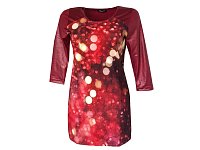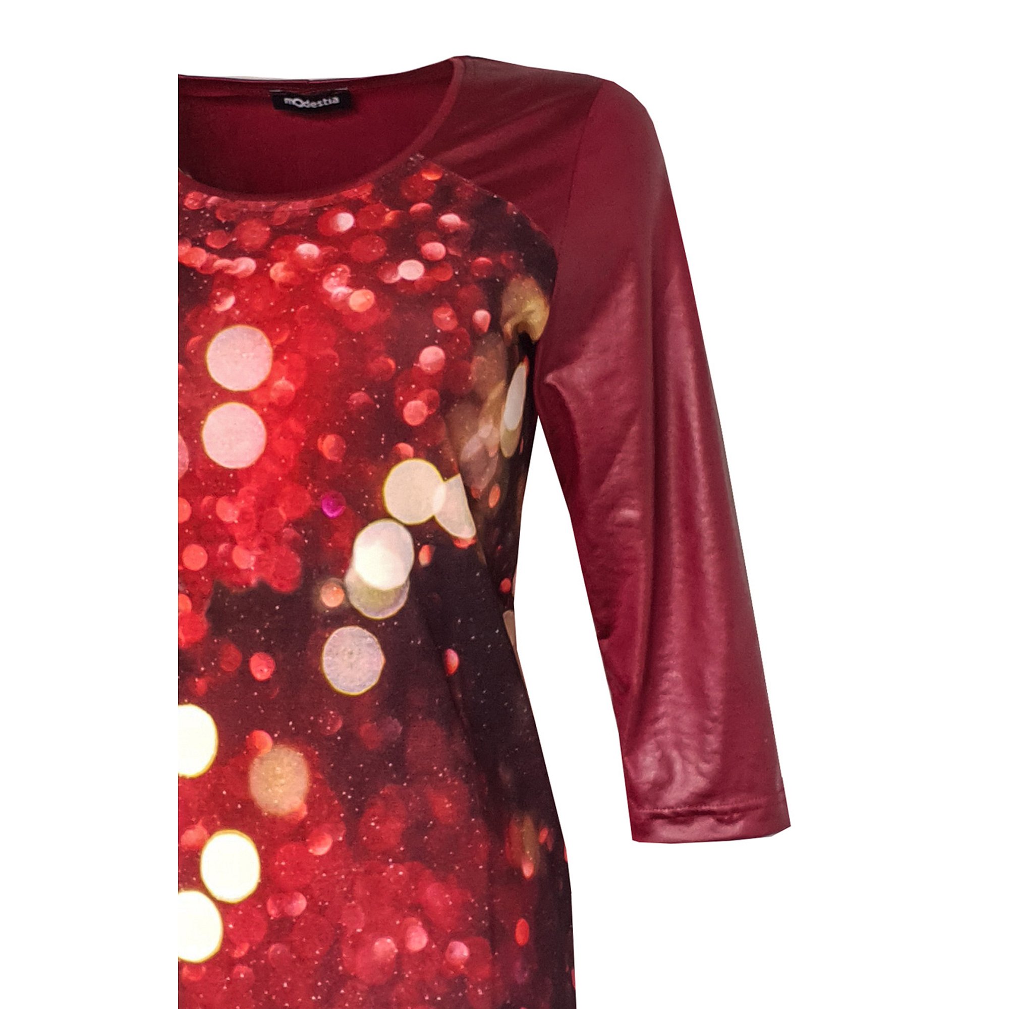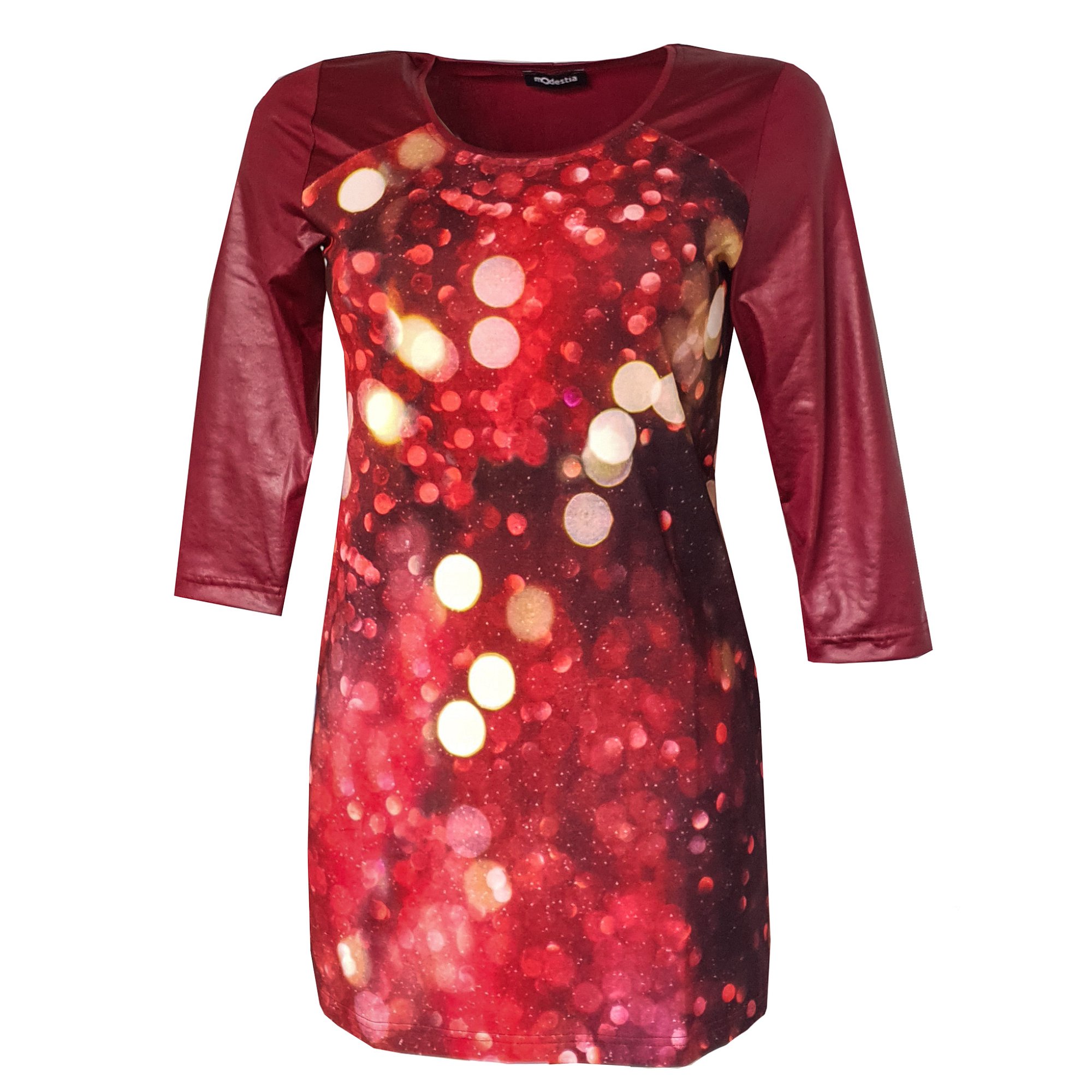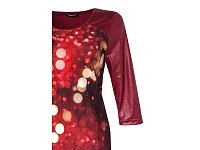 Tunika s tiskem v červeno vínové barvě s 3/4 rukávem. Rukávy a sedla jsou v téže barvě z imitace kůže. Celková délka - 77 cm. Pereme v pračce na 30°. Materiál: 74% polyester 21% viskóza 5% elastan
