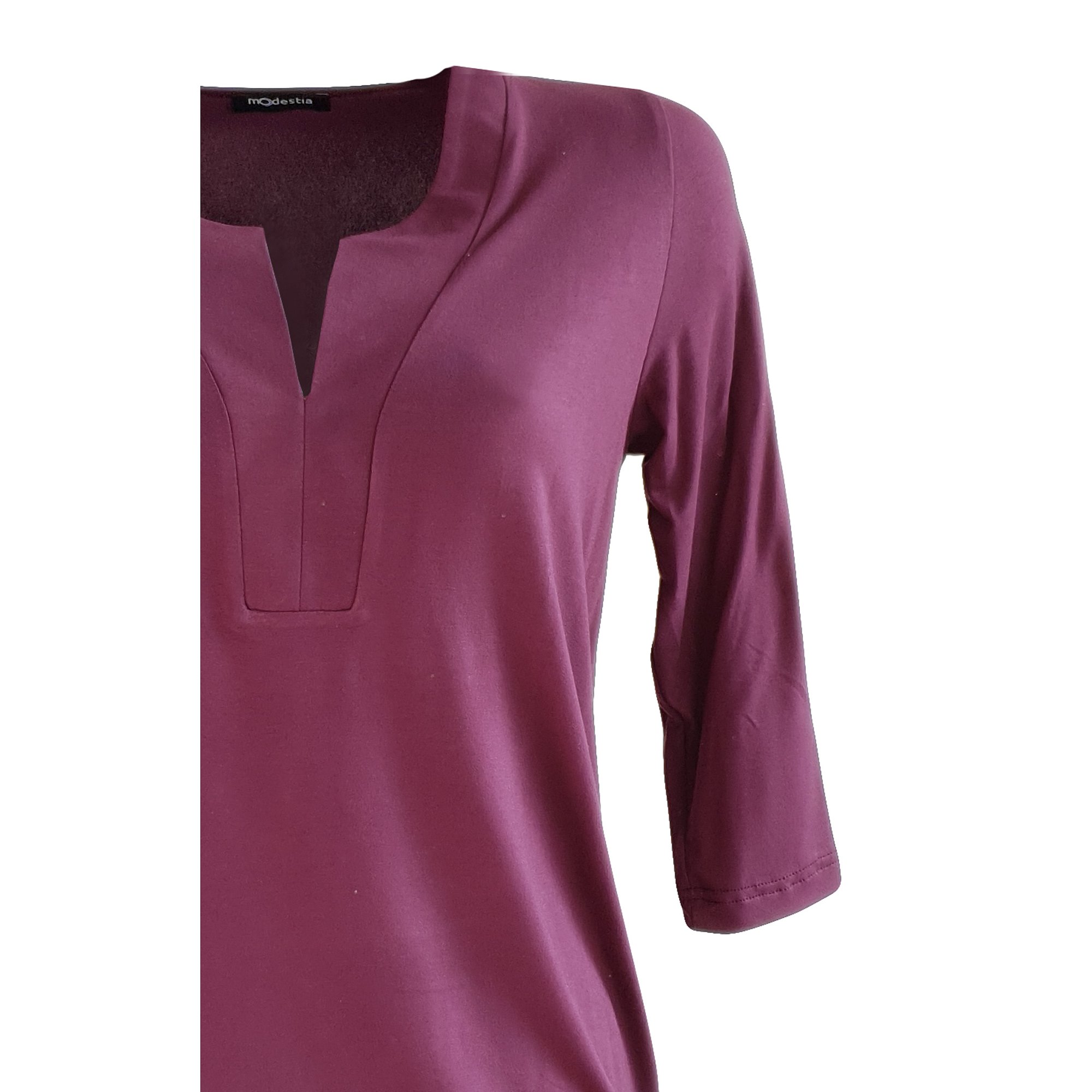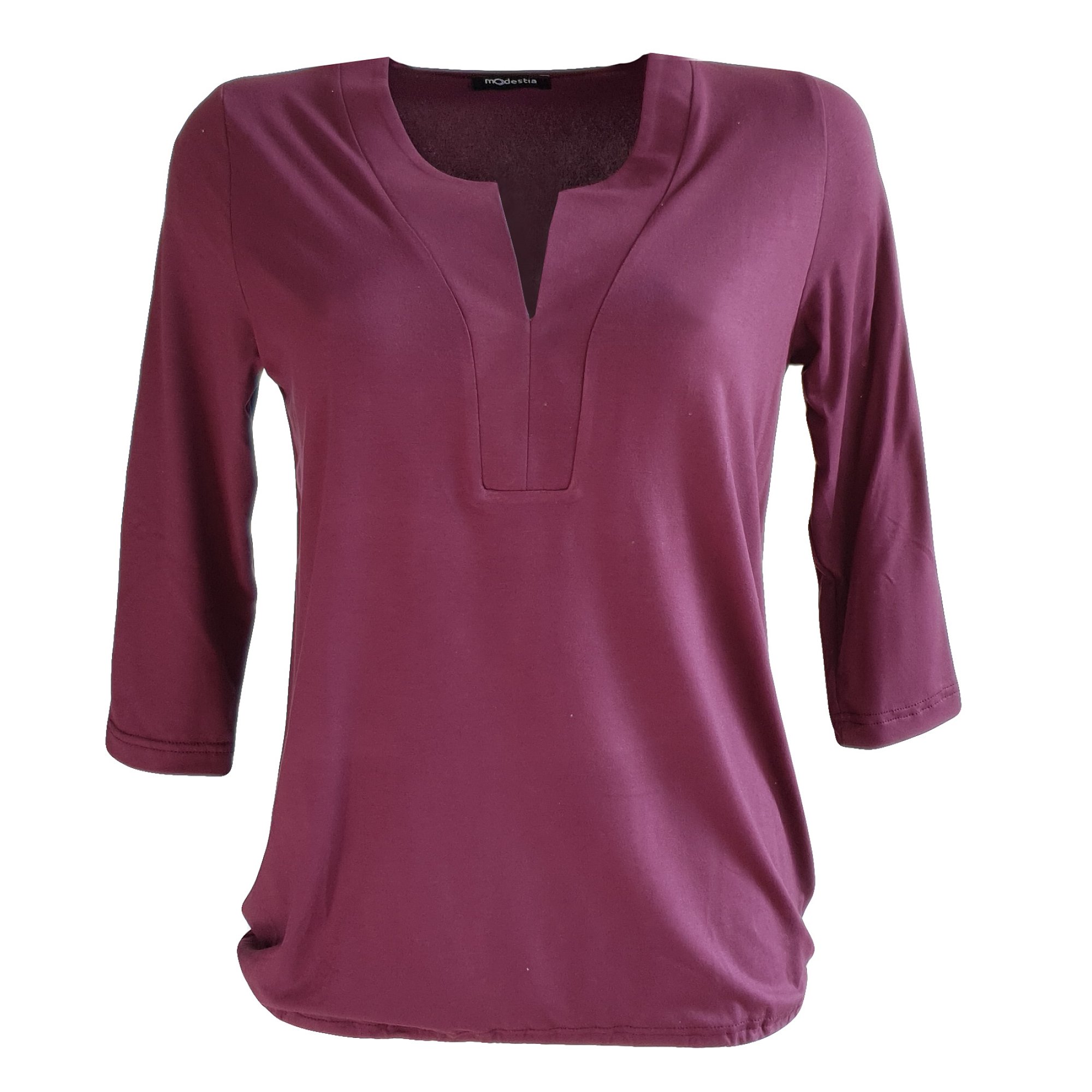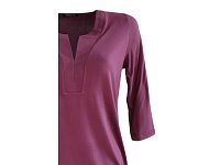Dámská halenka volnějšího střihu s kulatým výstřihem s prostřihem v krásné vínové barvě. Spodní lem nabraný do gumičky. Pereme v pračce na 30°. Materiál: 95% viskóza 5% elastan