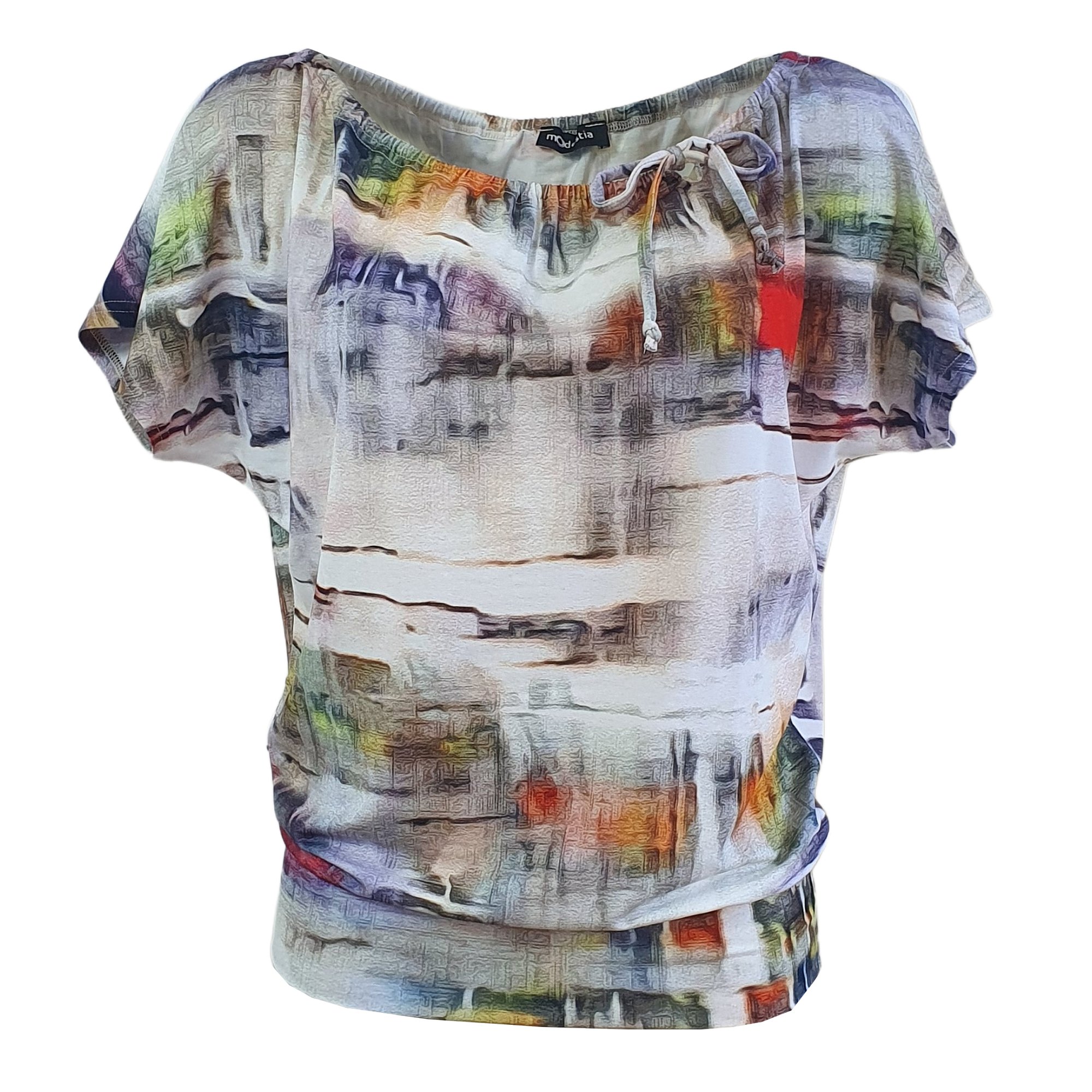 Volná barevná halenka, ve výstřihu stažená do šňůrky. Na spodní části dvojitý lem. Spadlý volný rukáv. 95% viskóza 5% elastan