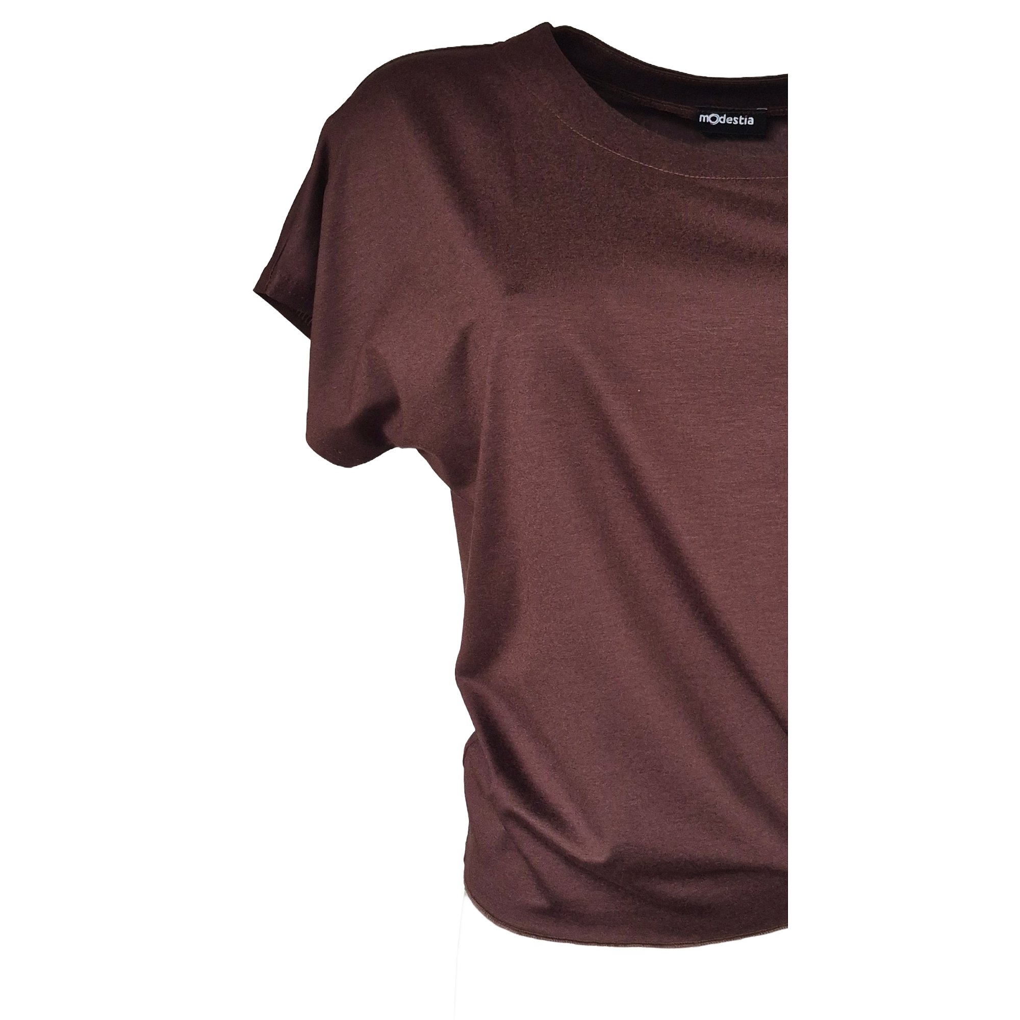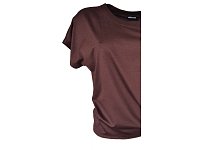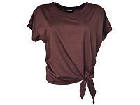 Pohodlné tričko s krátkým rukávem v hnědé barvě.Volný střih s efektním zavazováním na boku. Materiál: 95% viskóza, 5% elastan.