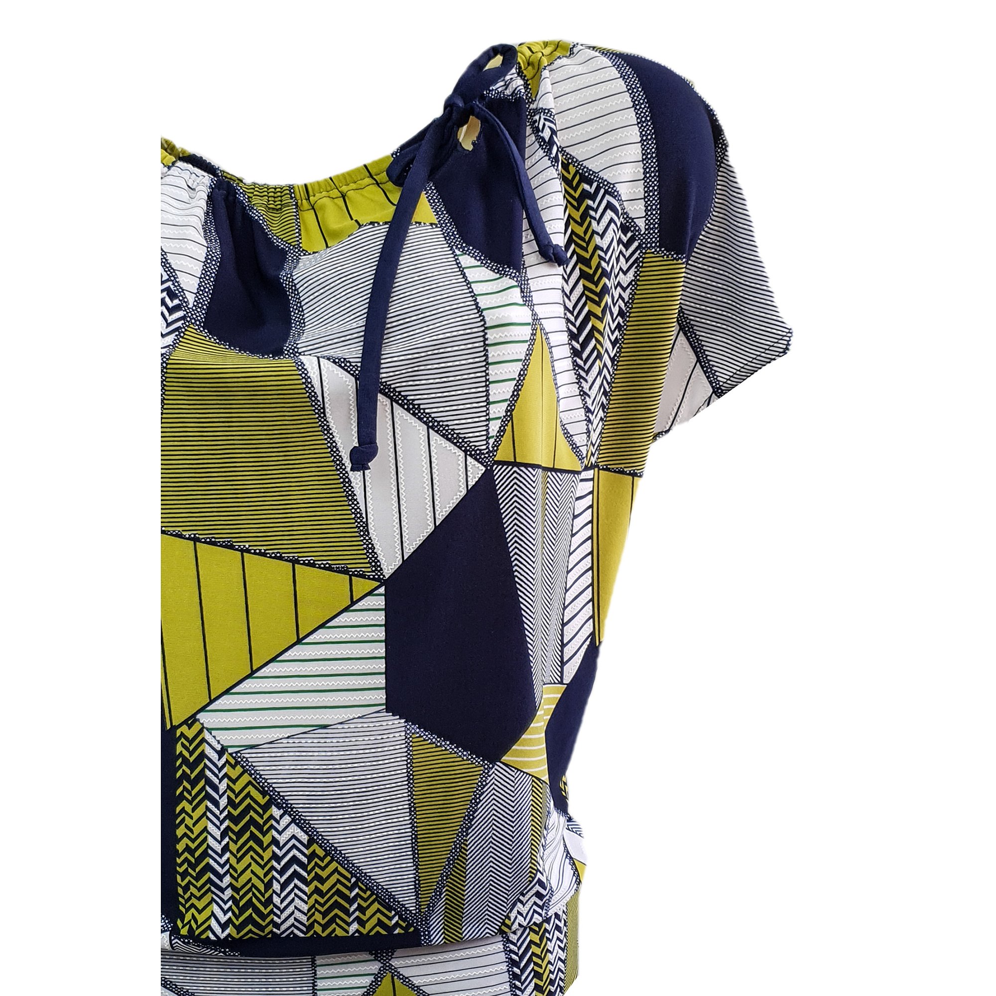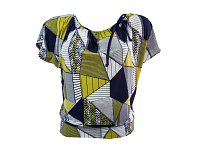 Volná bílá halenka s modro zeleným tiskem, ve výstřihu stažená šňůrkou. Na spodní části dvojitý lem. Spadlý volný rukáv. 95% polyester 5% elastan